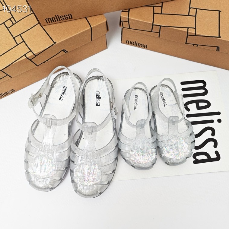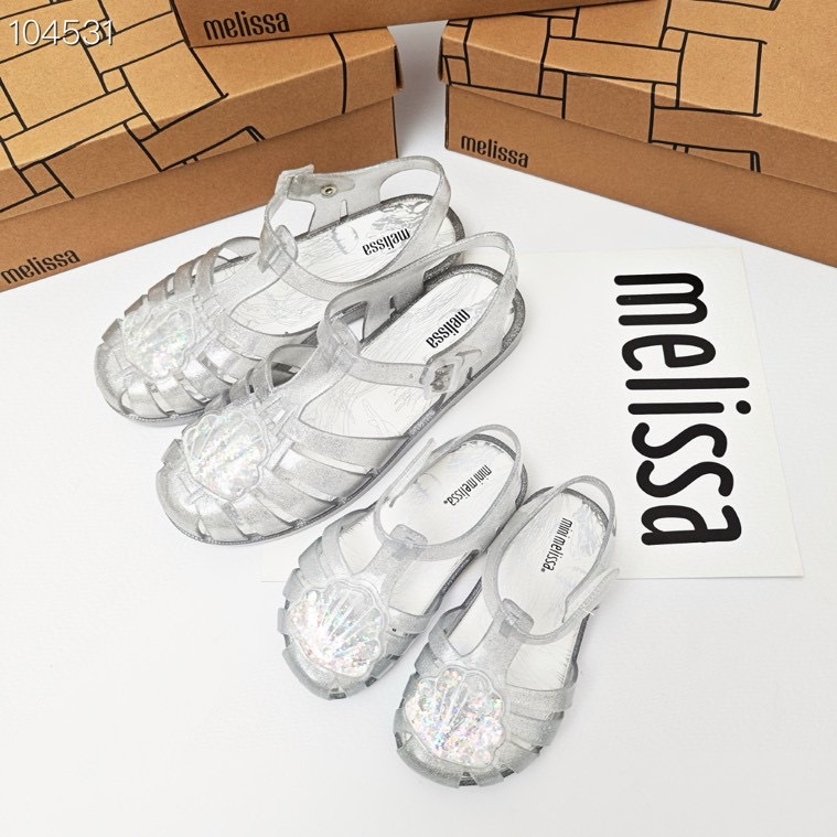2025 새로운 멜리사 중간 어린이 신발 투명 쉘 반짝 이는 해변 신발 로마 샌들 향기로운 어린이 신발스토어 가기