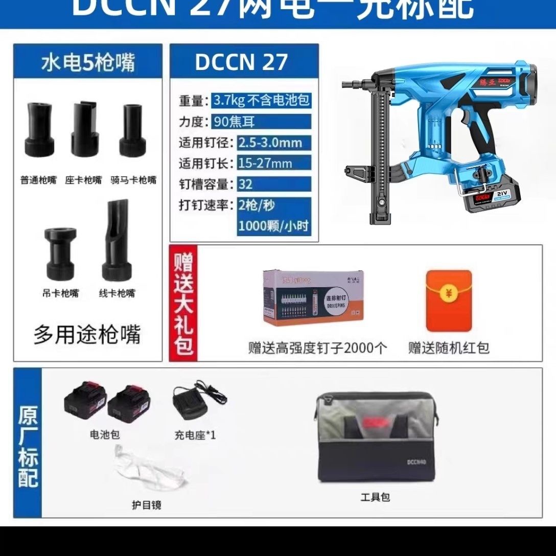 • 40A 리튬 강철 네일 건 5개 헤드에는 배터리 2개, 충전기 1개 + 못 2,000개가 기본으로 제공됩니다.