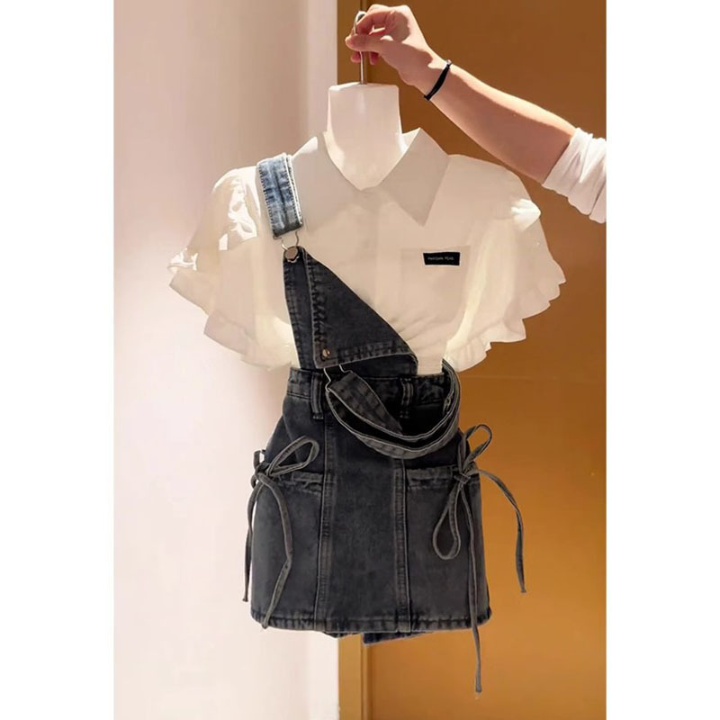 Pure Lust Hot Girl Suit 여성 2025 여름 반팔 셔츠 탑 하이 웨이스트 데님 서스펜더 스커트 투피스 세트