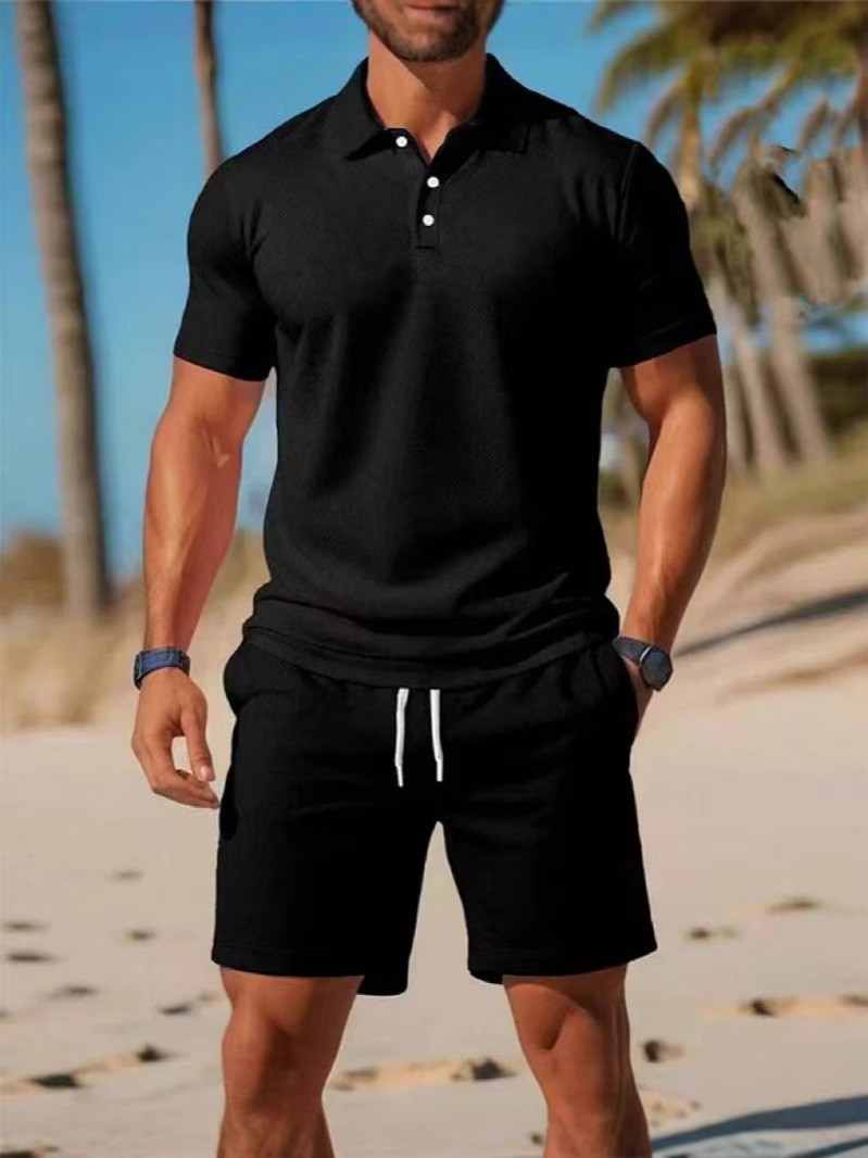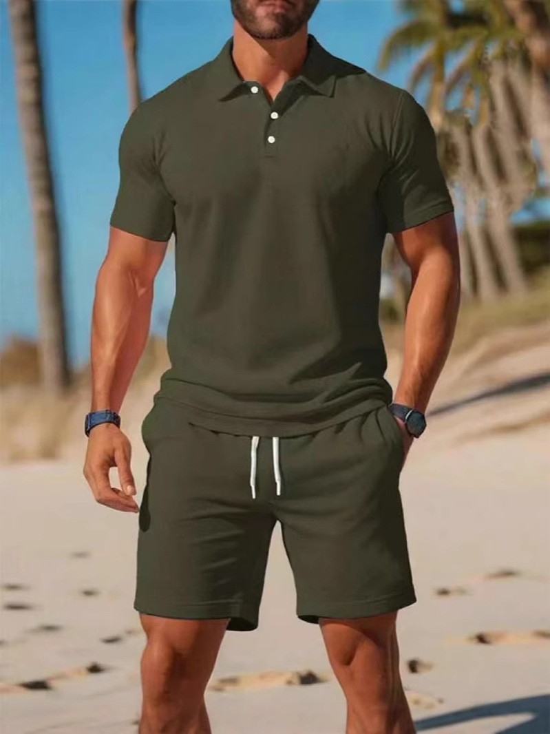 여름 남성 반팔 + 바지 정장 티셔츠 셔츠 솔리드 컬러 캐주얼 정장 스포츠 정장 반팔 티셔츠 셔츠 도매스토어 가기