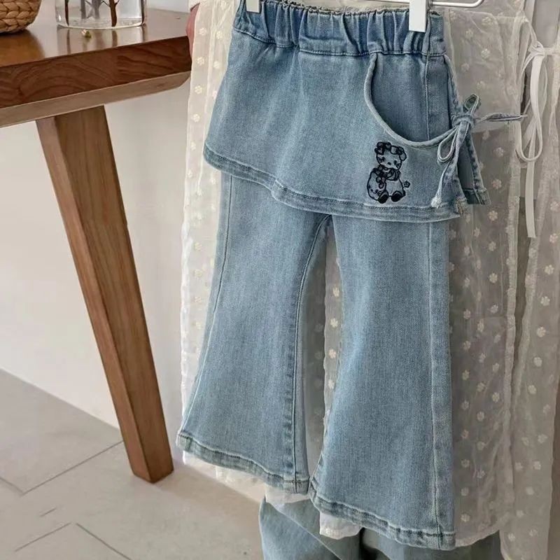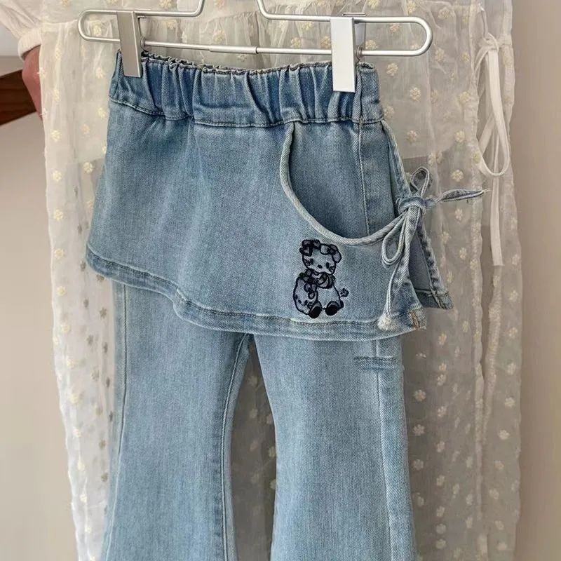 한국 스타일 아동복, 여아 봄 바지, 새로운 스타일, 패셔너블한 아동용 블루 퍼프 천 청바지, 여아용