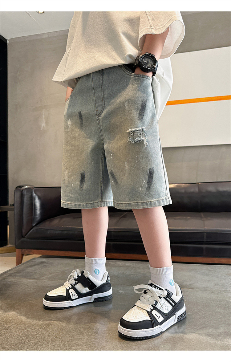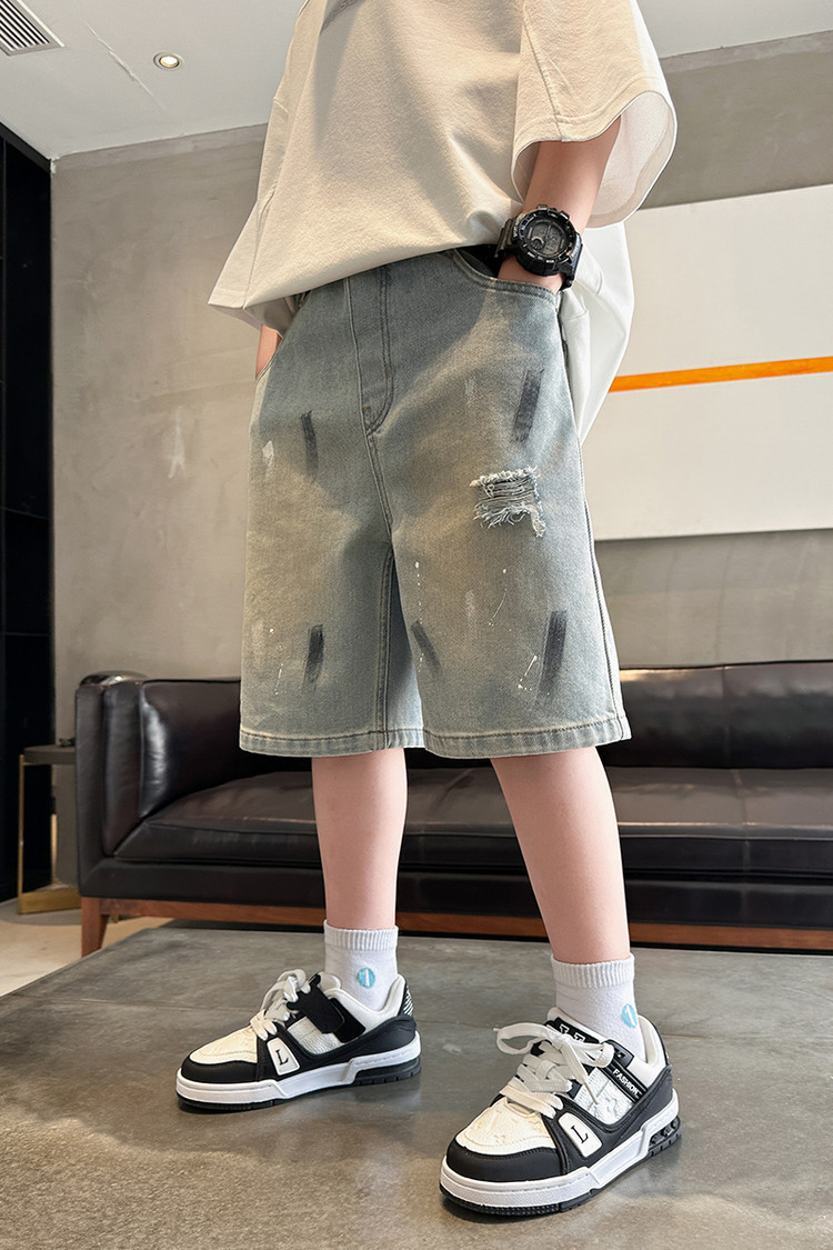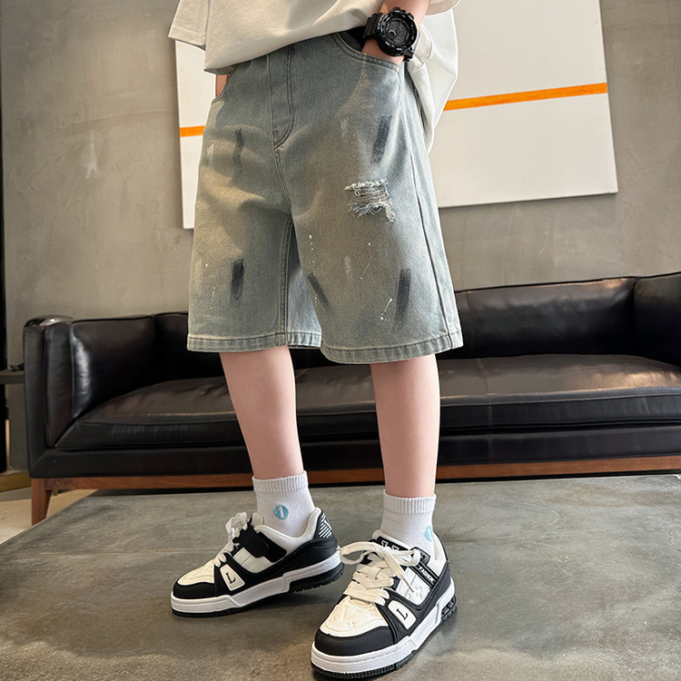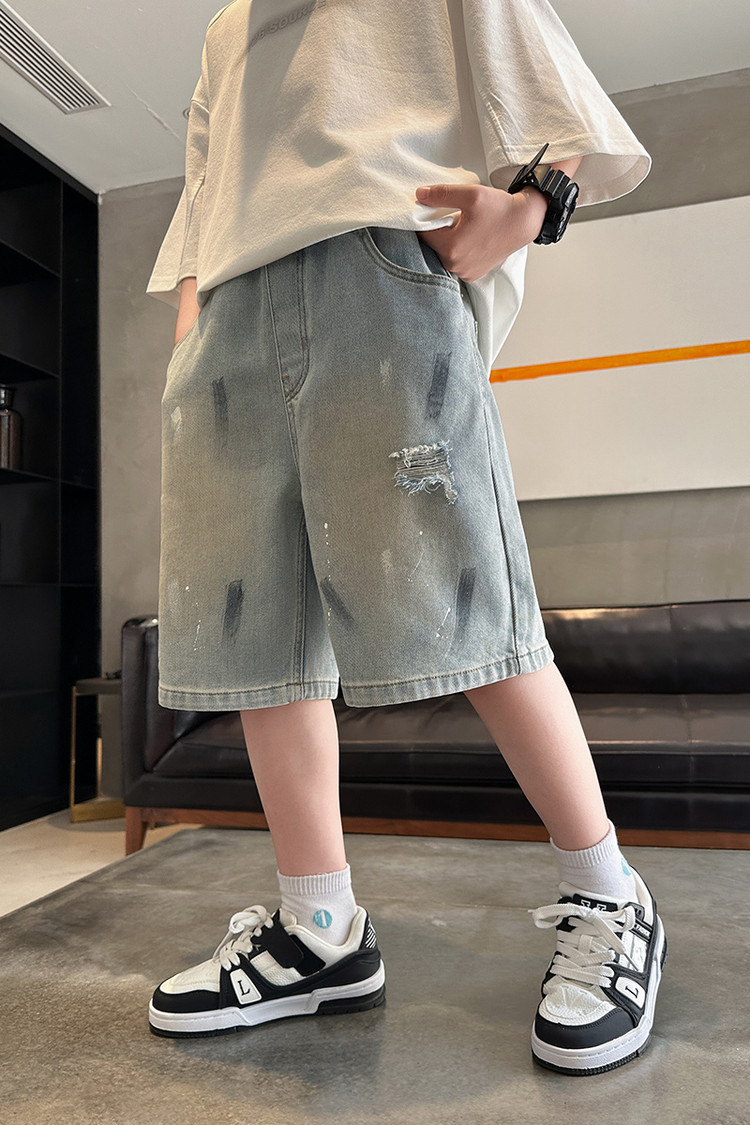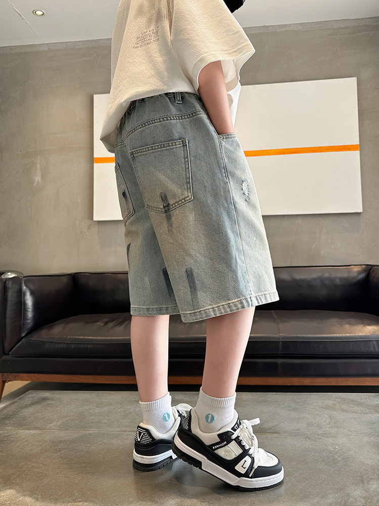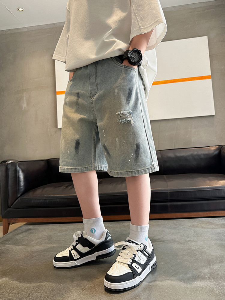 대외 무역 소년 여름 데님 반바지 찢어진 패셔너블한 큰 어린이 트렌디하고 멋진 5부 바지 소년의 멋진 캐주얼 중간 바지