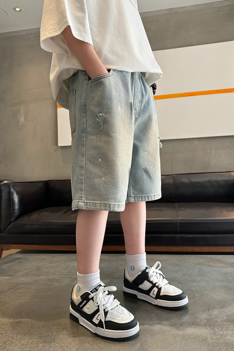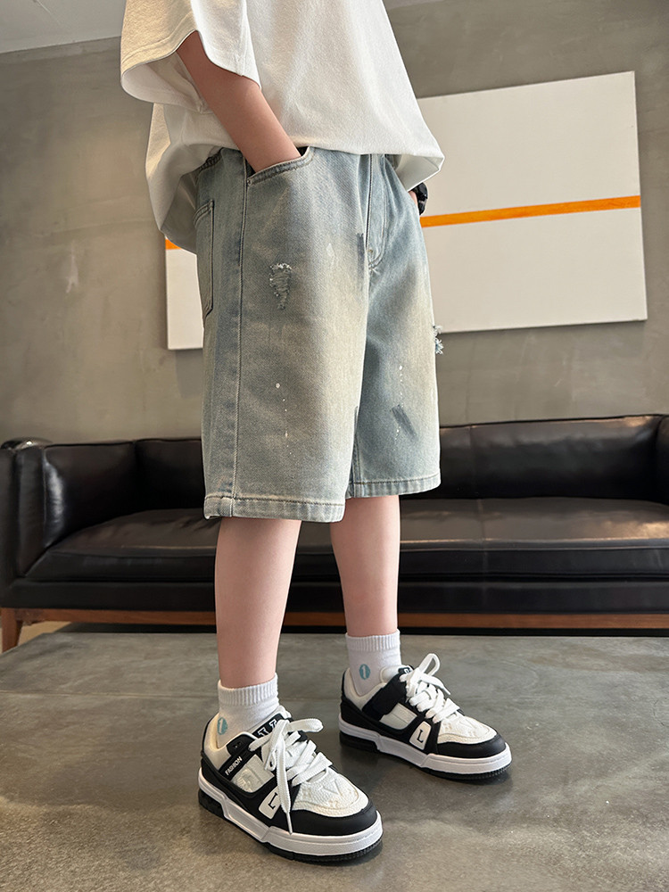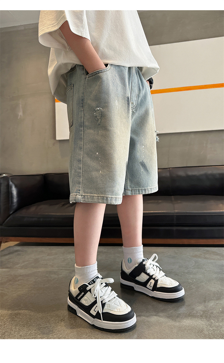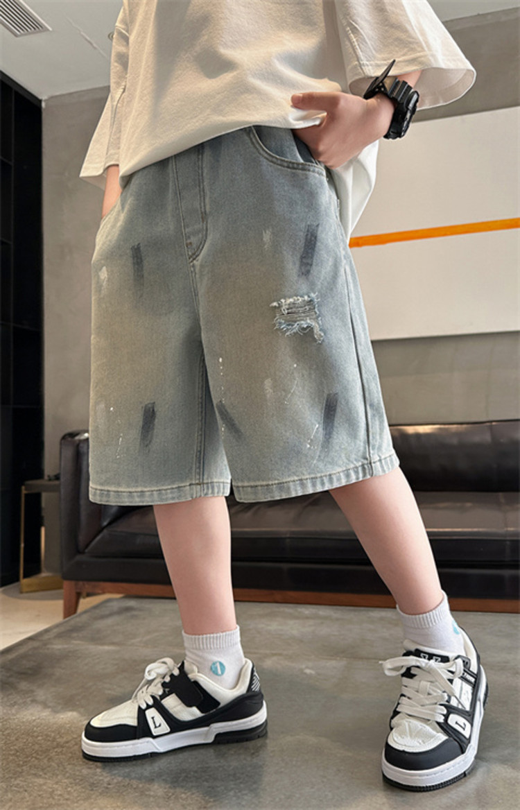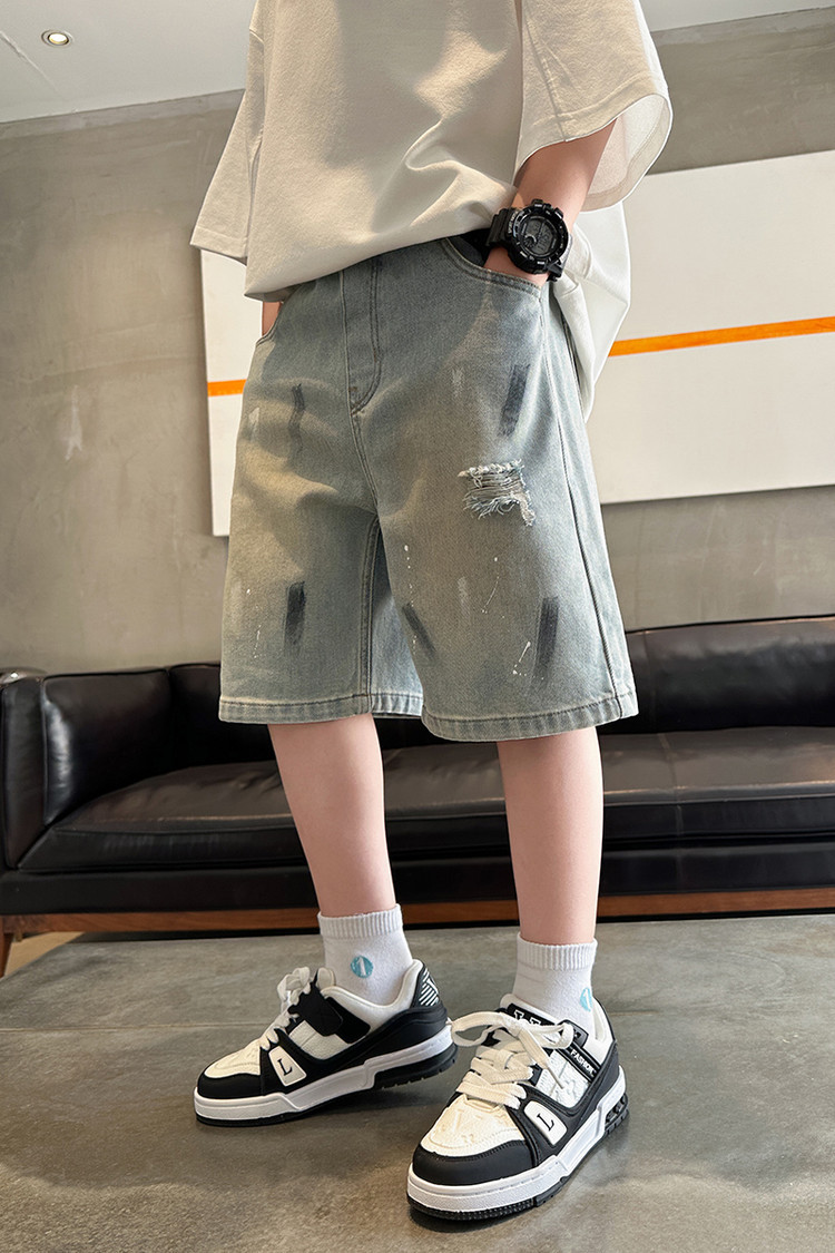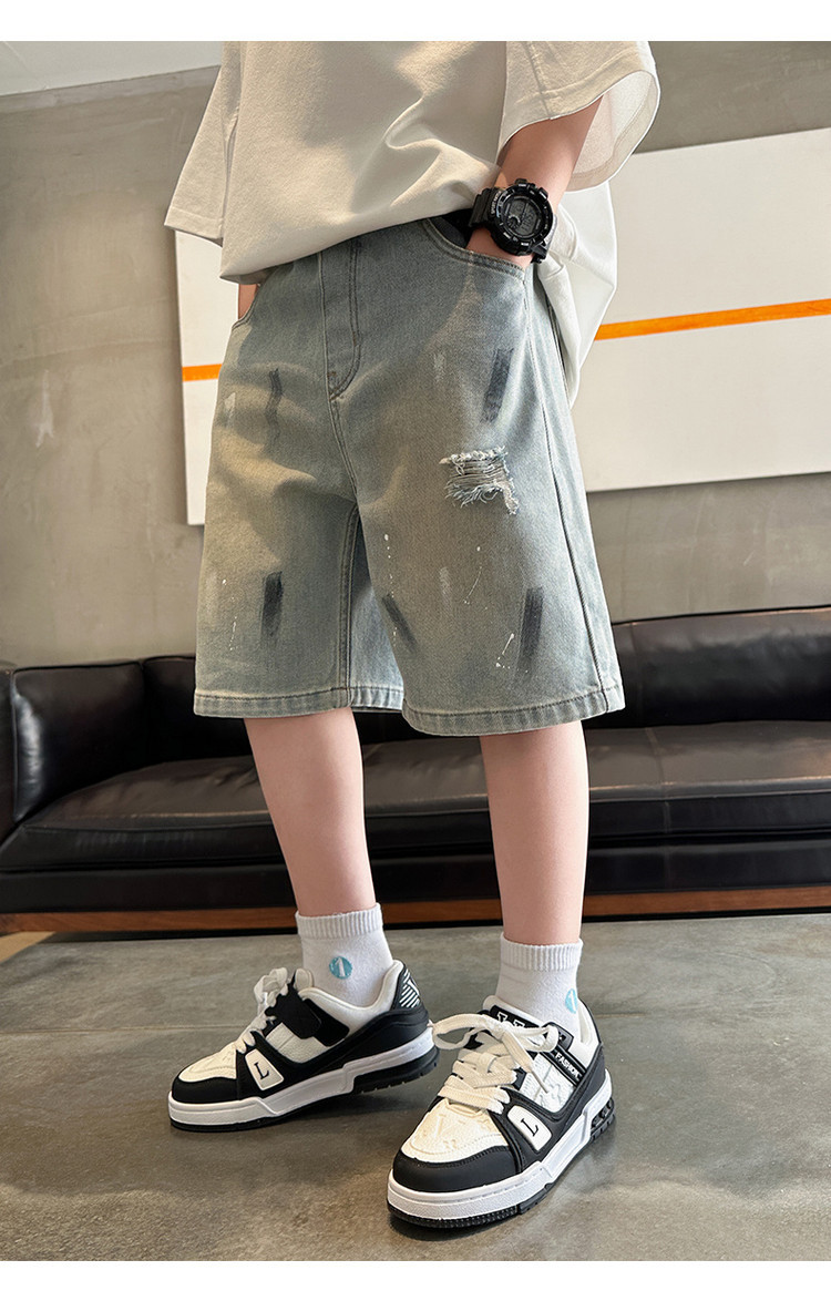 대외 무역 소년 여름 데님 반바지 찢어진 패셔너블한 큰 어린이 트렌디하고 멋진 5부 바지 소년의 멋진 캐주얼 중간 바지