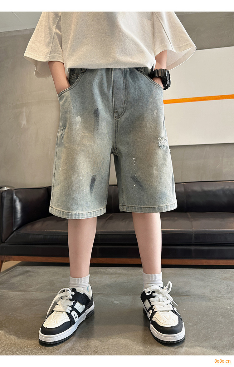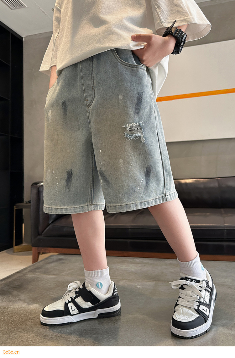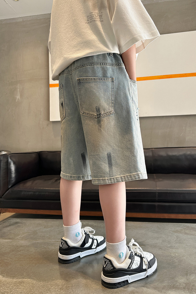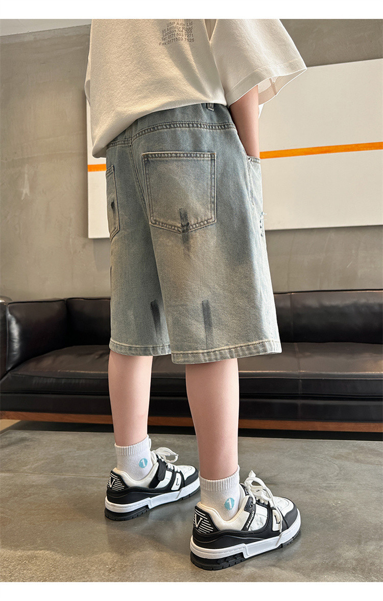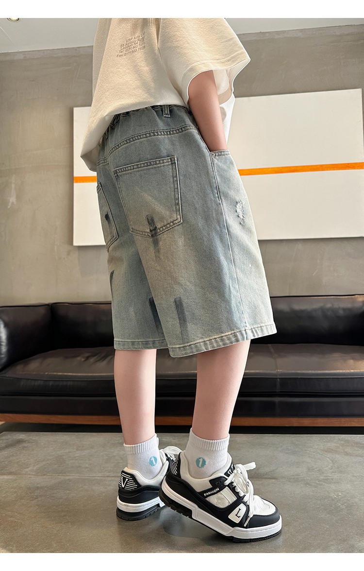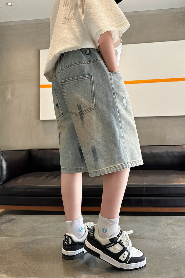 대외 무역 소년 여름 데님 반바지 찢어진 패셔너블한 큰 어린이 트렌디하고 멋진 5부 바지 소년의 멋진 캐주얼 중간 바지