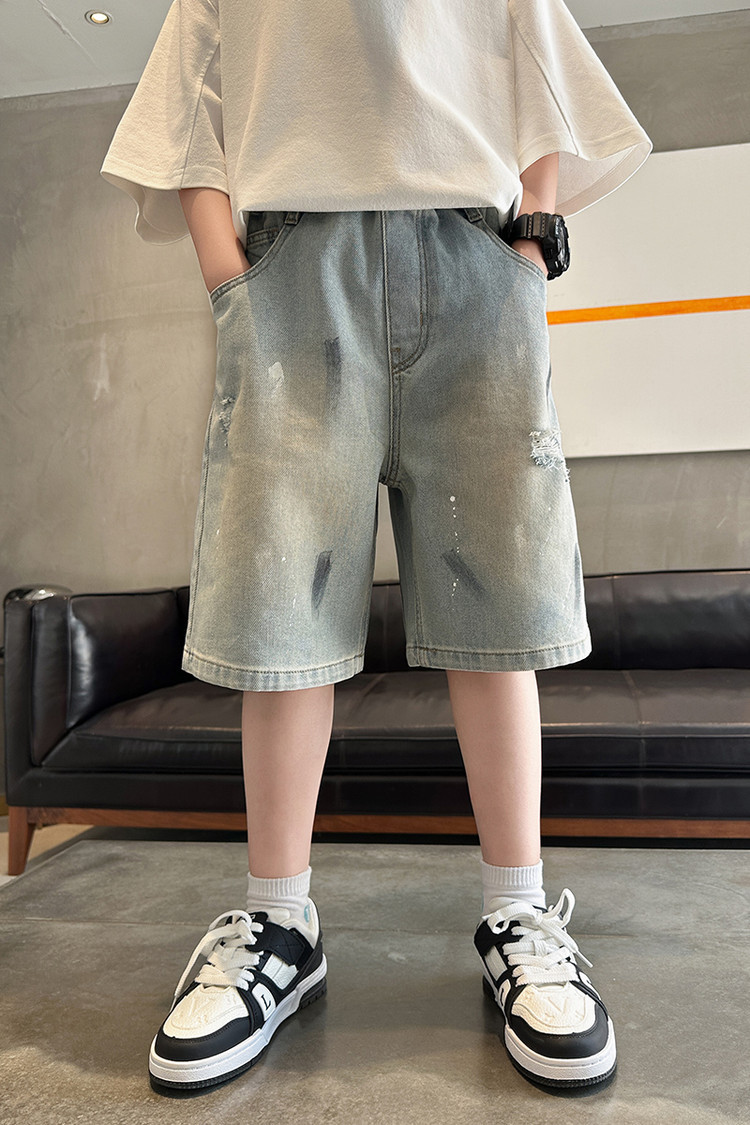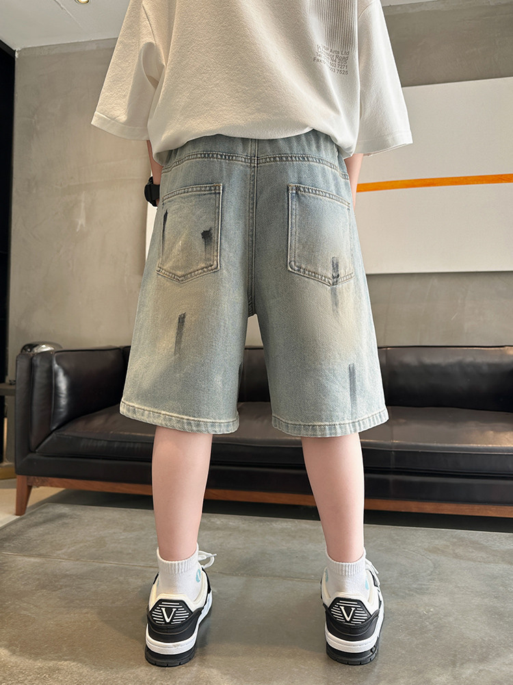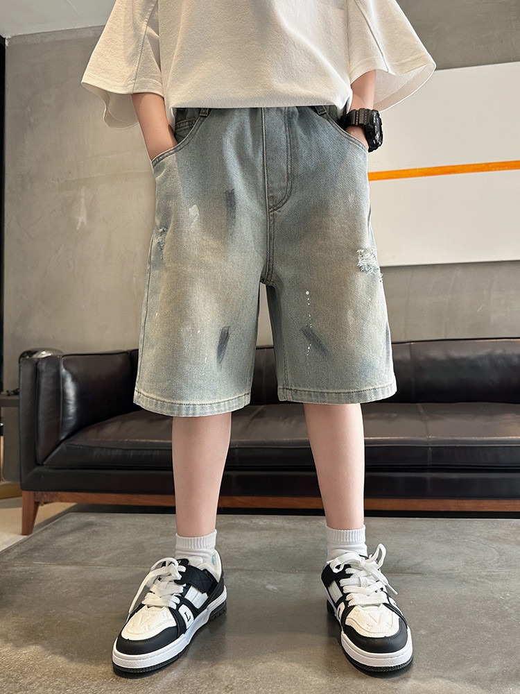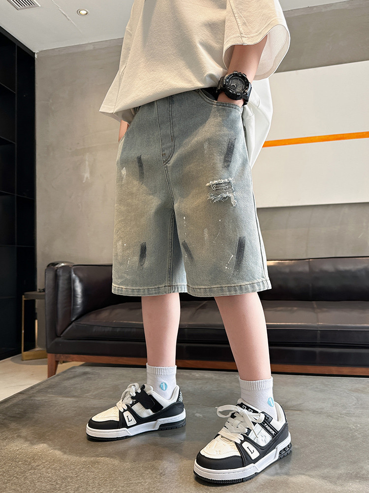 대외 무역 소년 여름 데님 반바지 찢어진 패셔너블한 큰 어린이 트렌디하고 멋진 5부 바지 소년의 멋진 캐주얼 중간 바지스토어 가기