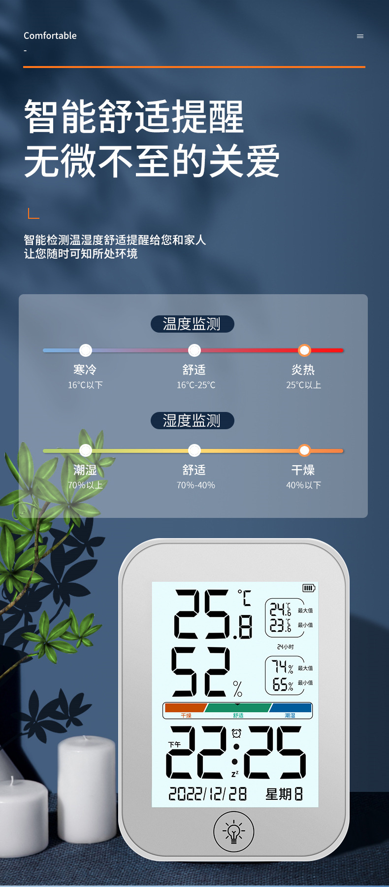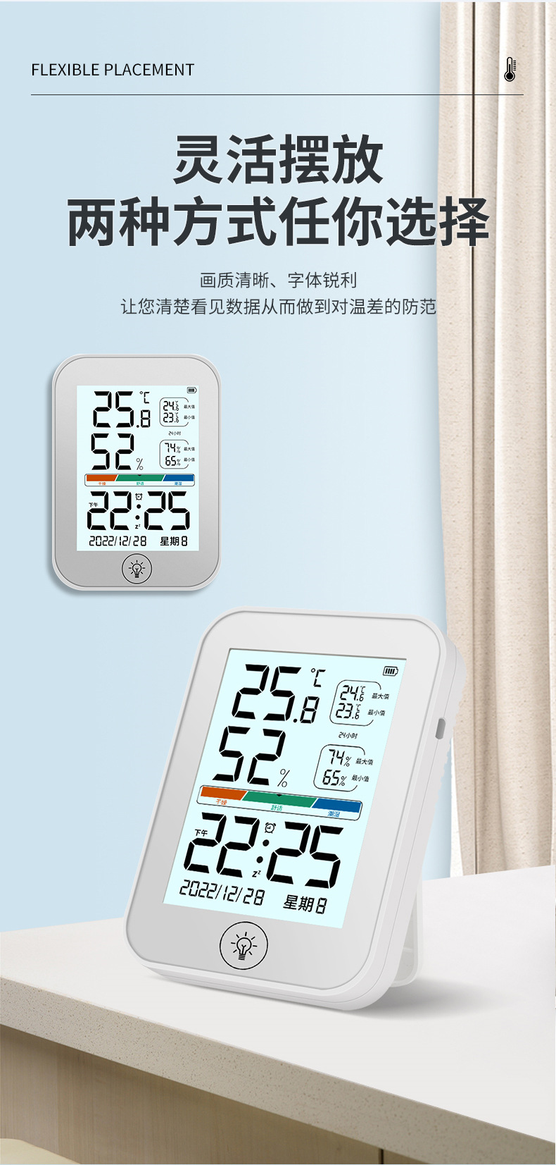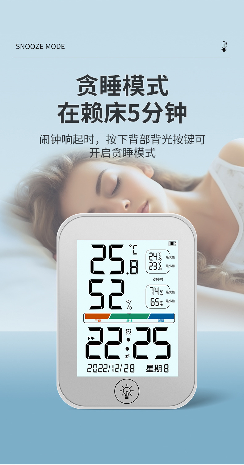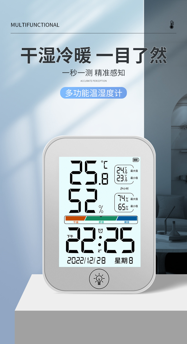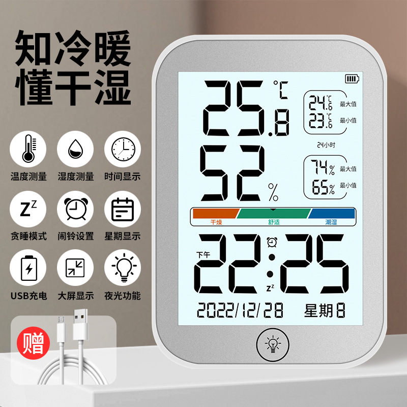 새로운 컬러 스크린 온도 및 습도 측정기는 걸고 세울 수 있으며, 알람 시계가 있는 고화질 대형 스크린 온도계는 다기능 온도 및 습도 측정을 정확하게 측정합니다.스토어 가기