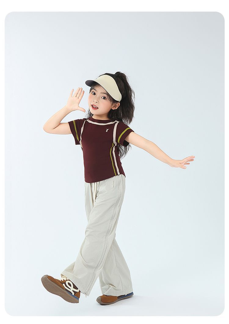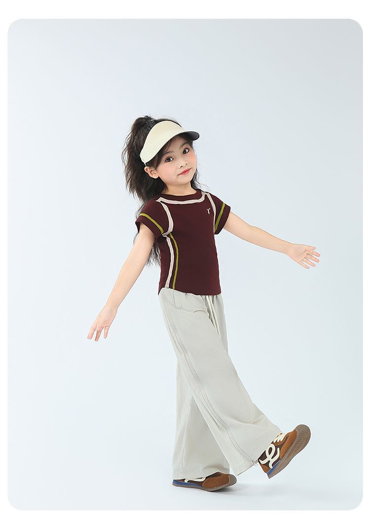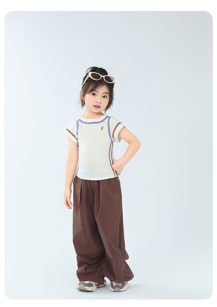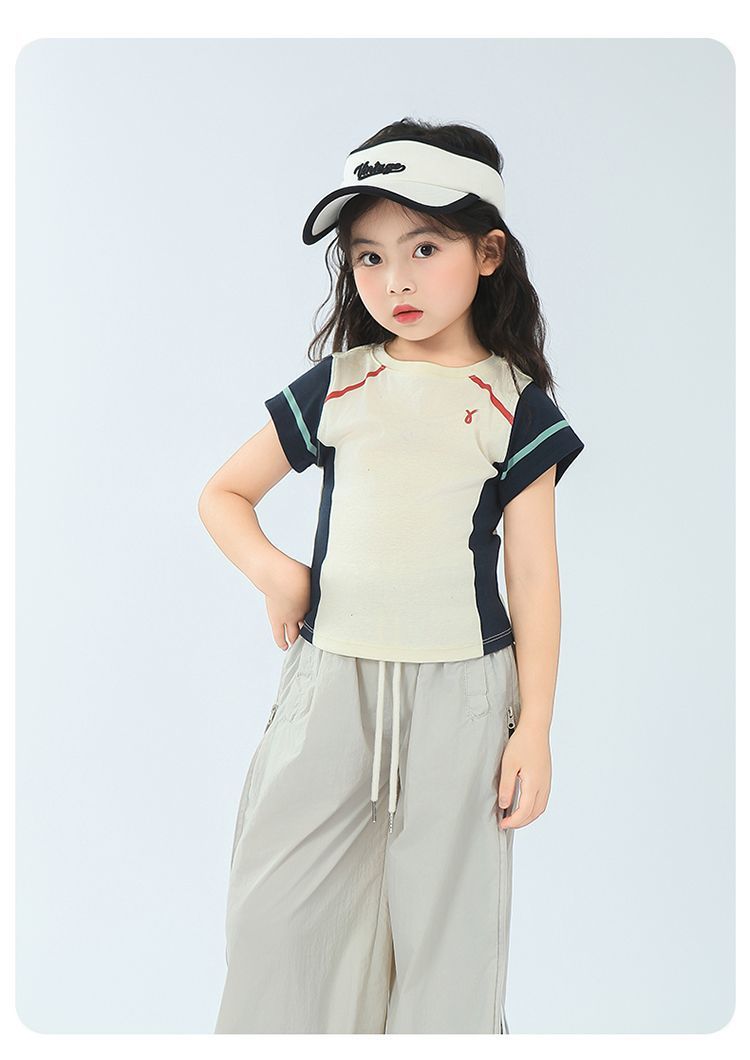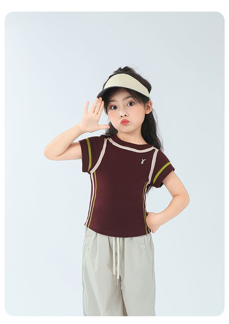 아동용 2025 봄 여름 티셔츠 레트로 코튼 탑 소녀 허리 골지 대비 색상 반팔 라인 여름 스타일