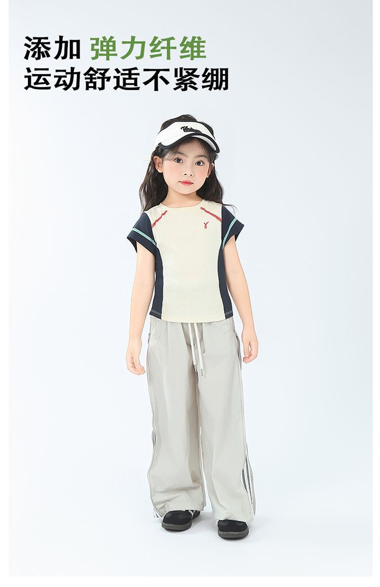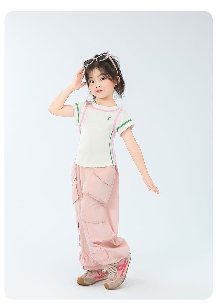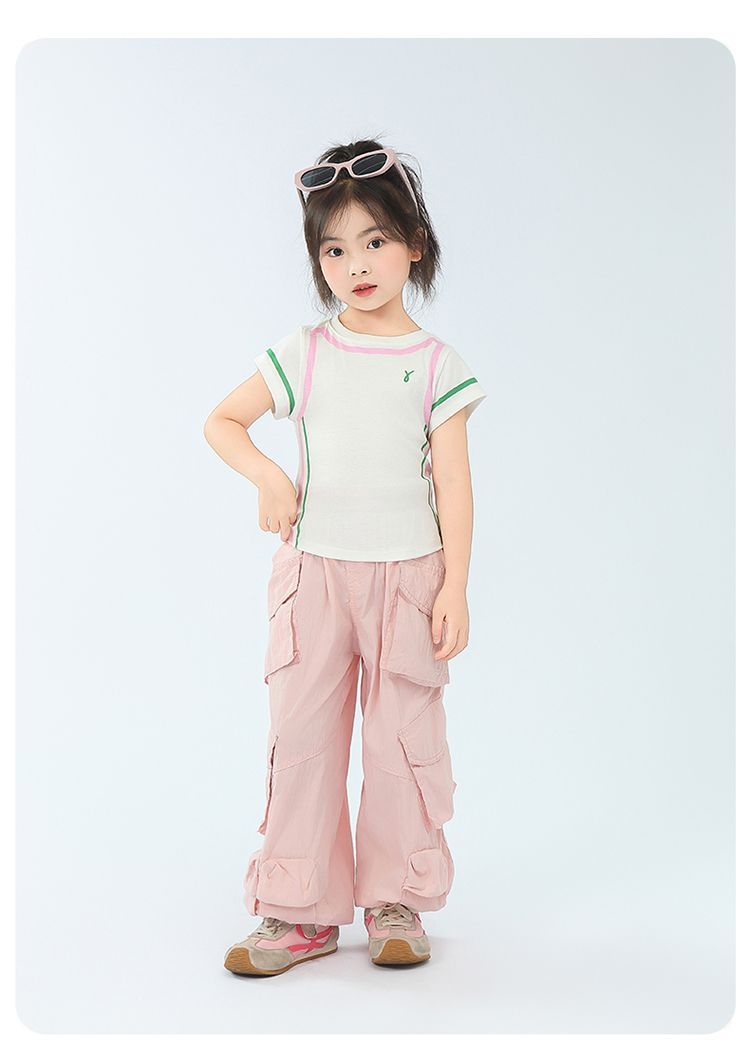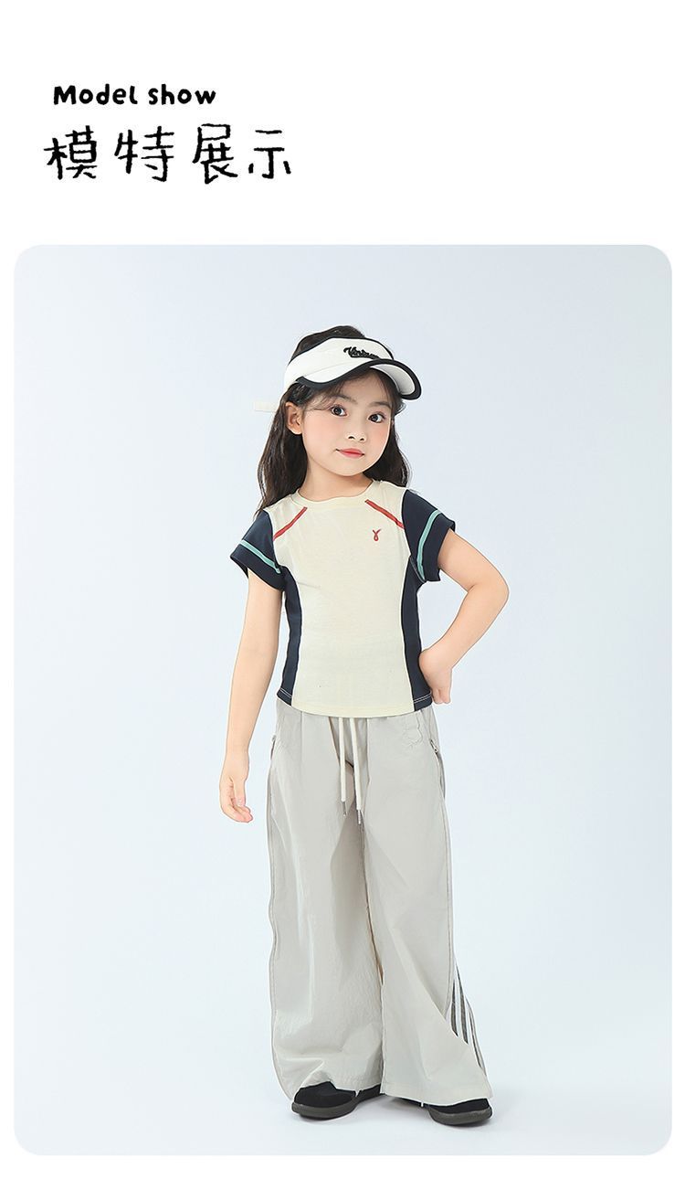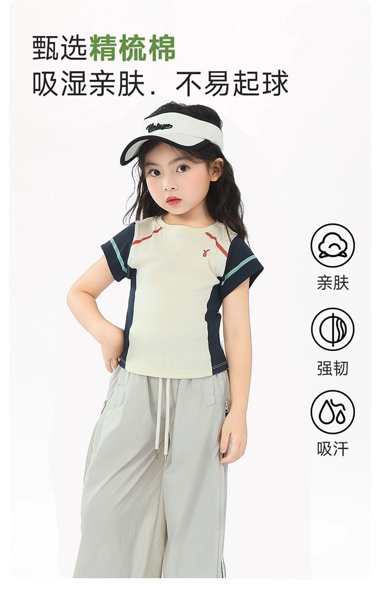 아동용 2025 봄 여름 티셔츠 레트로 코튼 탑 소녀 허리 골지 대비 색상 반팔 라인 여름 스타일