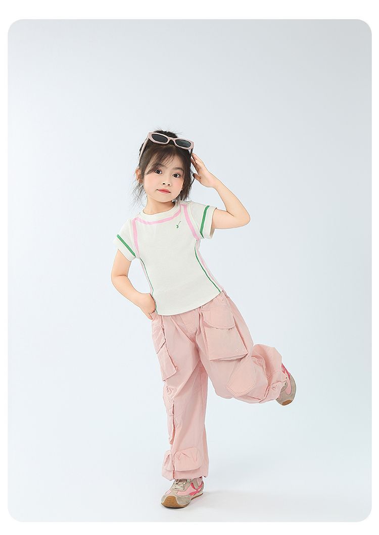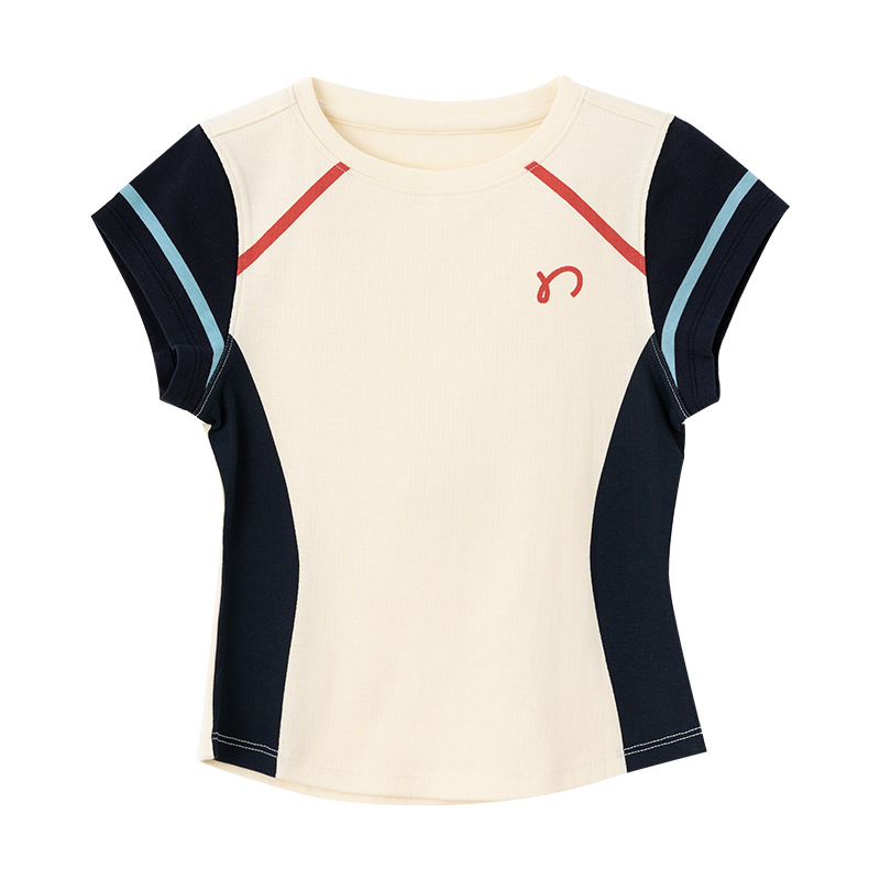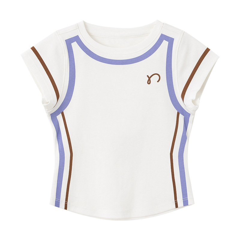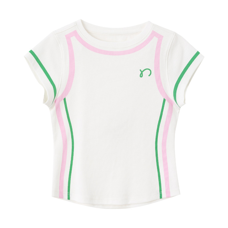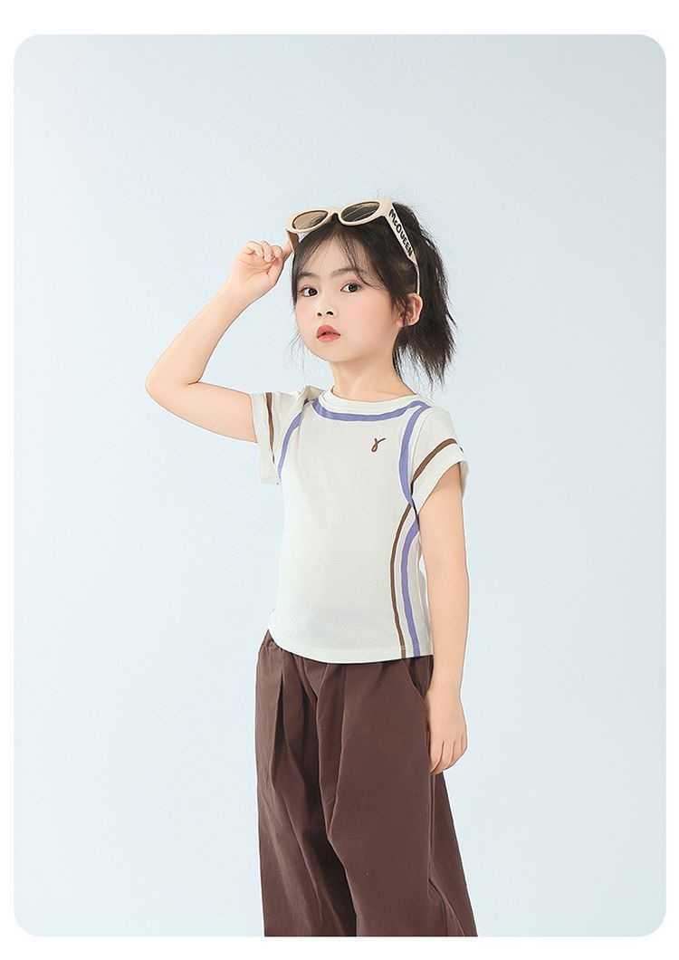 아동용 2025 봄 여름 티셔츠 레트로 코튼 탑 소녀 허리 골지 대비 색상 반팔 라인 여름 스타일스토어 가기
