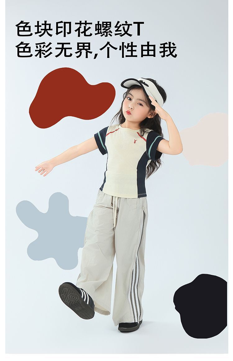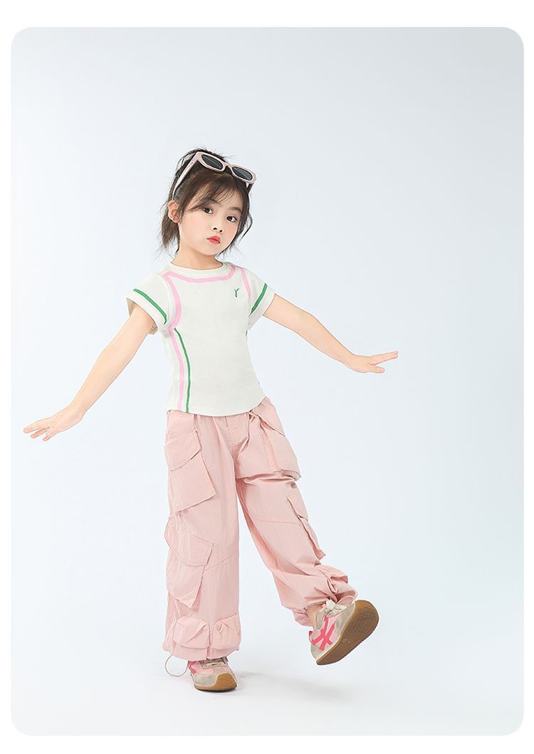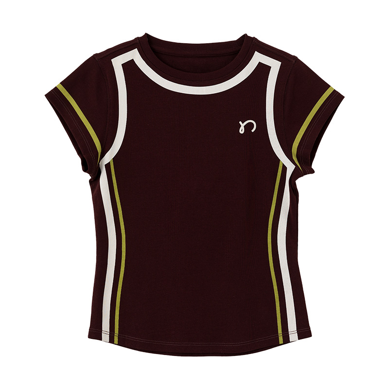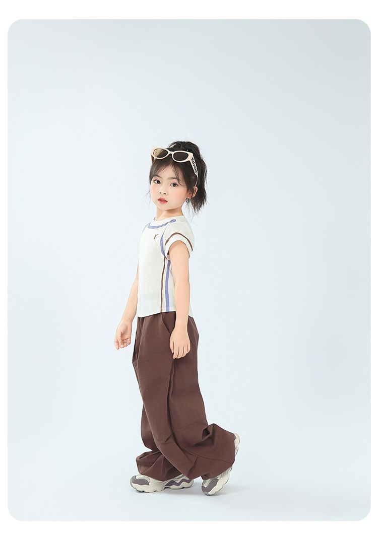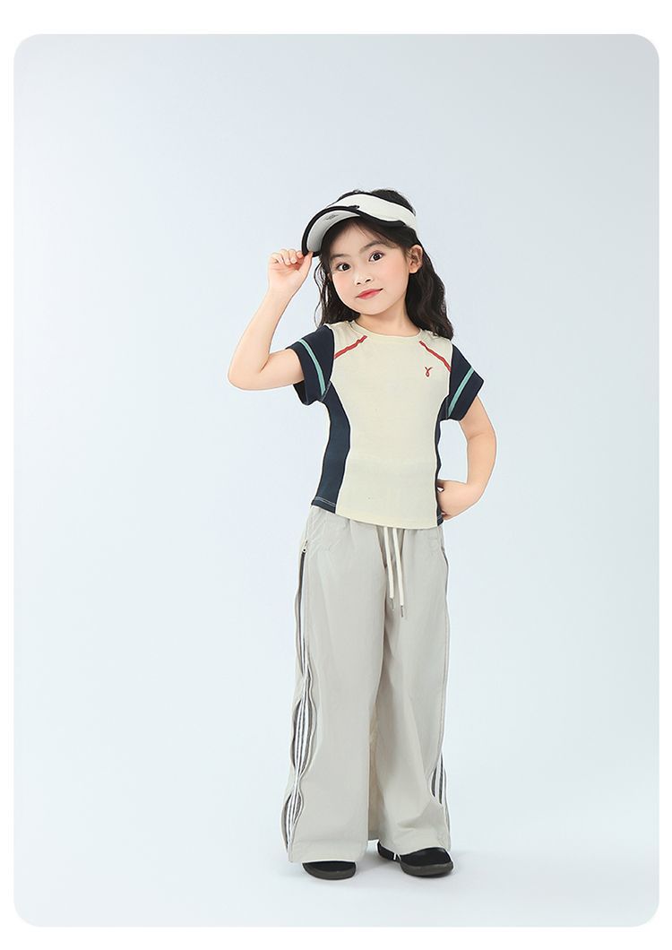 아동용 2025 봄 여름 티셔츠 레트로 코튼 탑 소녀 허리 골지 대비 색상 반팔 라인 여름 스타일스토어 가기