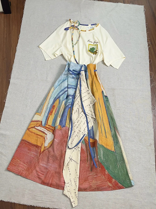 레트로 문학 반팔 티셔츠 탑 불규칙 스커트 여성 여름 반 고흐 유화 스타일 의상 세트