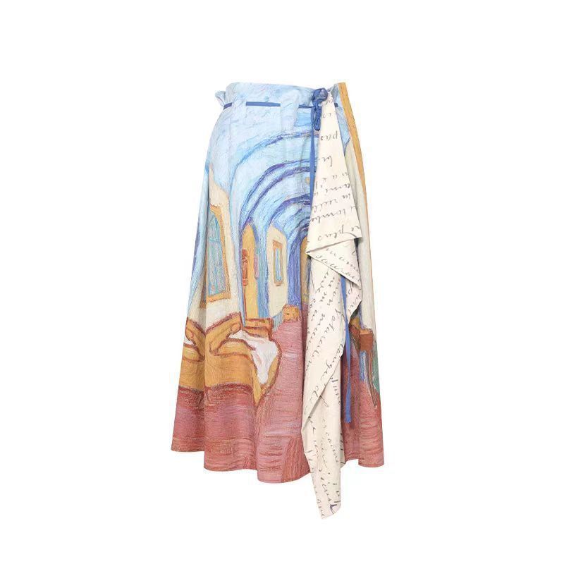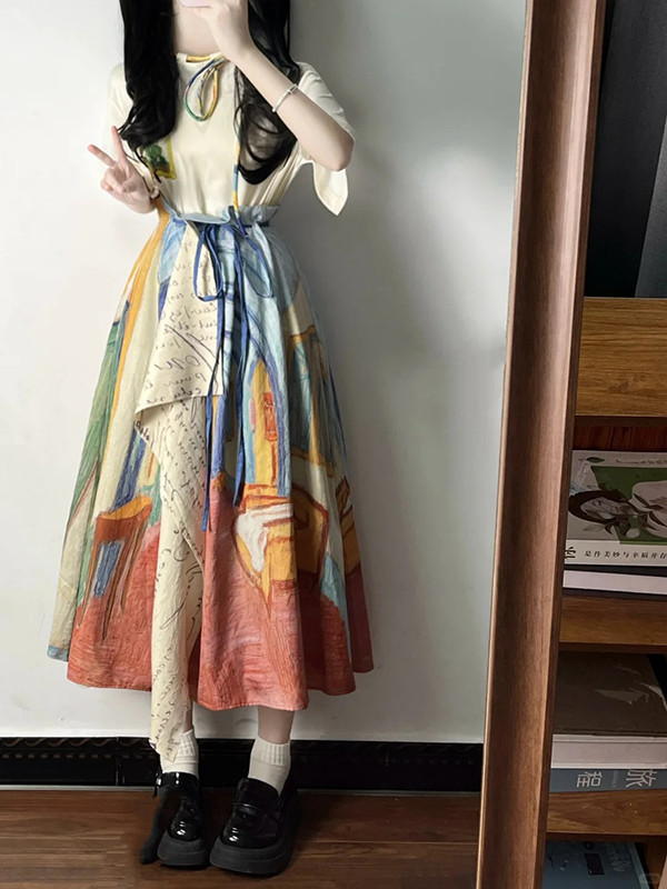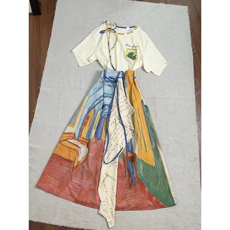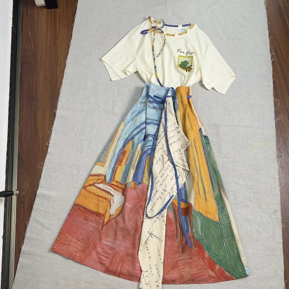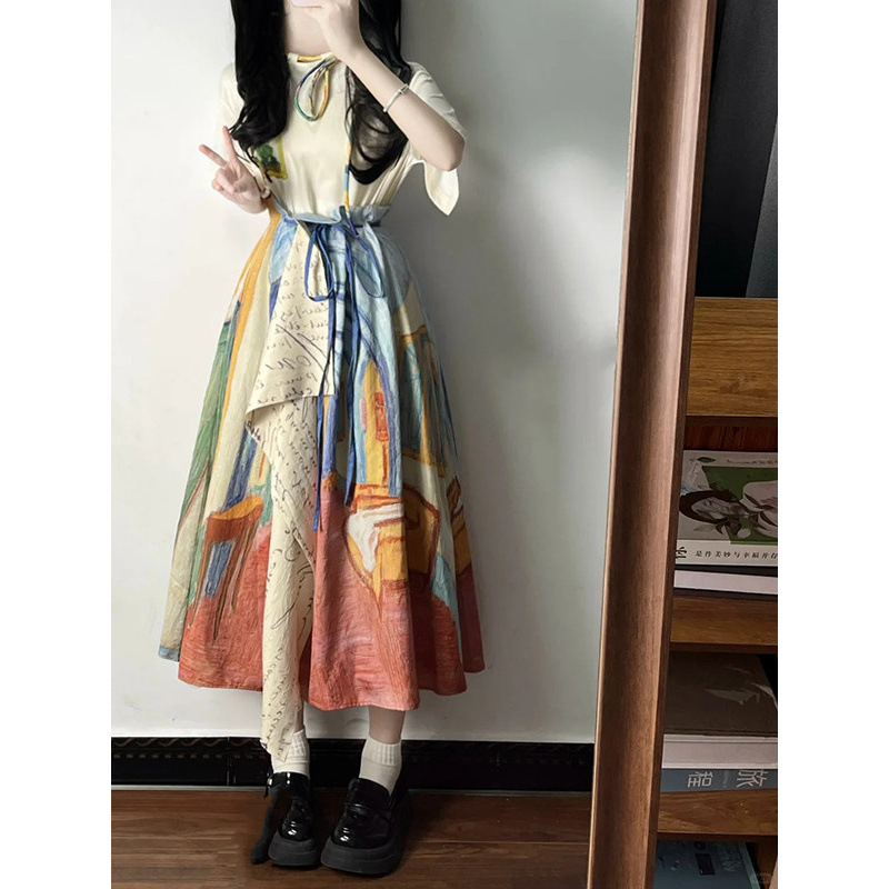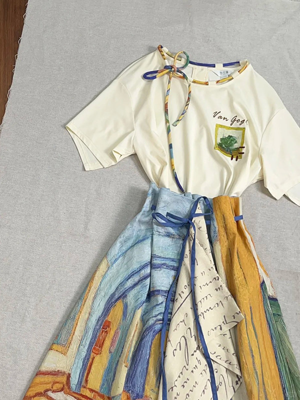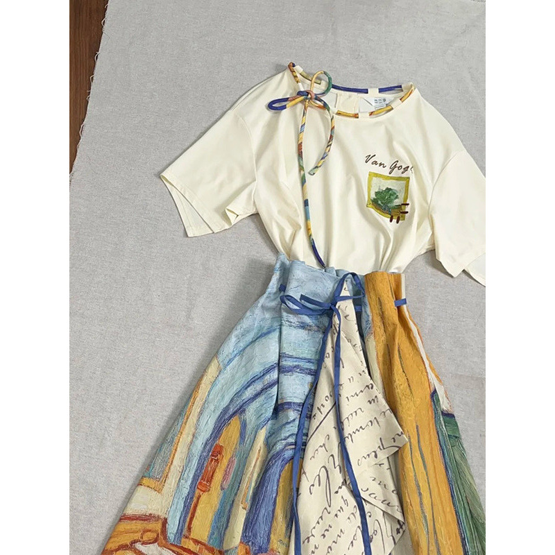 레트로 문학 반팔 티셔츠 탑 불규칙 스커트 여성 여름 반 고흐 유화 스타일 의상 세트스토어 가기
