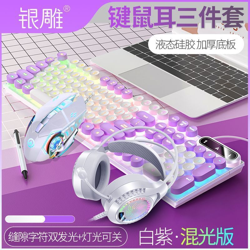 • [키보드 + 게이밍 마우스 + 헤드폰] - 흰색과 보라색 2색丨백색광 [펑크 원형 키캡] [블랙 골드] 업그레이드 버전