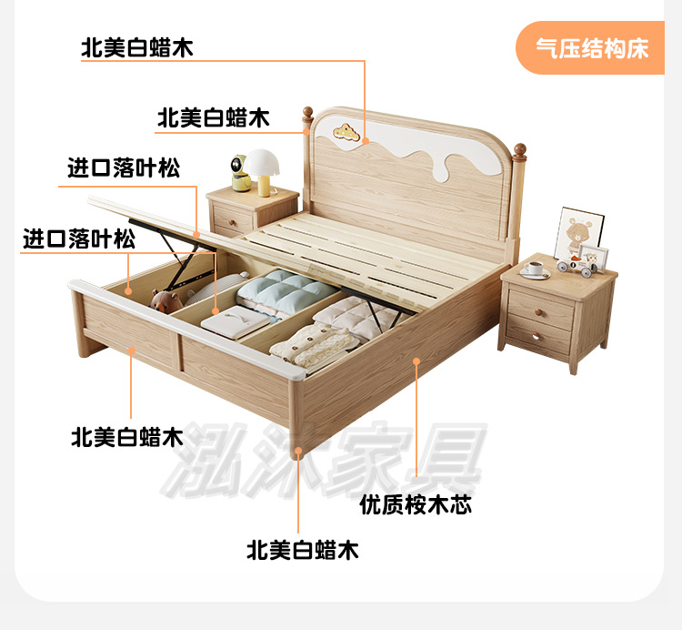 • 공압 구조(모두 원목 상자) + 침대 옆 탁자 2개