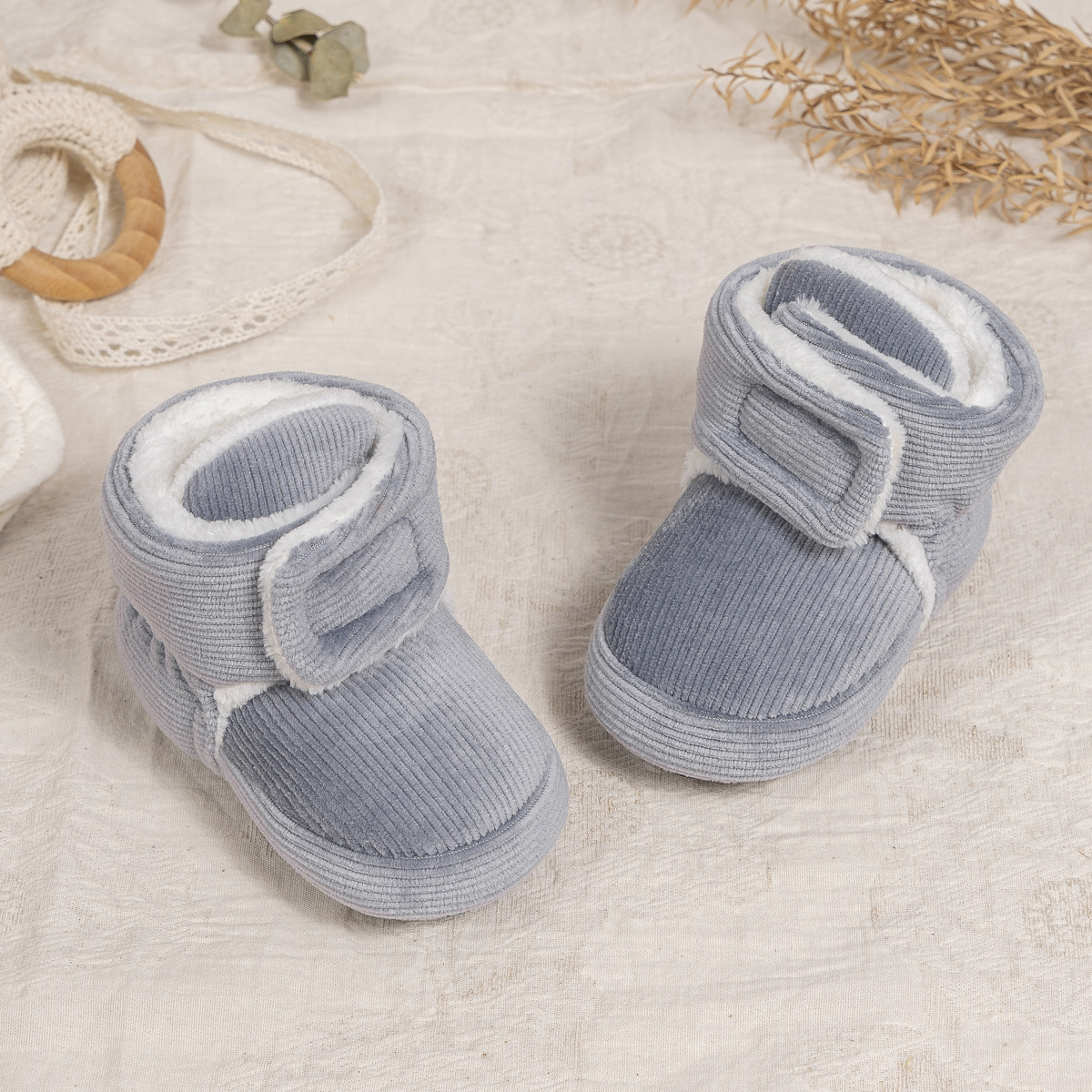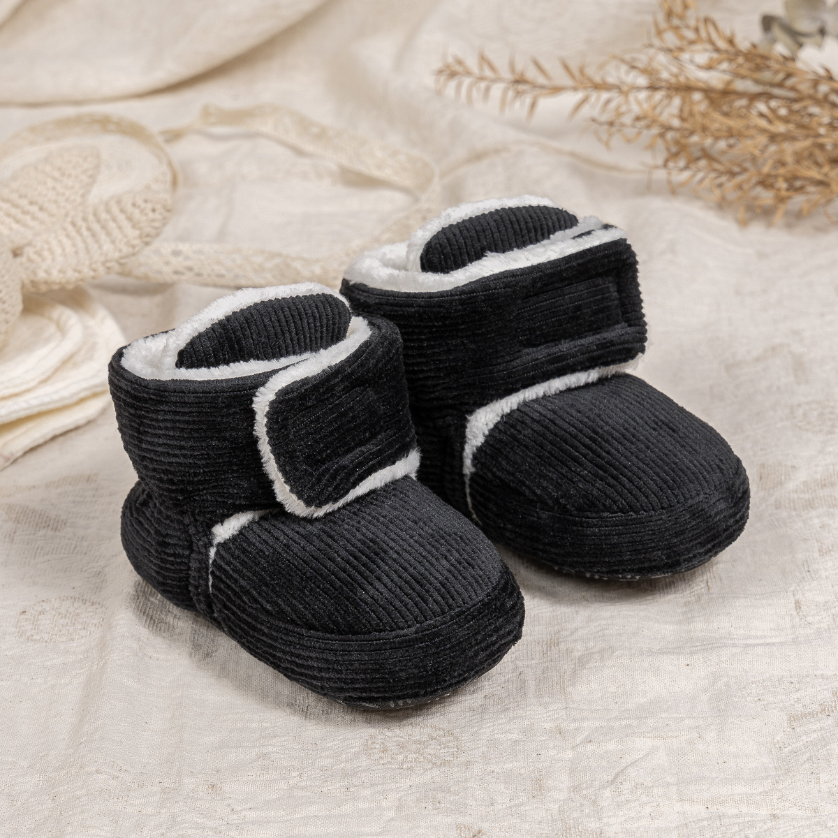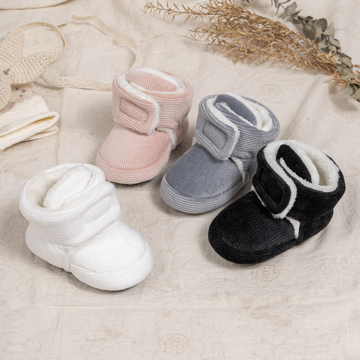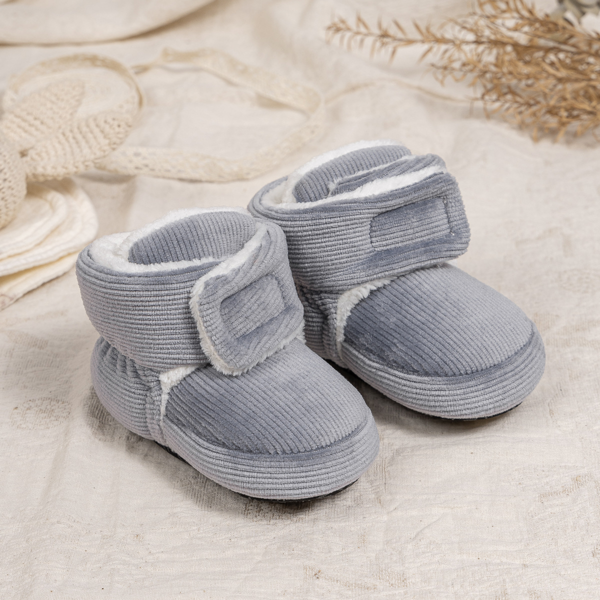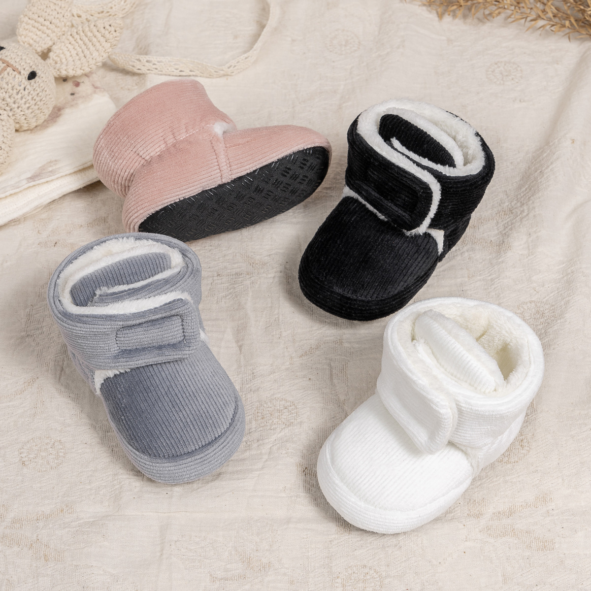 2025 겨울 새로운 두꺼운 아기 신발 벨크로 단색 부드러운 천 바닥 실내 아기 신발 아기 부츠스토어 가기