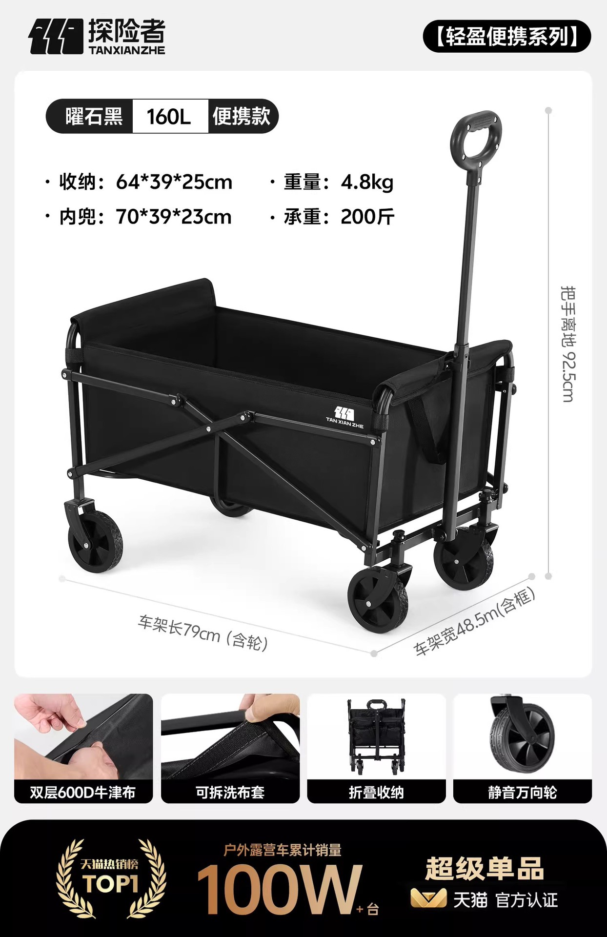 • (160L) 휴대용 두꺼운 모델 - 흑요석 검정색 [자동 범용 휠 + 두꺼운 전체 강철 프레임 + 이중 천 커버]
