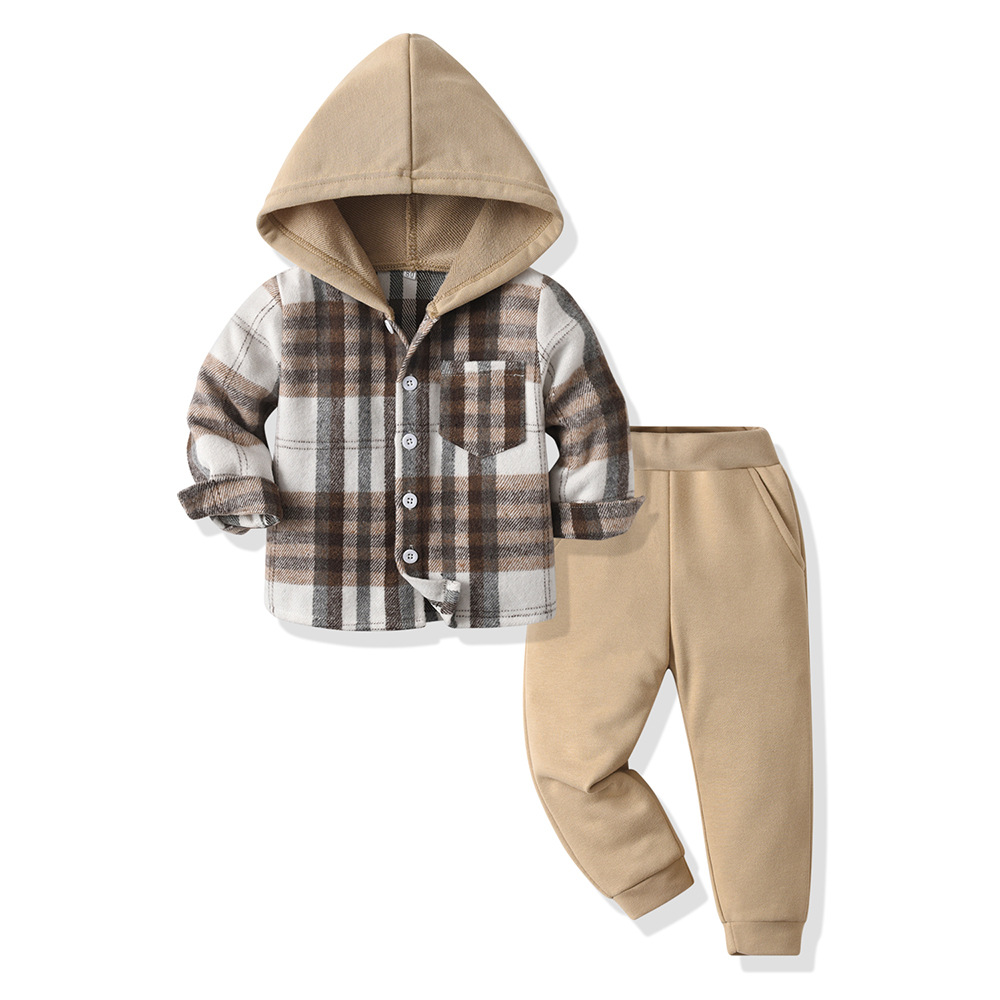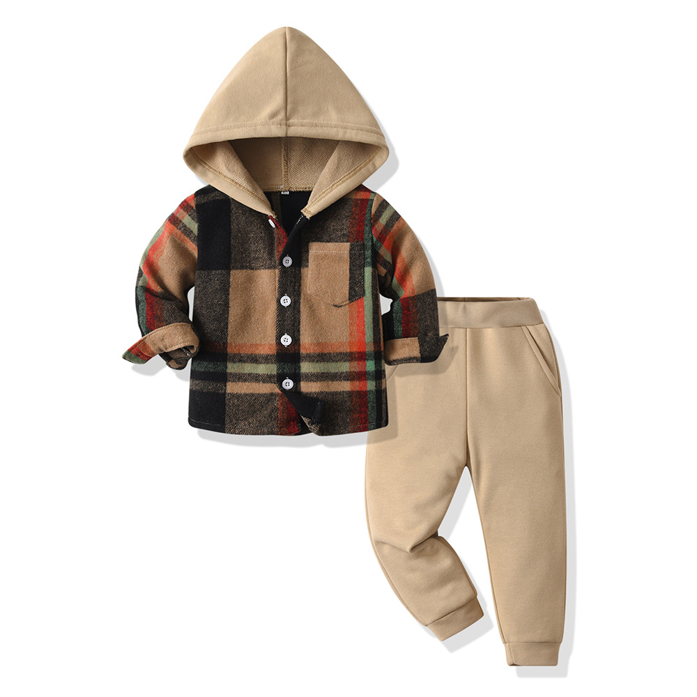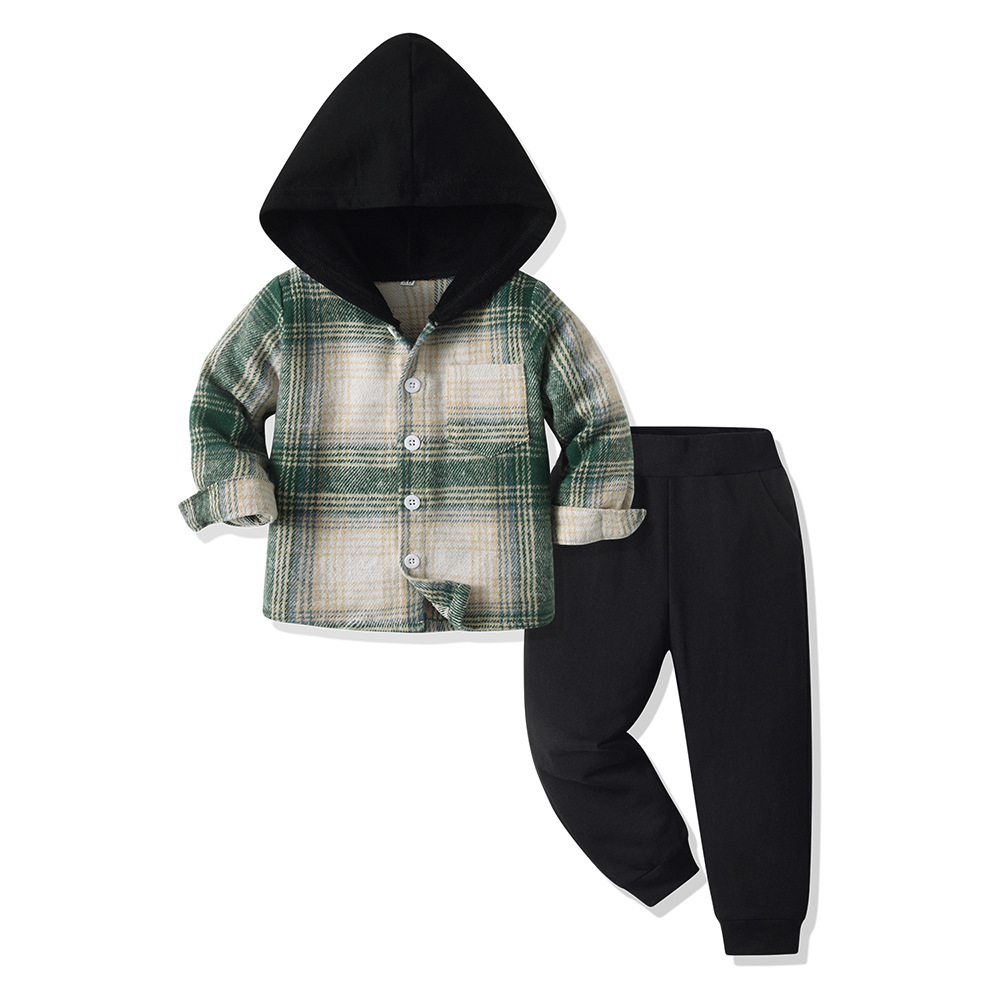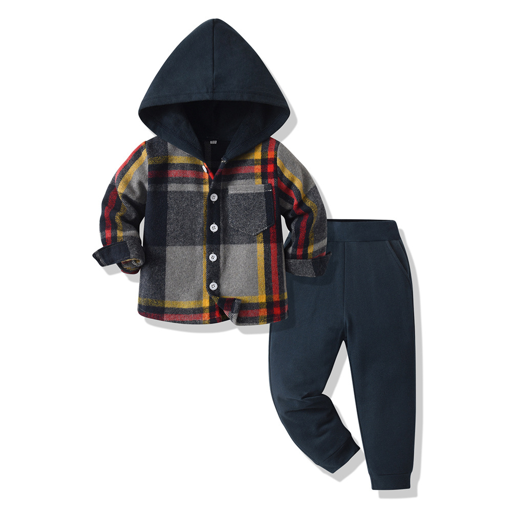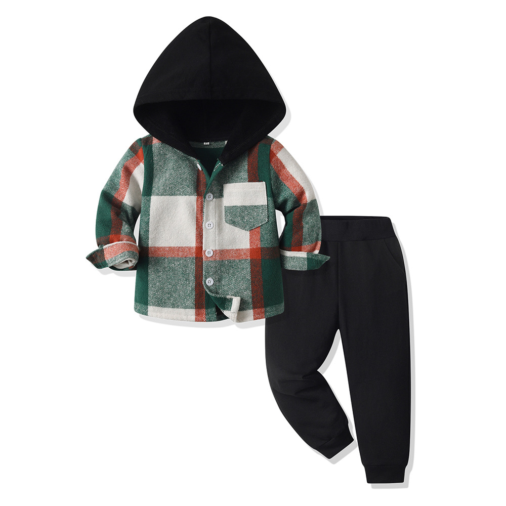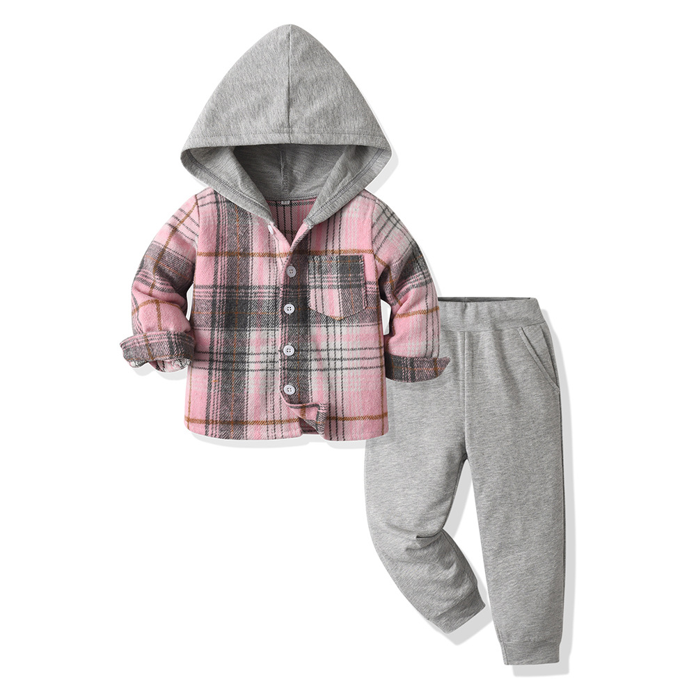 한국식 아동용 다용도 후드 싱글 브레스트 긴팔 체크 무늬 셔츠 캐주얼 바지 투피스 가을 소년 소녀 정장