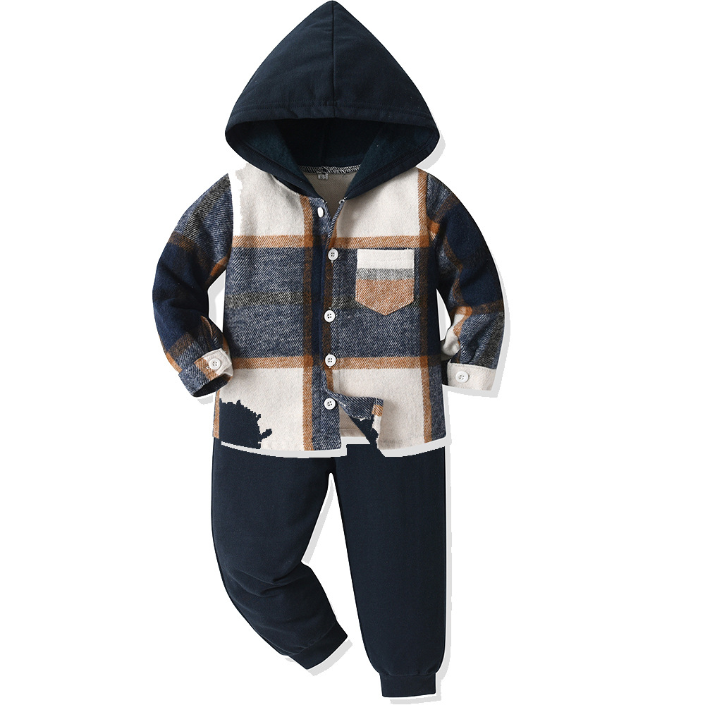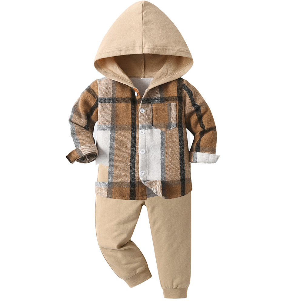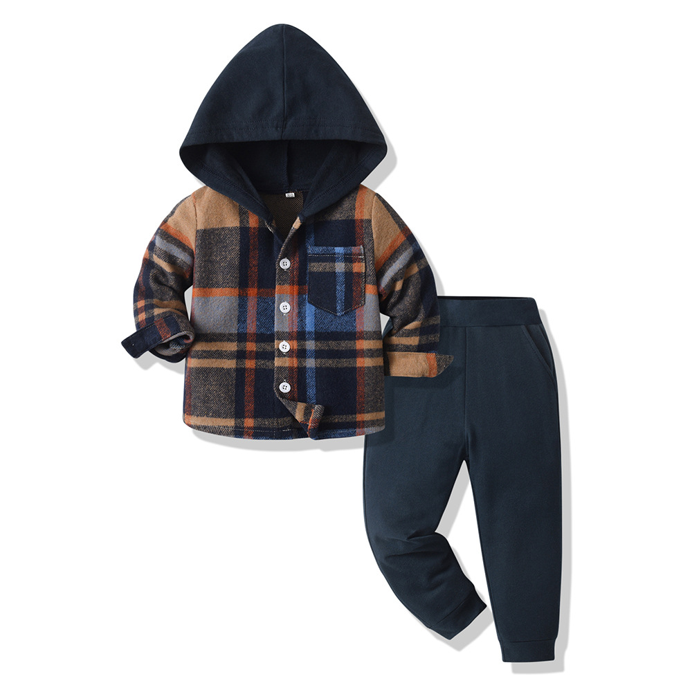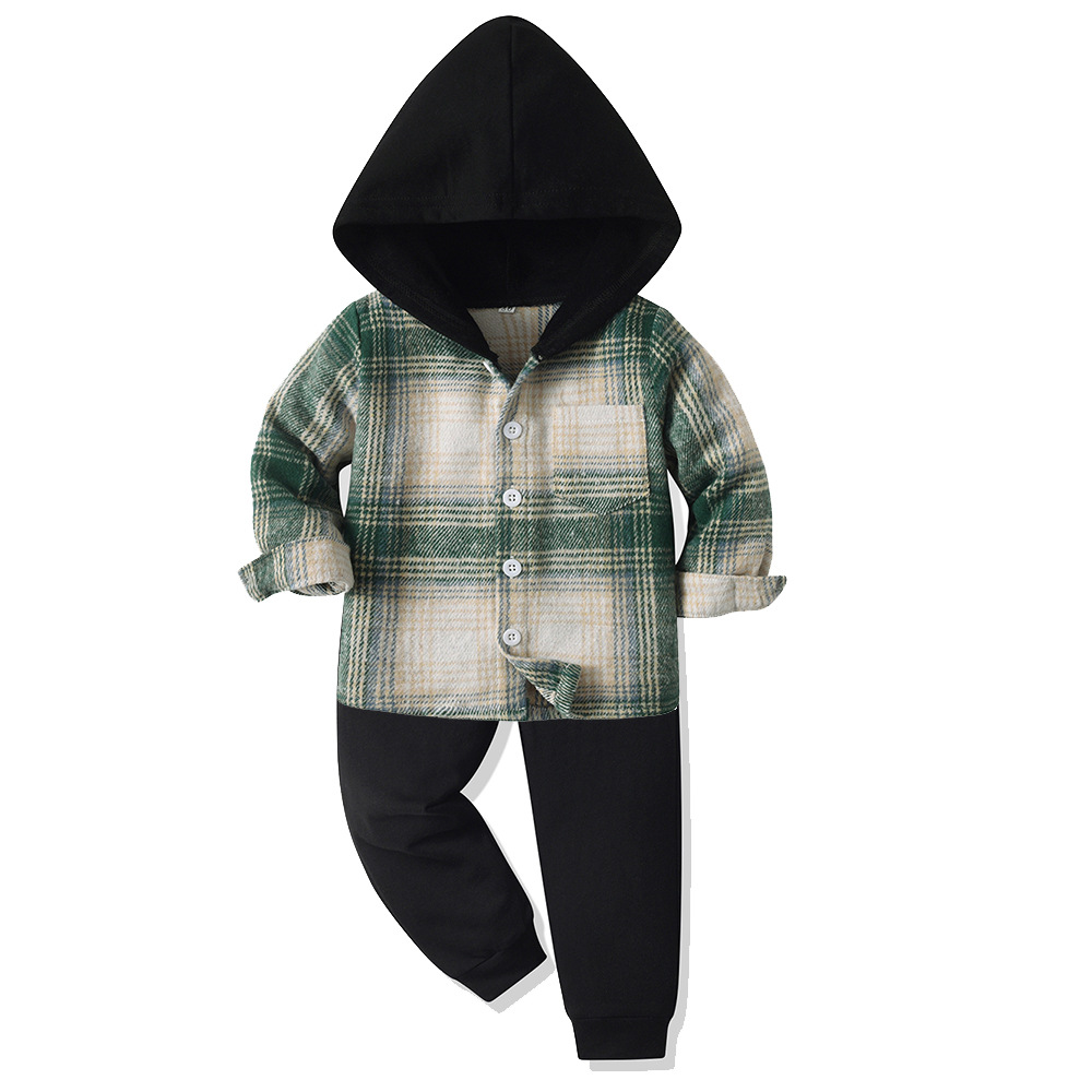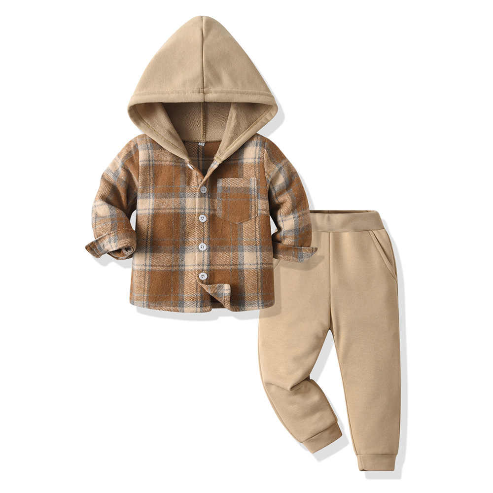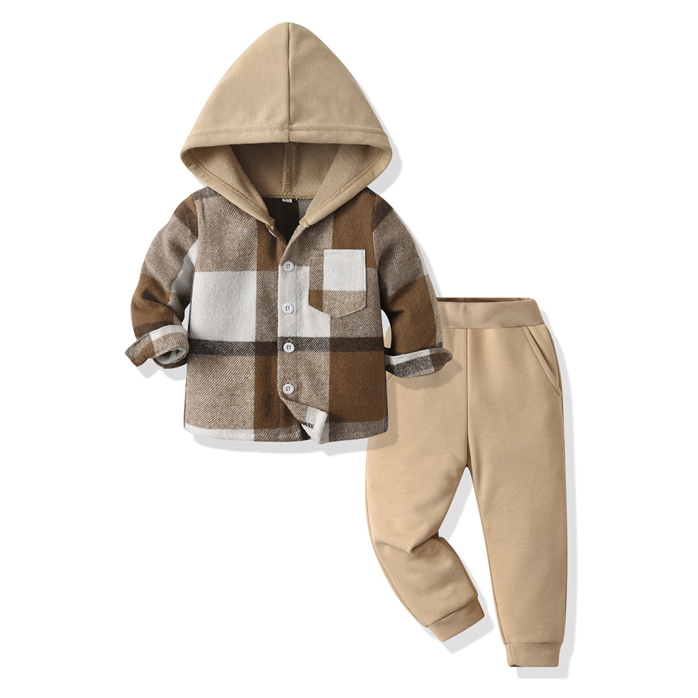 한국식 아동용 다용도 후드 싱글 브레스트 긴팔 체크 무늬 셔츠 캐주얼 바지 투피스 가을 소년 소녀 정장