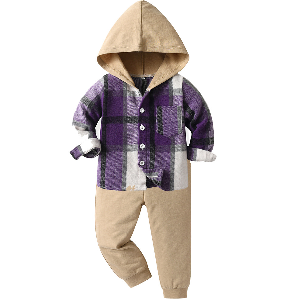 한국식 아동용 다용도 후드 싱글 브레스트 긴팔 체크 무늬 셔츠 캐주얼 바지 투피스 가을 소년 소녀 정장스토어 가기