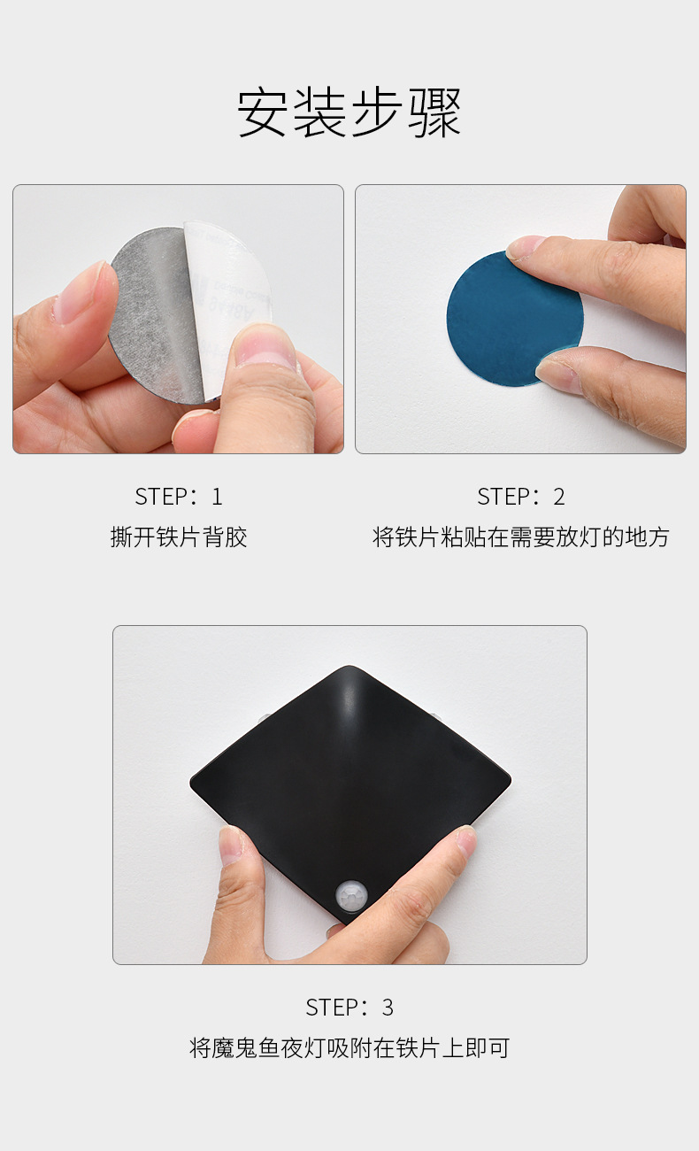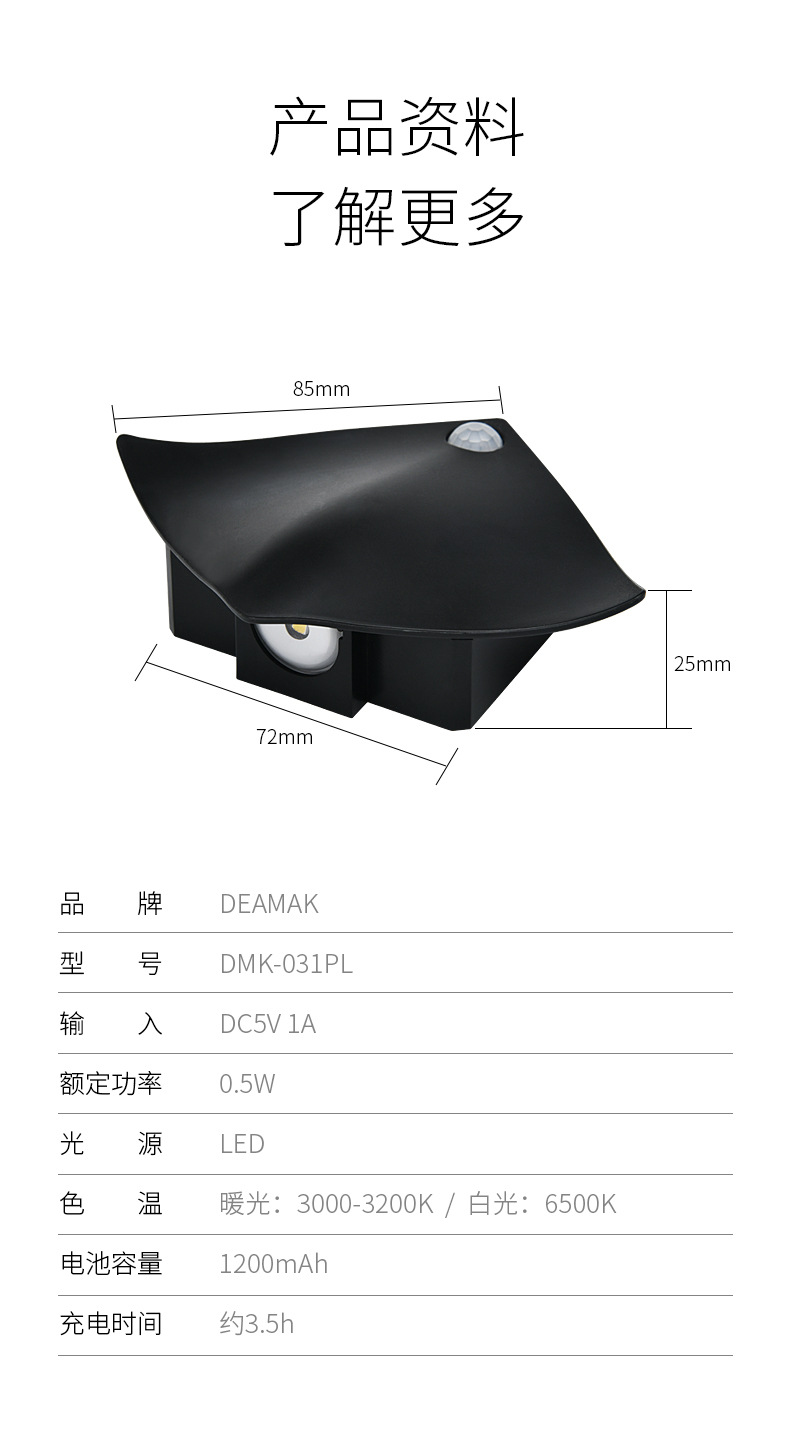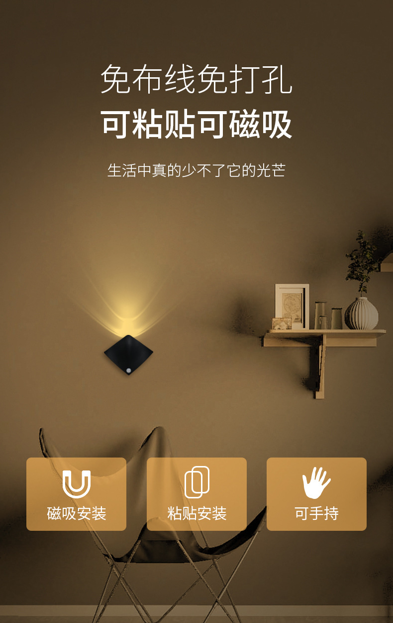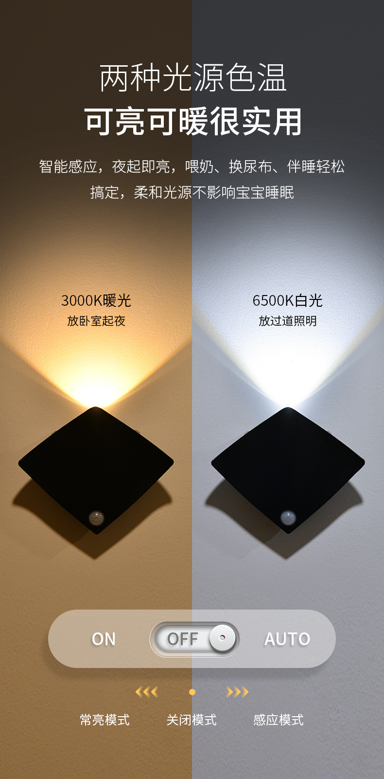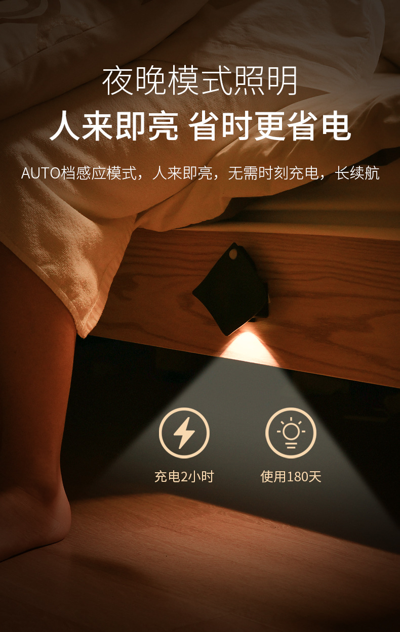 AUTO感应模式:昏暗环境人来亮灯,人离开后20秒左右熄灭,感应距离3-5米