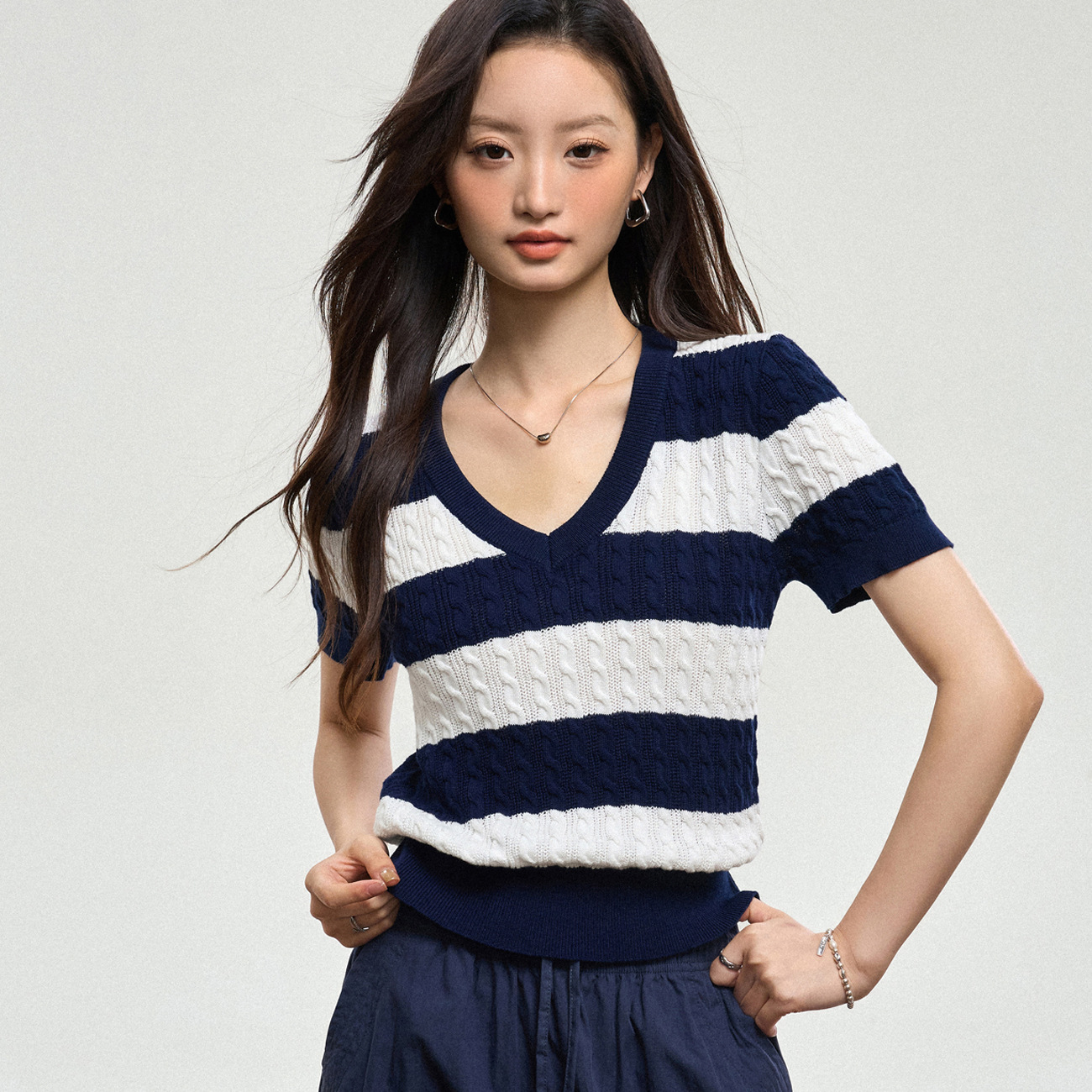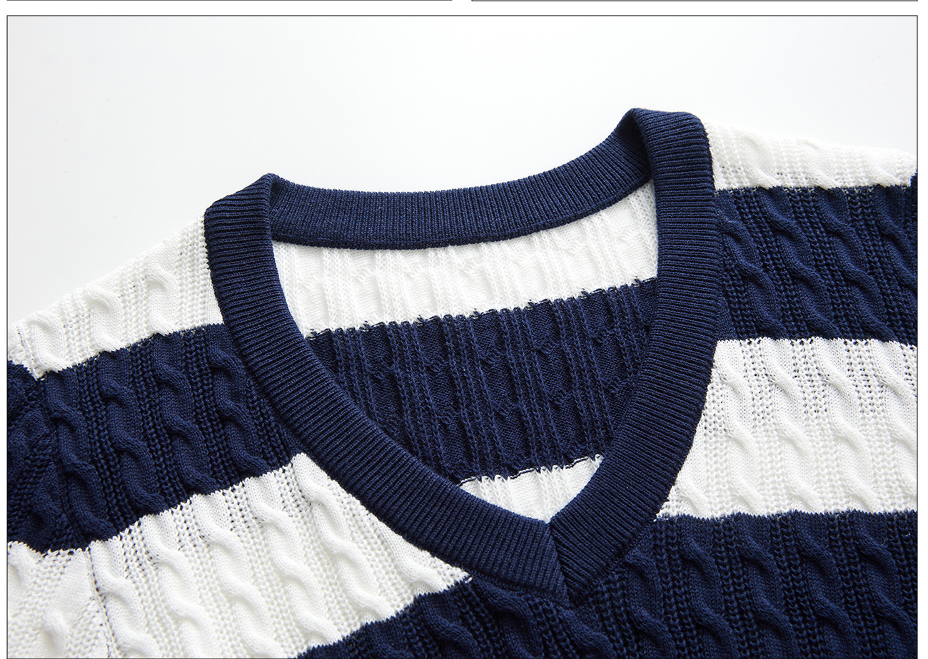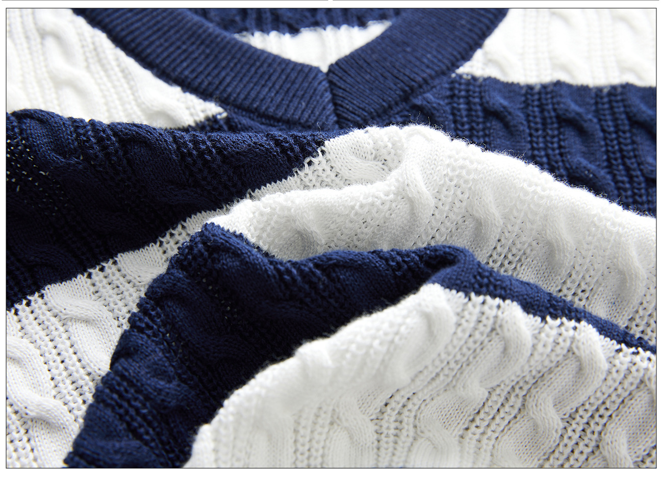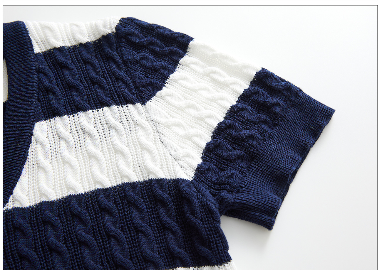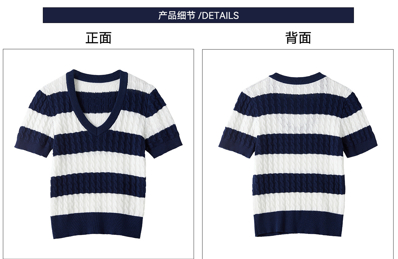 100% 면 린넨 니트 스웨터 V넥 블루 화이트 스트라이프 배색 여성 여름 신상 2026 한국 스타일 루즈핏 반팔 상의스토어 가기