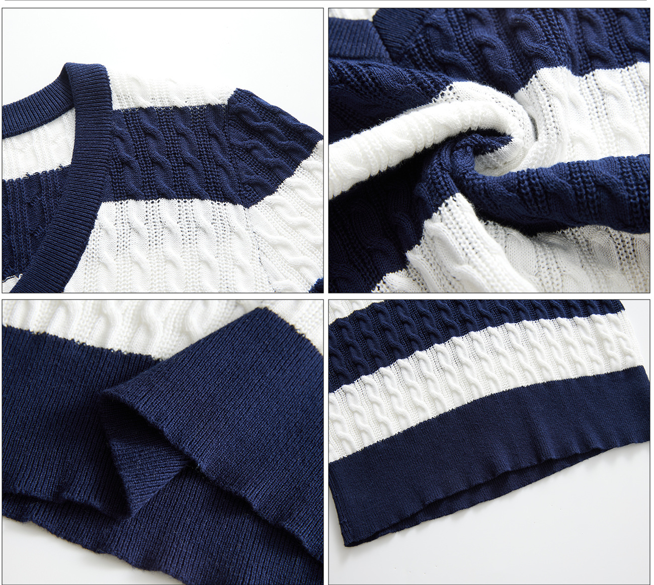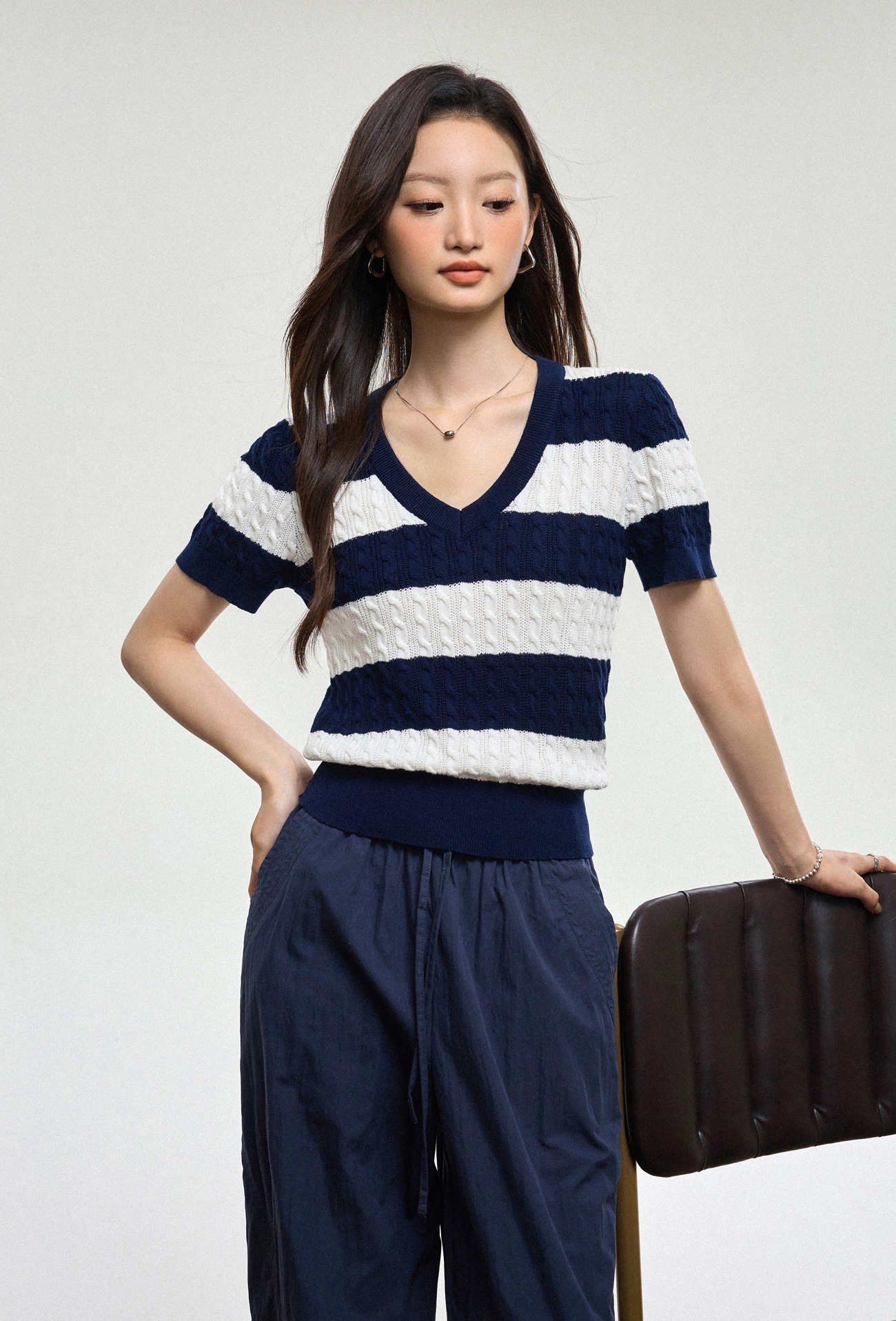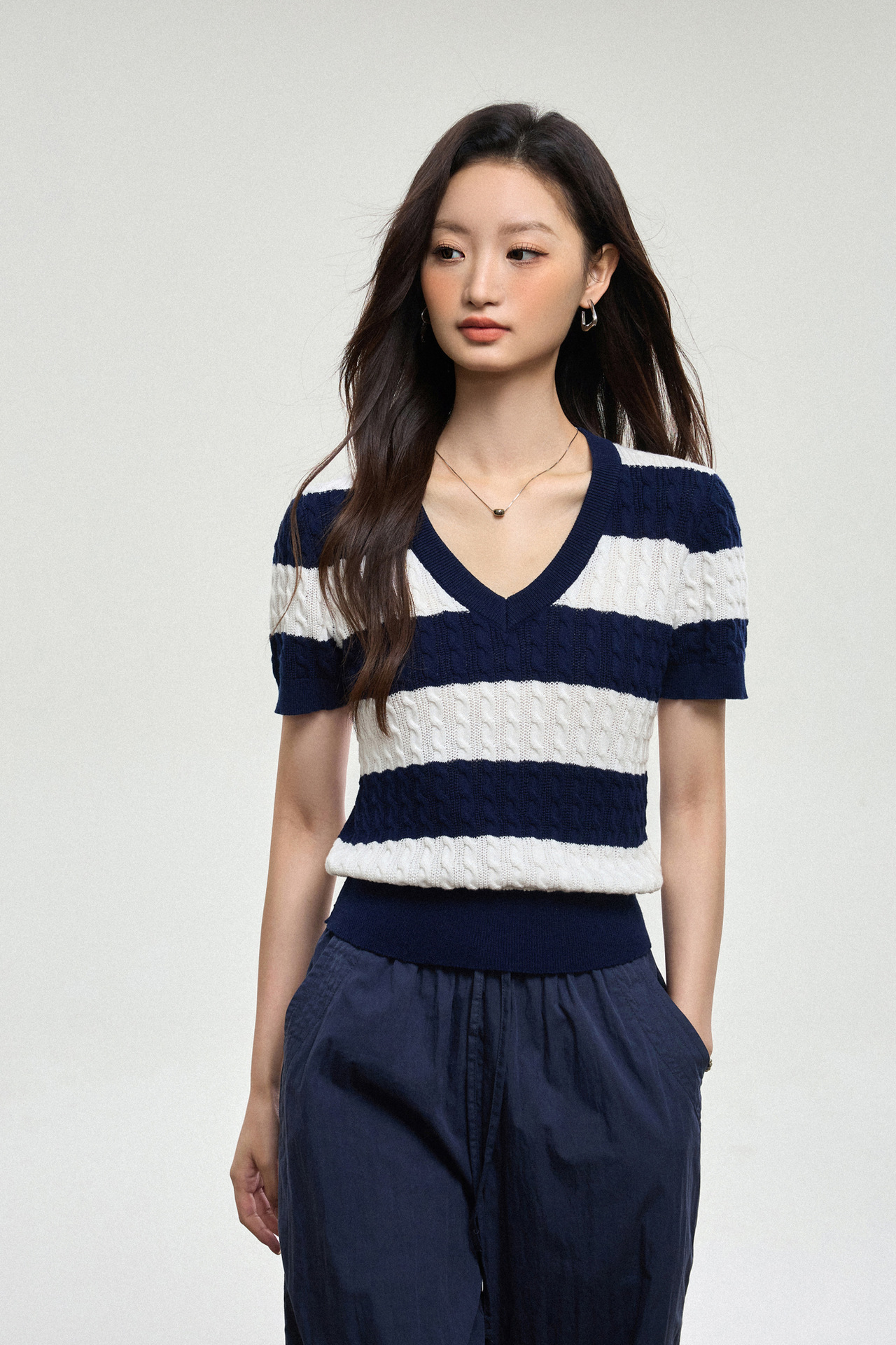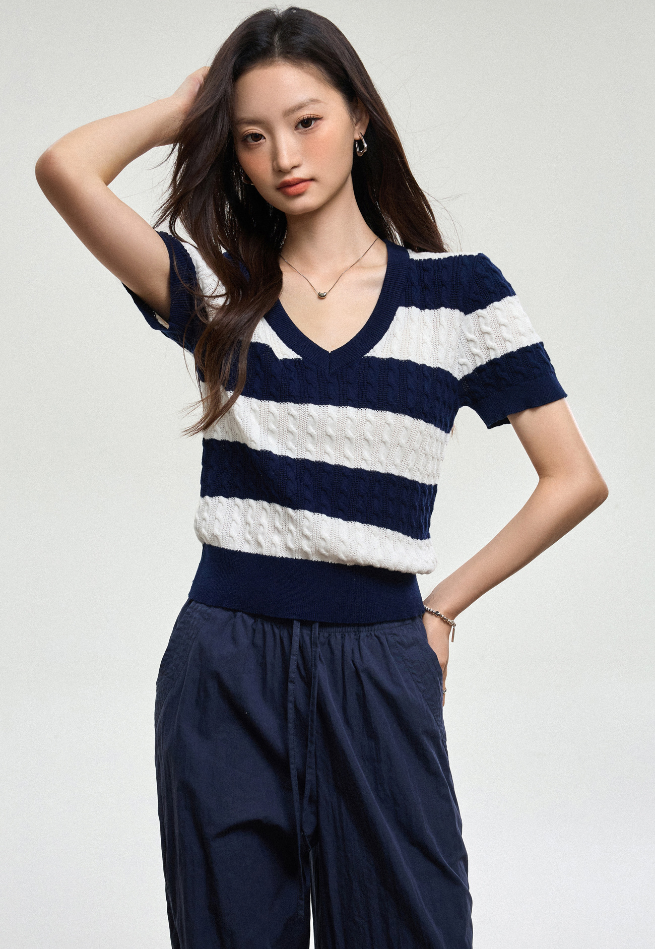 100% 면 린넨 니트 스웨터 V넥 블루 화이트 스트라이프 배색 여성 여름 신상 2026 한국 스타일 루즈핏 반팔 상의스토어 가기