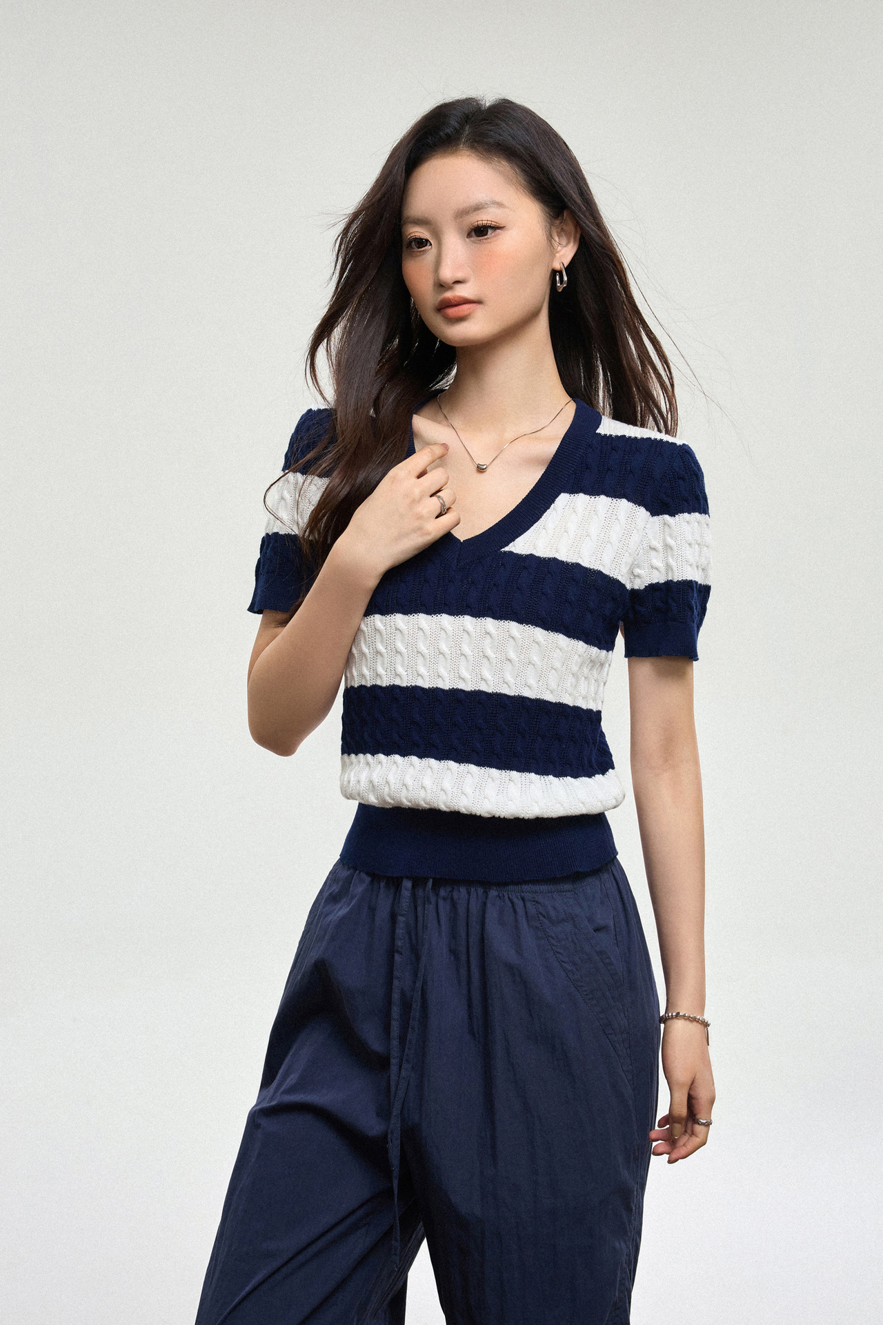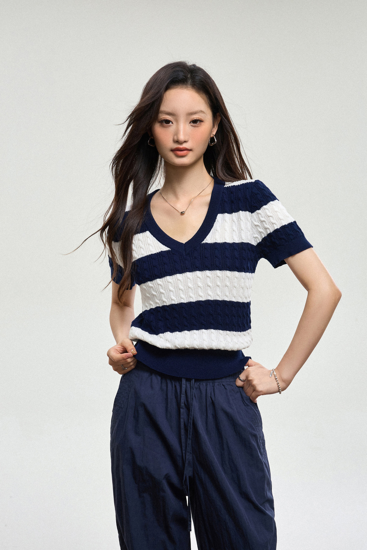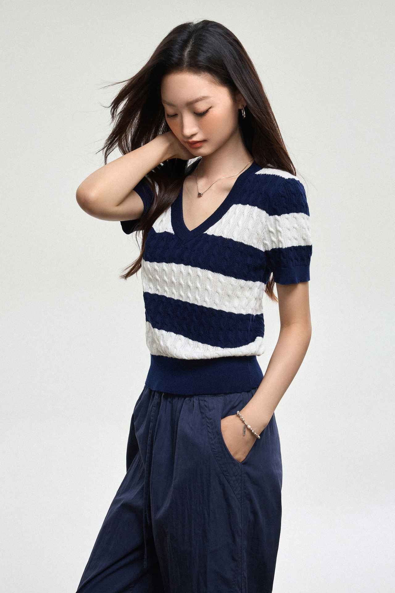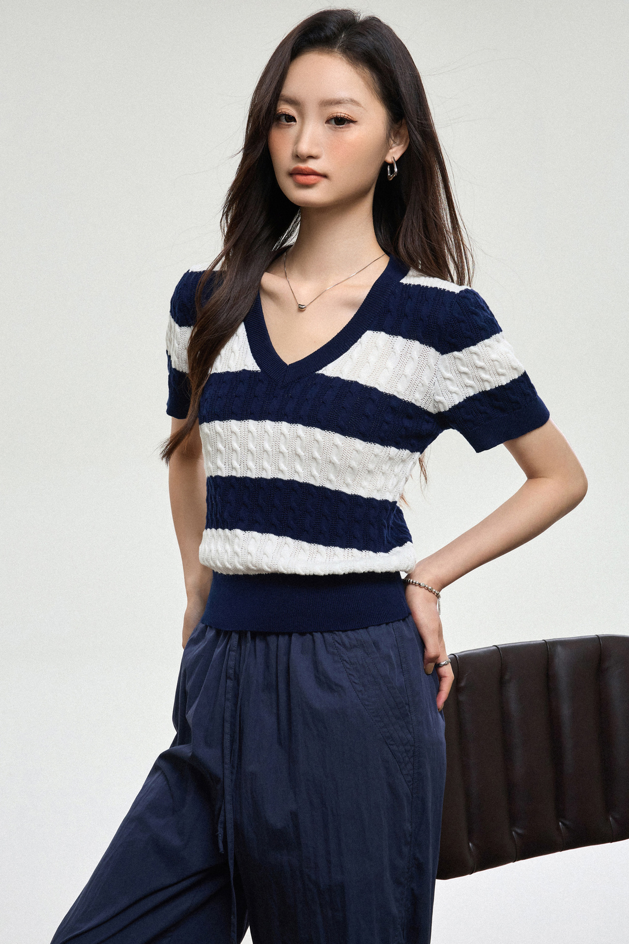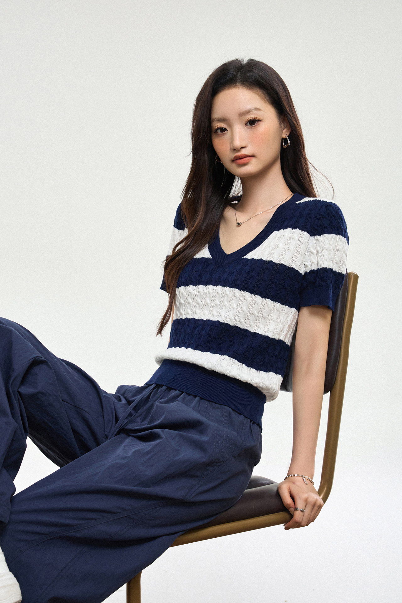 100% 면 린넨 니트 스웨터 V넥 블루 화이트 스트라이프 배색 여성 여름 신상 2026 한국 스타일 루즈핏 반팔 상의스토어 가기