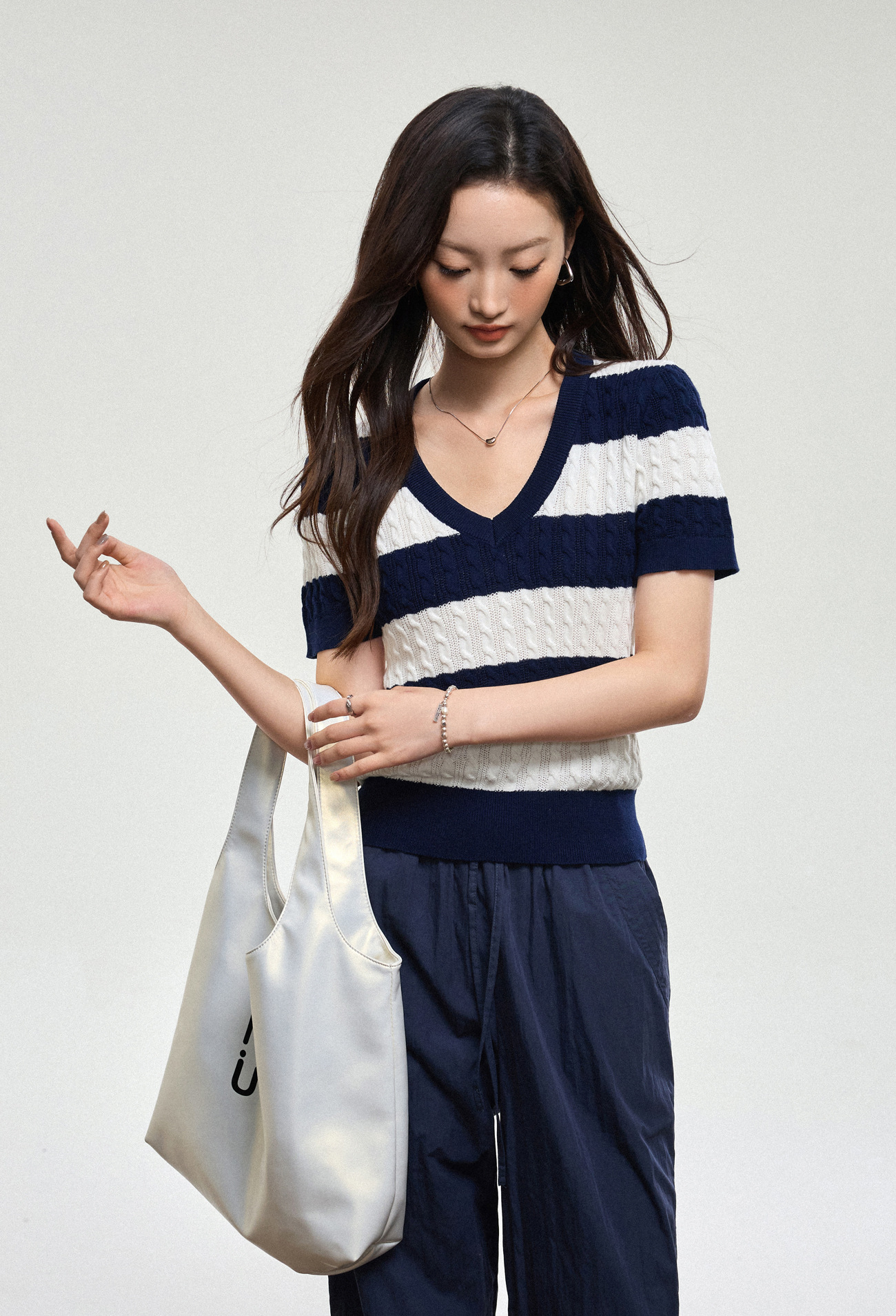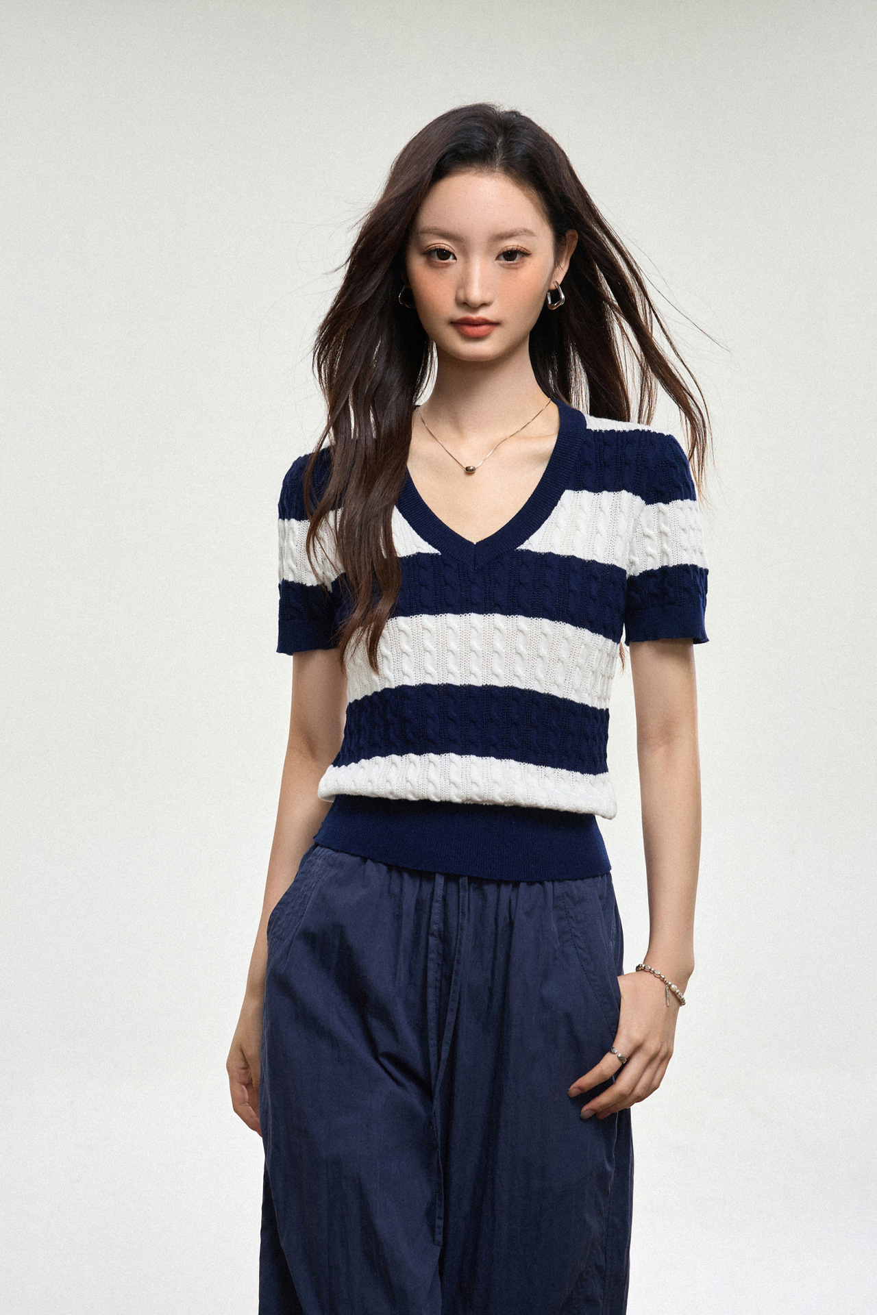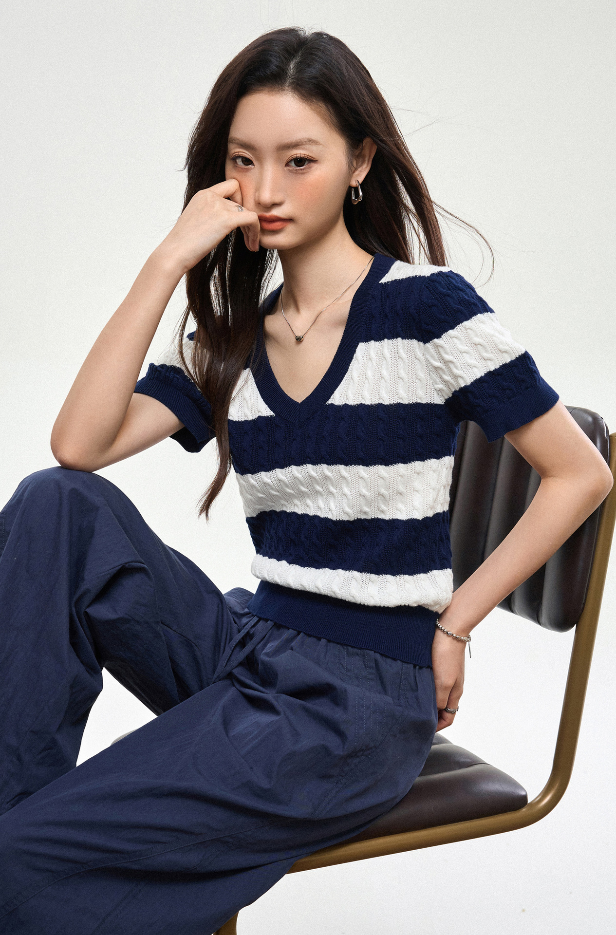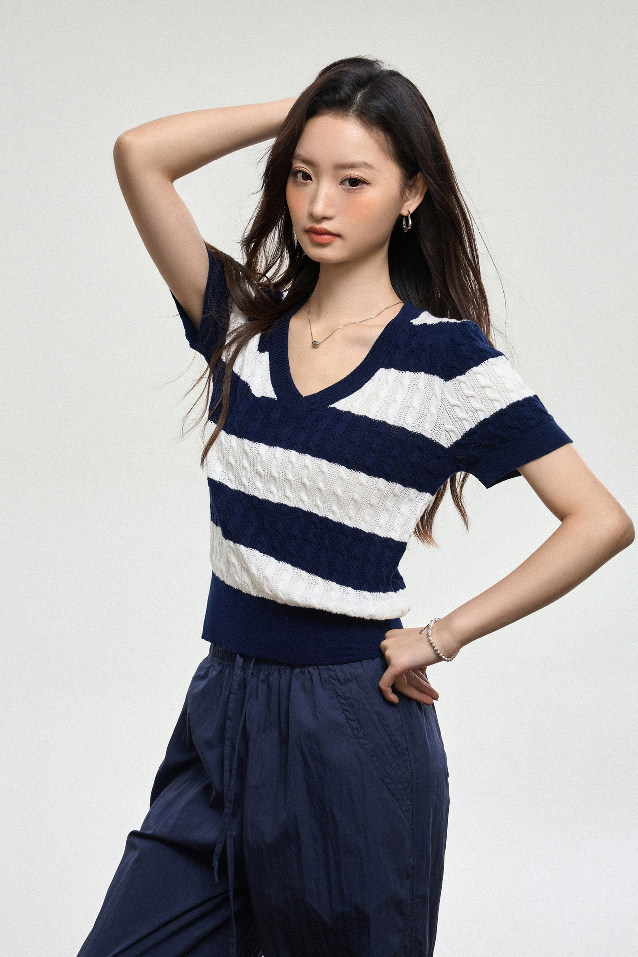 100% 면 린넨 니트 스웨터 V넥 블루 화이트 스트라이프 배색 여성 여름 신상 2026 한국 스타일 루즈핏 반팔 상의스토어 가기