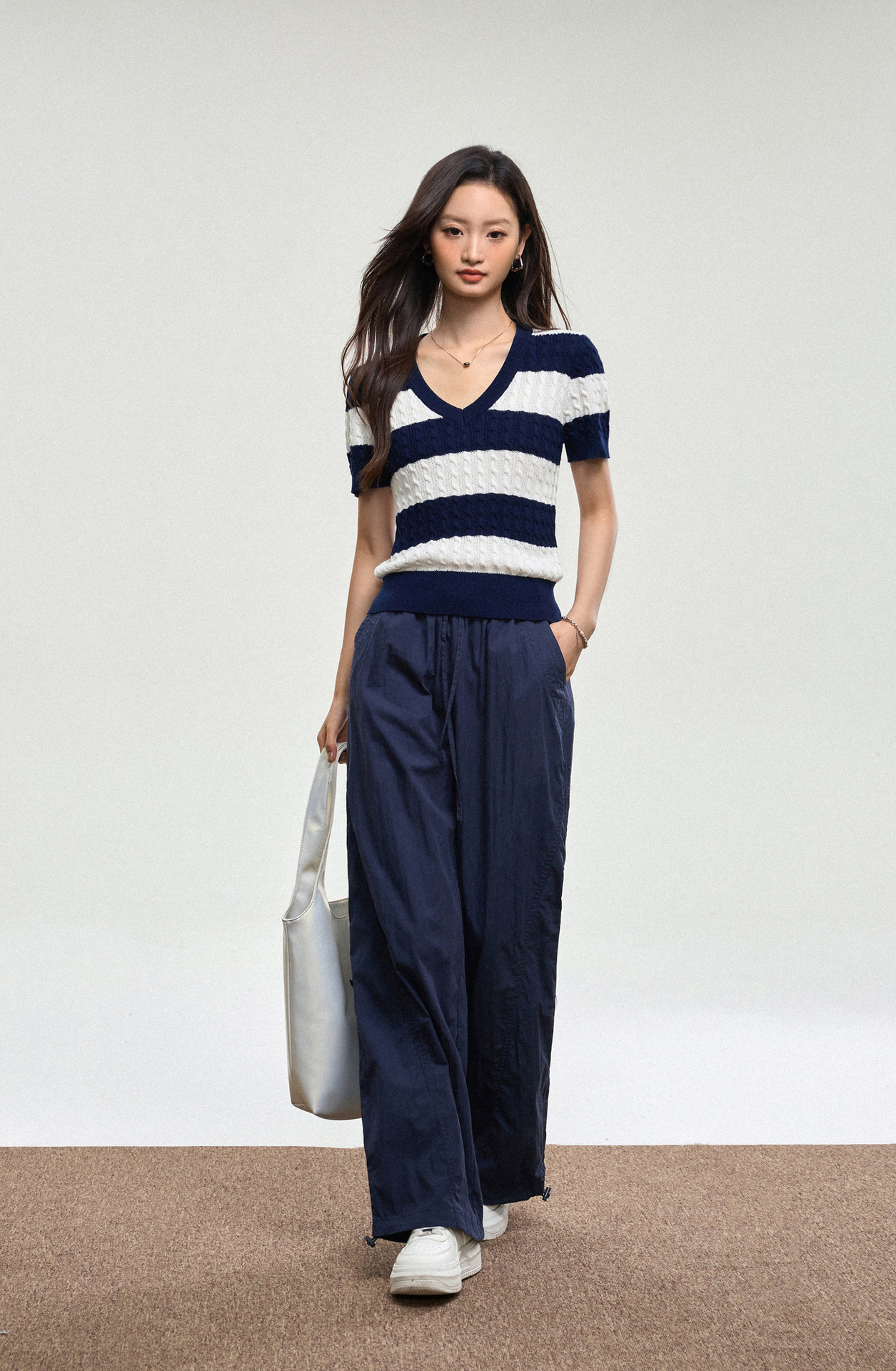 100% 면 린넨 니트 스웨터 V넥 블루 화이트 스트라이프 배색 여성 여름 신상 2026 한국 스타일 루즈핏 반팔 상의