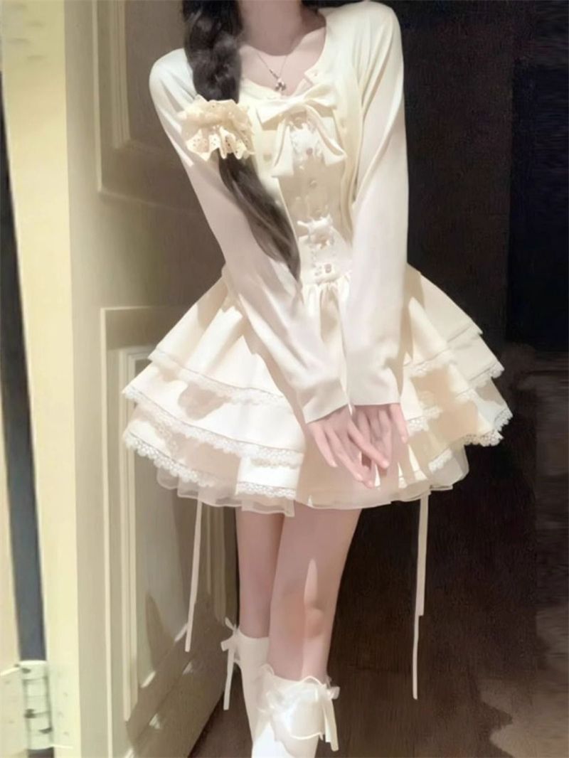 몸집이 작은 분들을 위한 여름 순수하고 섹시한 스타일의 슬립 케이크 원피스 + 살구색 가디건 자외선 차단 투피스 세트스토어 가기