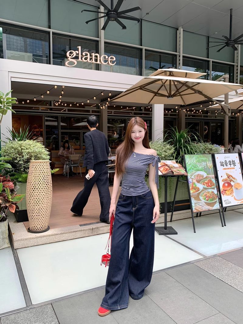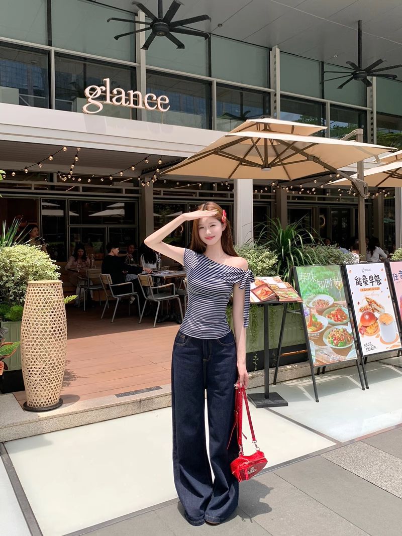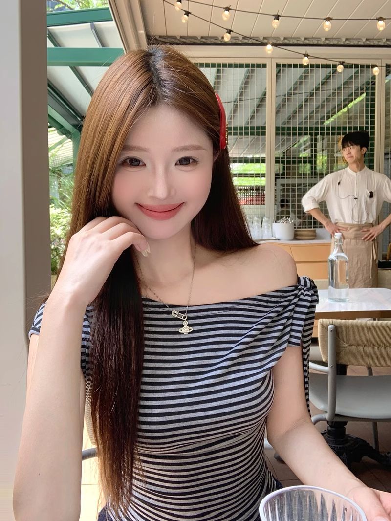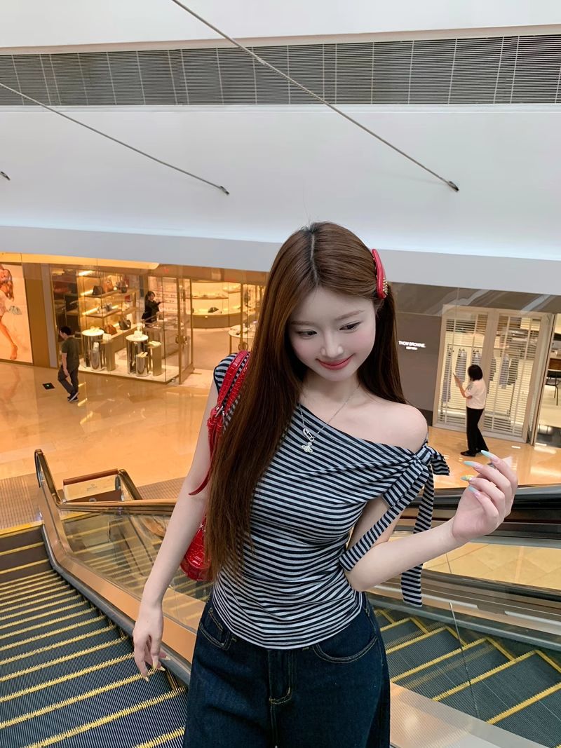 Pure Desire Bow Tie Oblique Shoulder 스트라이프 티셔츠 여성 여름 복고풍 세련된 슬림 짧은 오프 숄더 탑스토어 가기