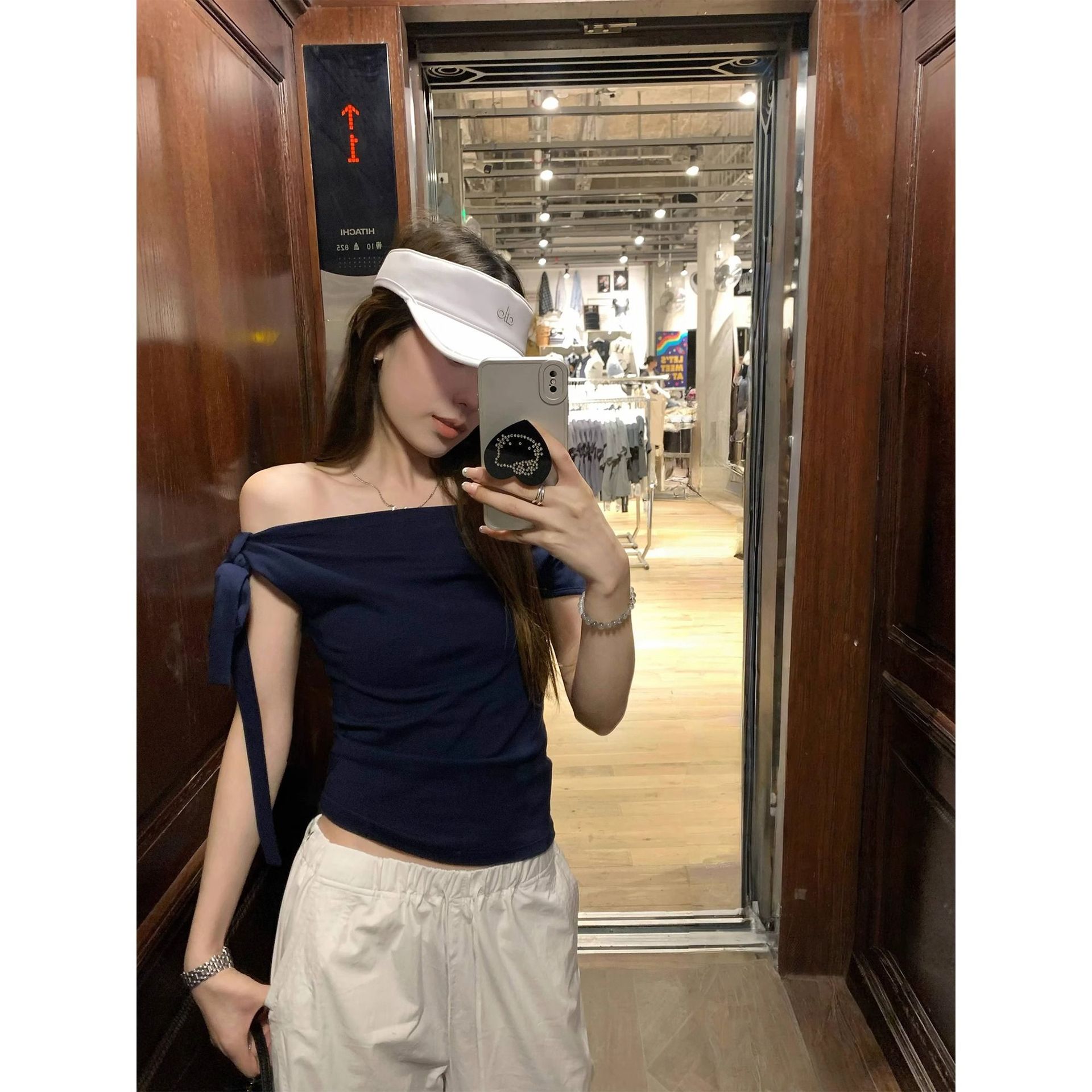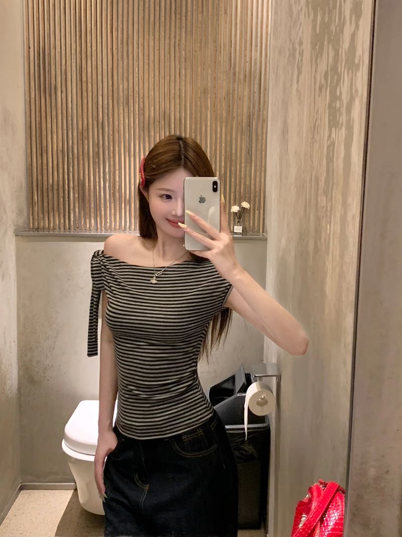 Pure Desire Bow Tie Oblique Shoulder 스트라이프 티셔츠 여성 여름 복고풍 세련된 슬림 짧은 오프 숄더 탑