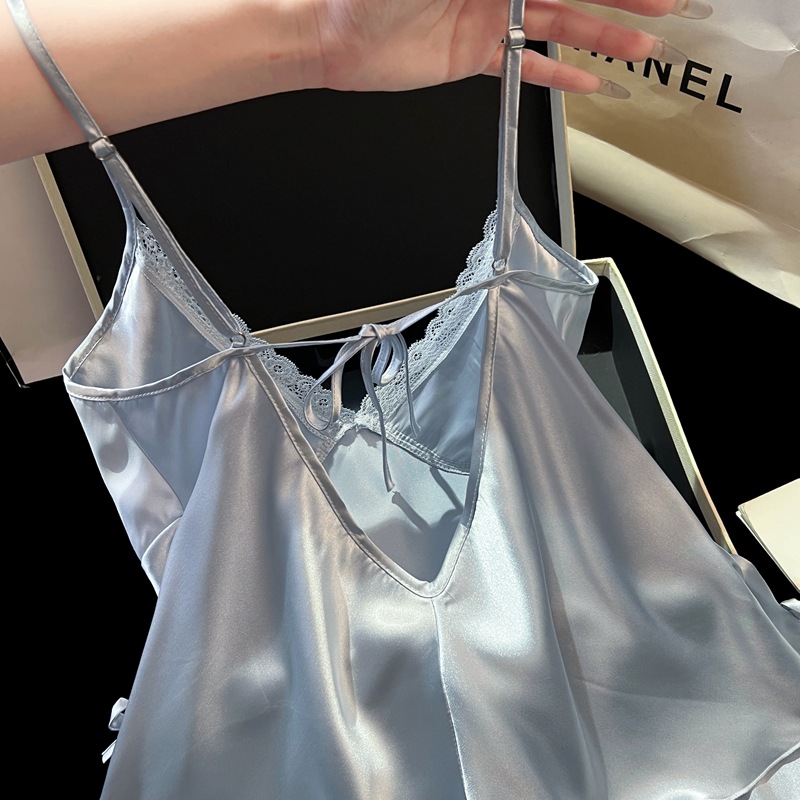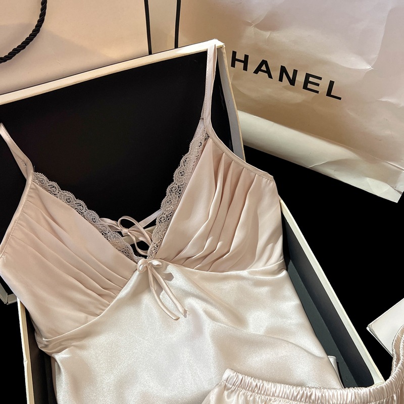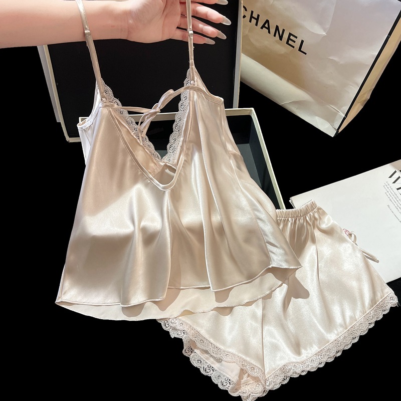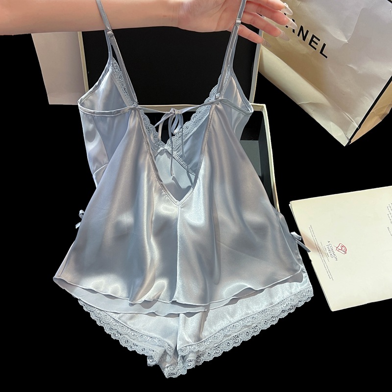 2025 새로운 여름 얼음과 눈 실크 잠옷 여성 섹시한 서스펜더 반바지 투피스 세트 순수한 욕망 스타일 홈웨어 세트스토어 가기