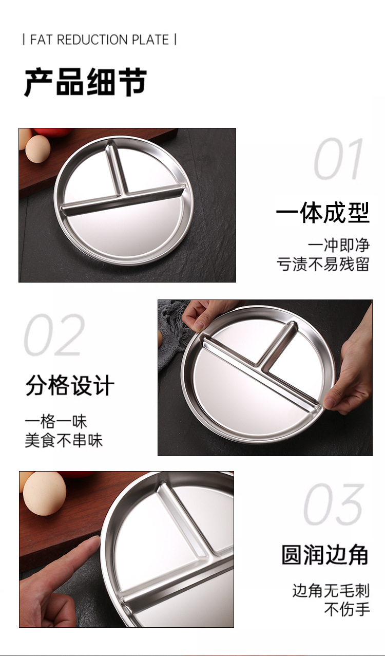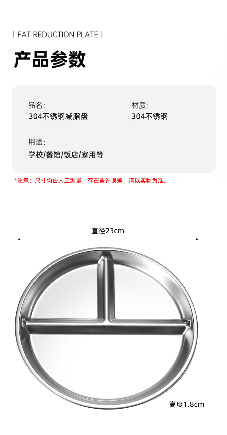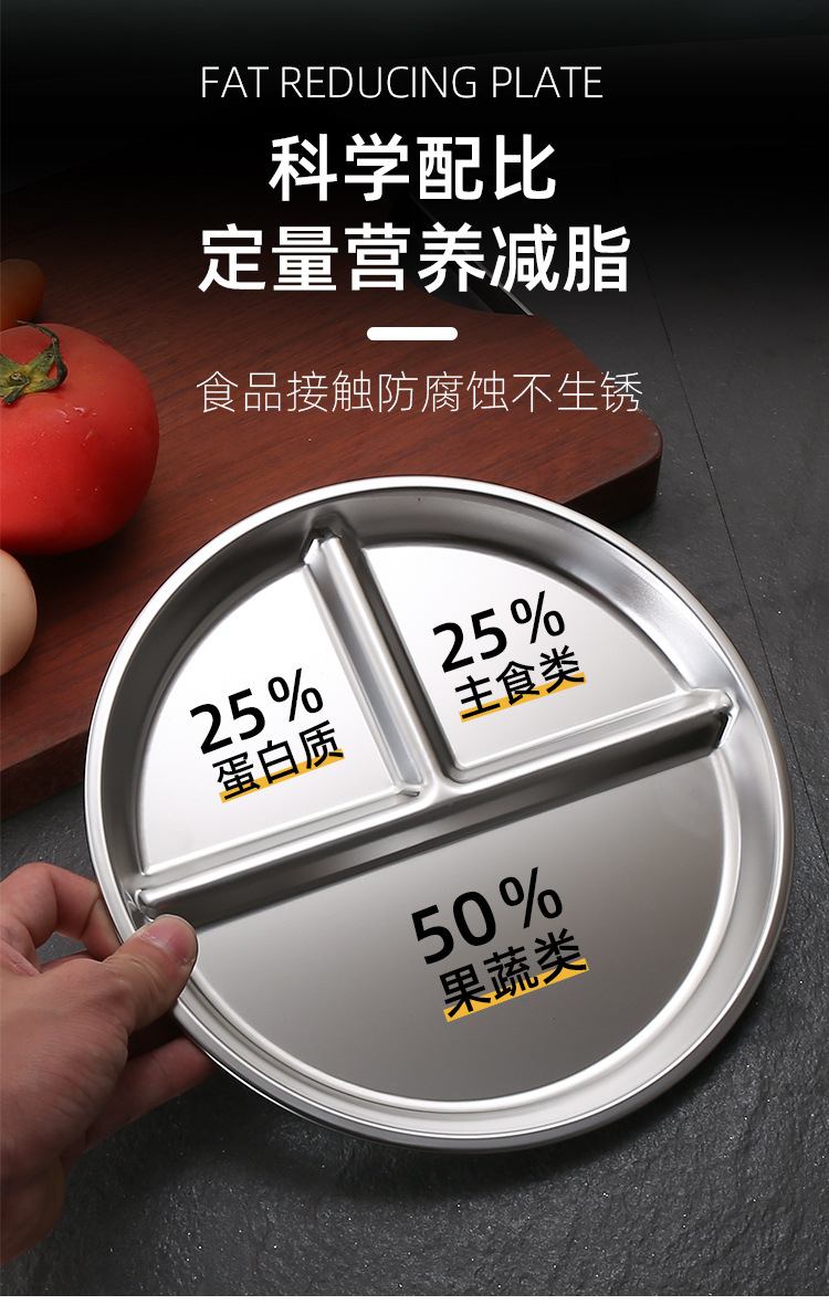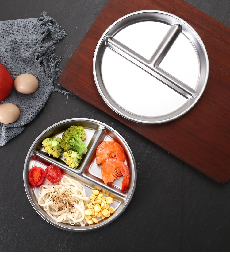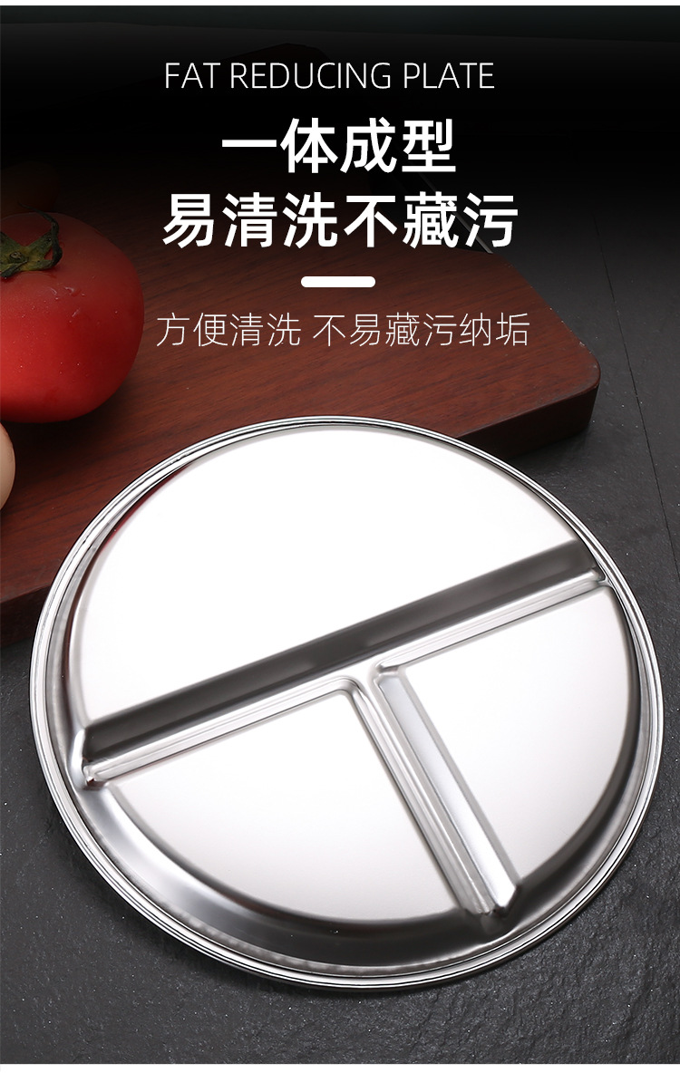 304 스테인리스 스틸 디너 플레이트, 3칸 원형 플레이트, 성인용 정량 지방 감량 디너 플레이트, 학생용 비율 스낵 플레이트, 얕은 플레이트스토어 가기