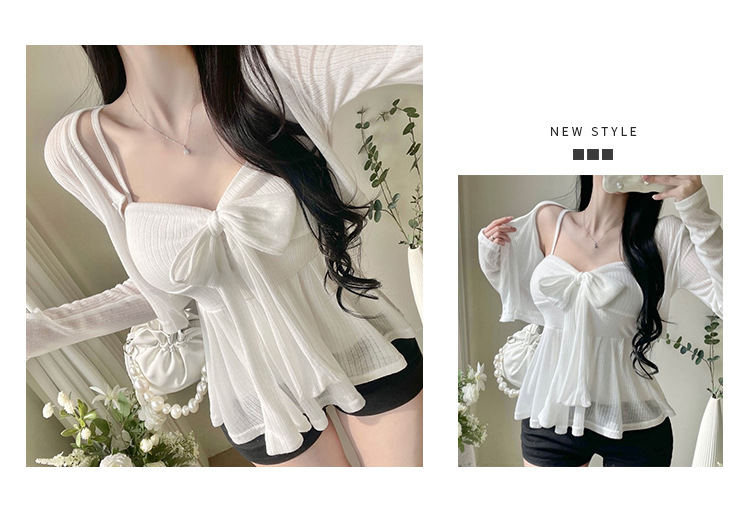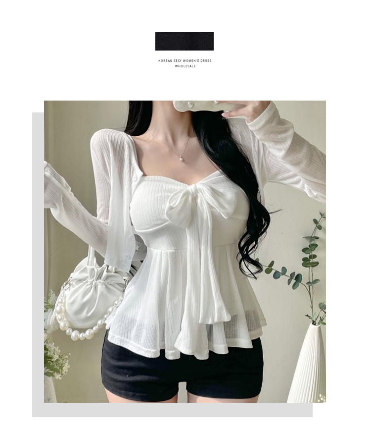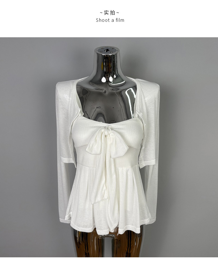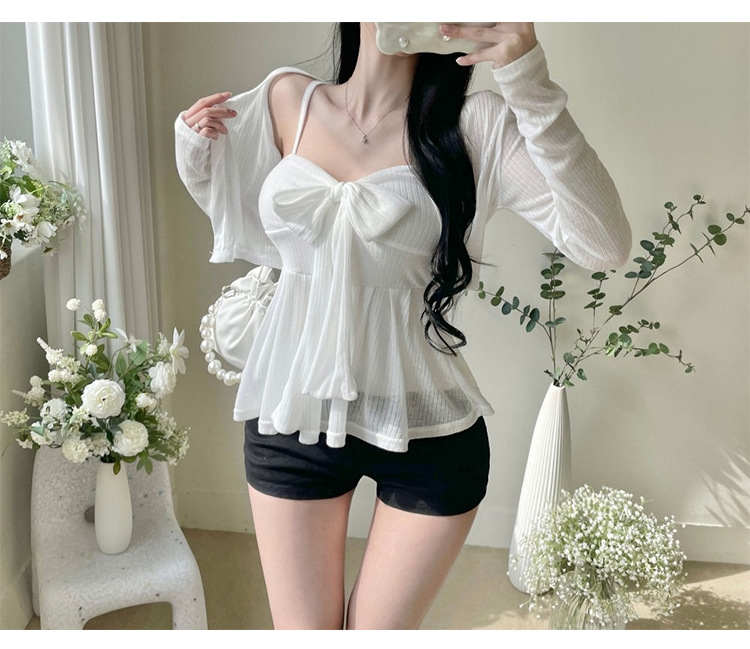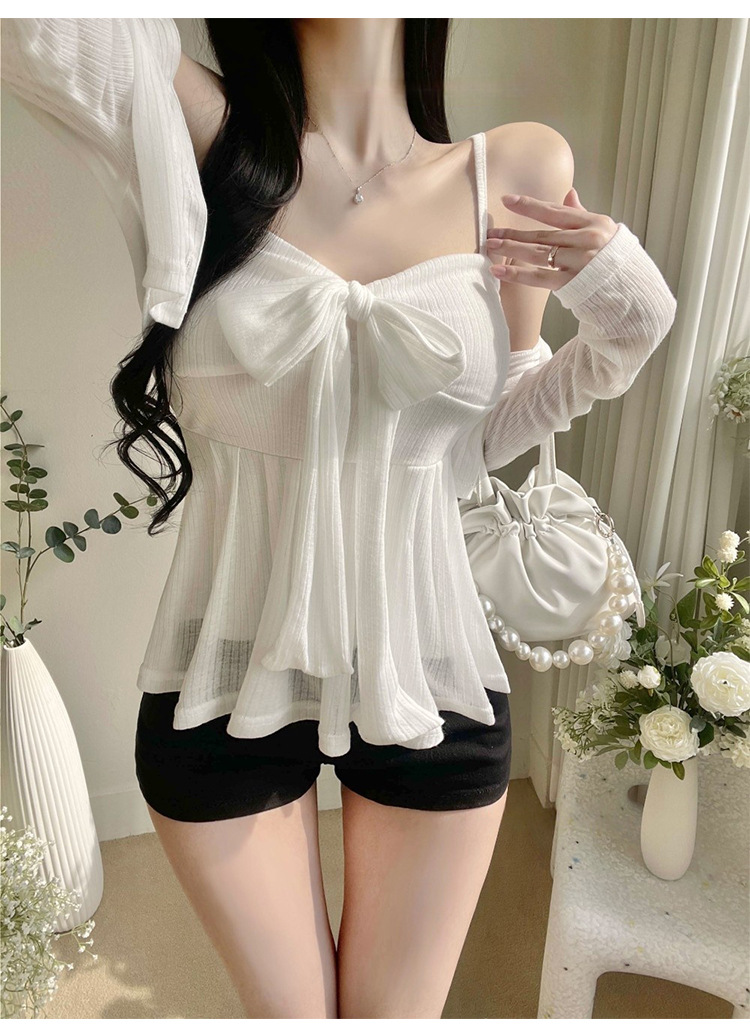 한국 동대문 새로운 스타일 솔리드 컬러 보우 슬림 섹시한 서스펜더 카디건 투피스 슈트 탑 여성 의류스토어 가기