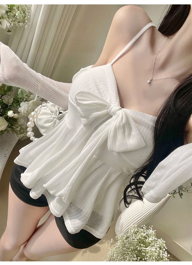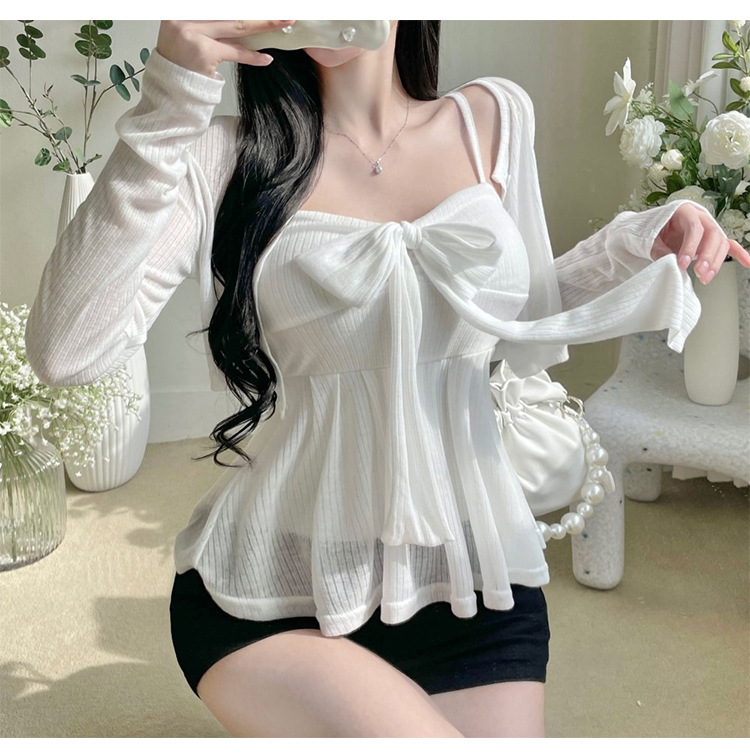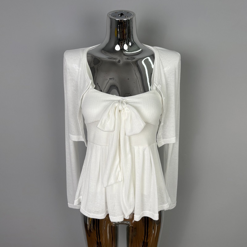 한국 동대문 새로운 스타일 솔리드 컬러 보우 슬림 섹시한 서스펜더 카디건 투피스 슈트 탑 여성 의류