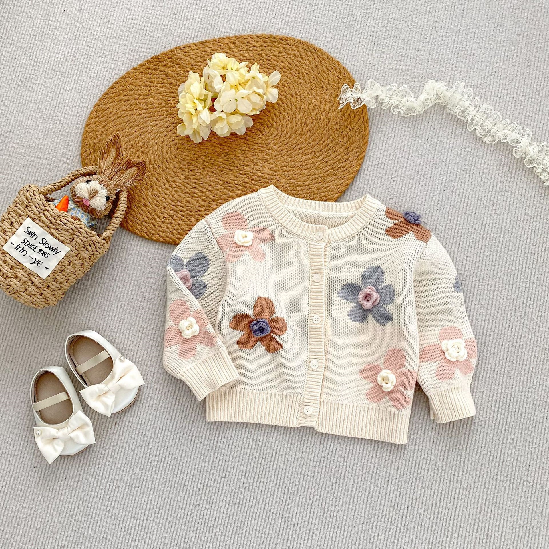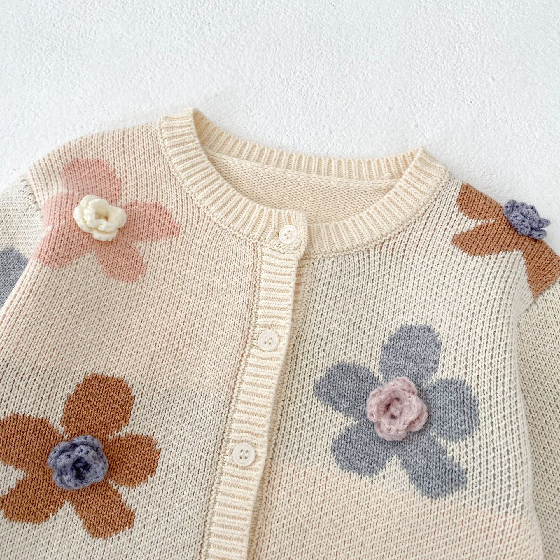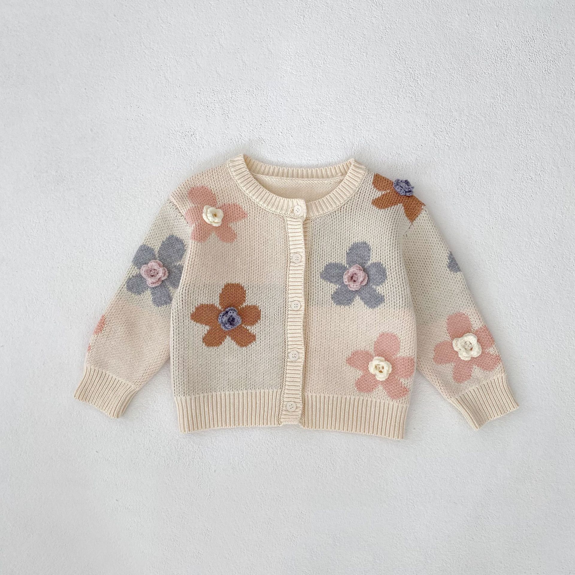2025 가을 아기 소녀 라운드 넥 카디건 소녀 옷 손으로 뜨개질 스웨터 코트 꽃 자카드 면사스토어 가기