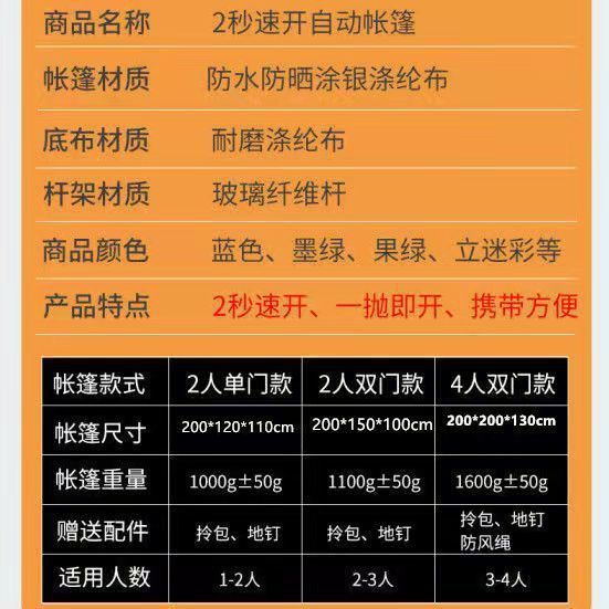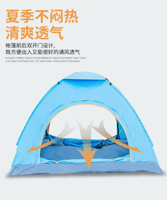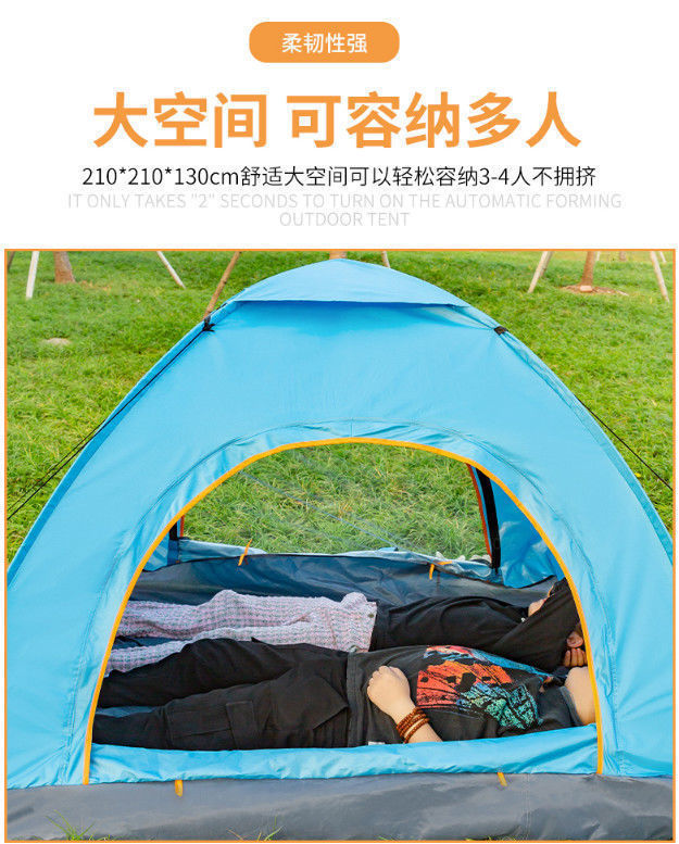 야외용 3~4인용 자동 캠핑 텐트, 2인용 야외용 두꺼운 퀵 오픈 방풍 및 자외선 차단 텐트