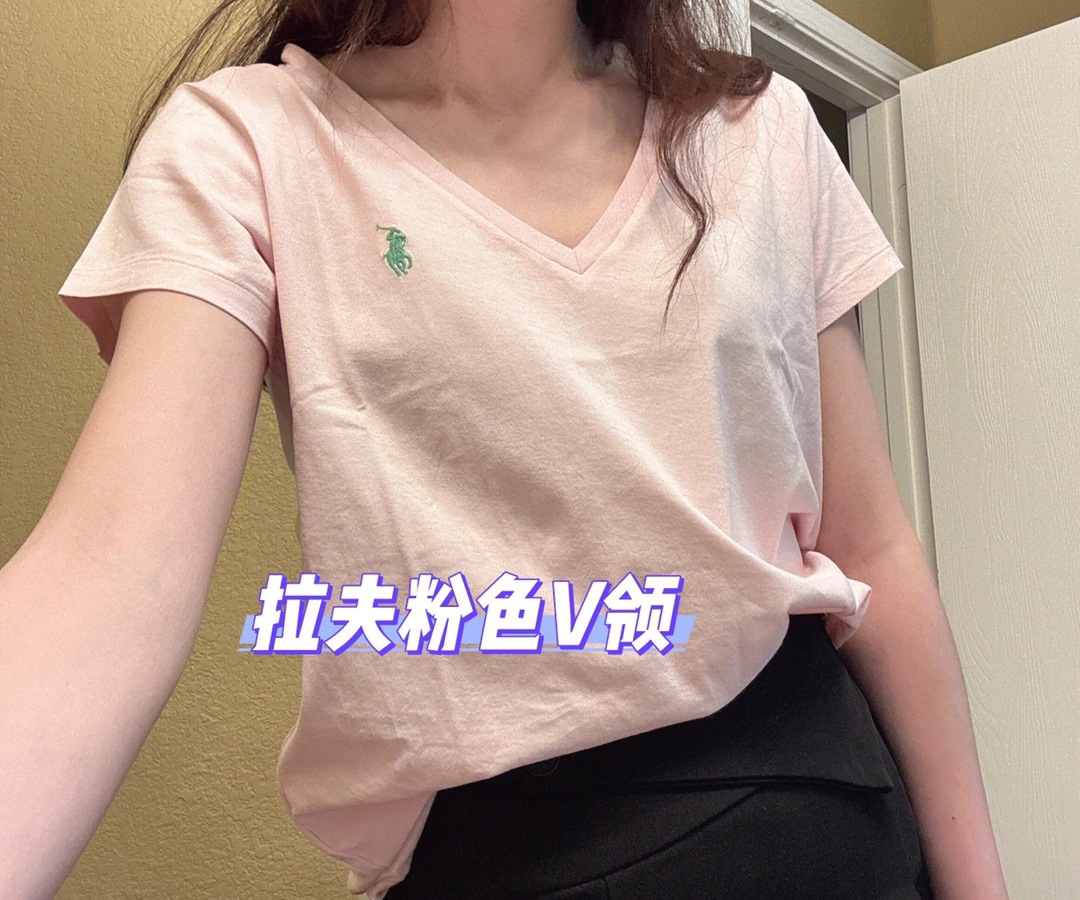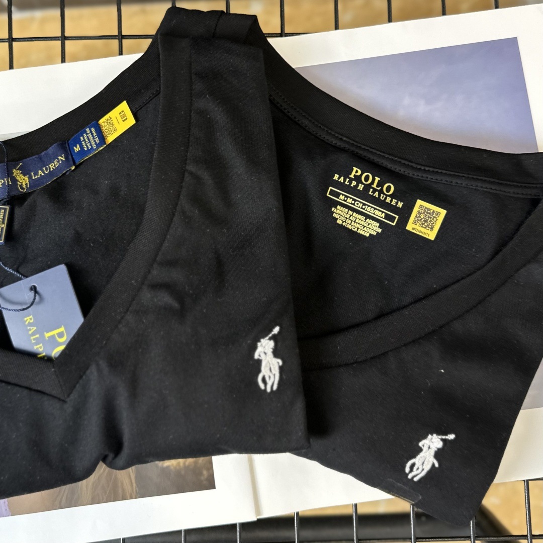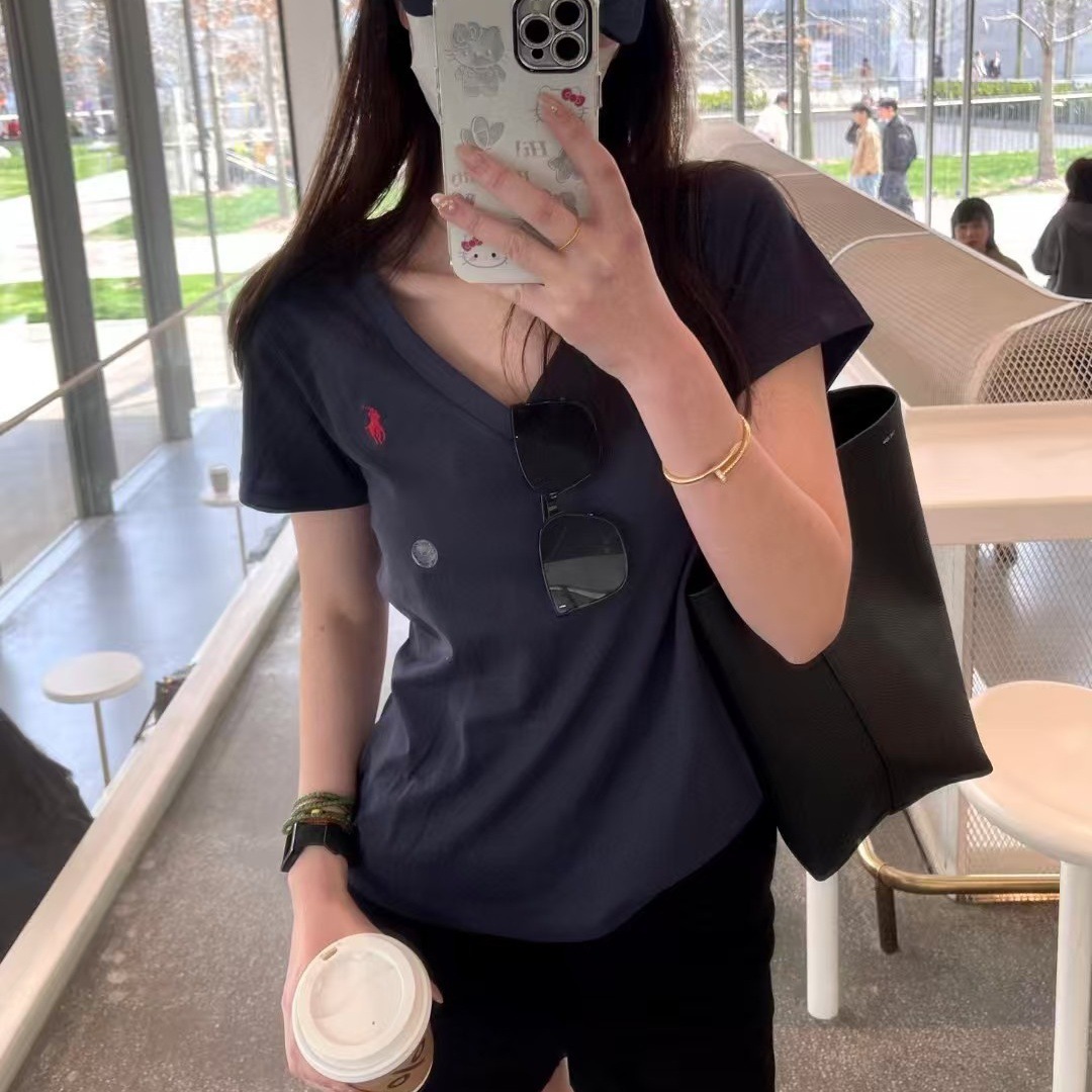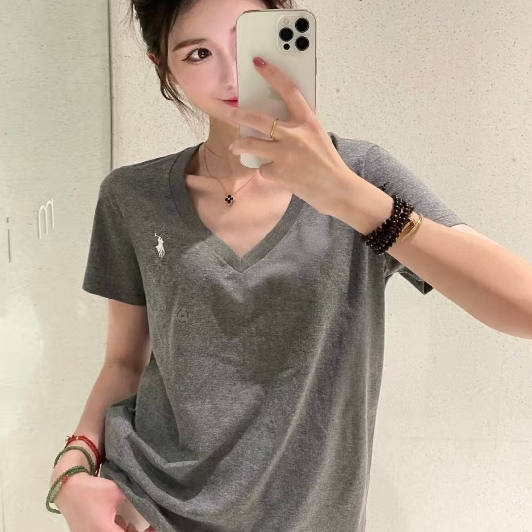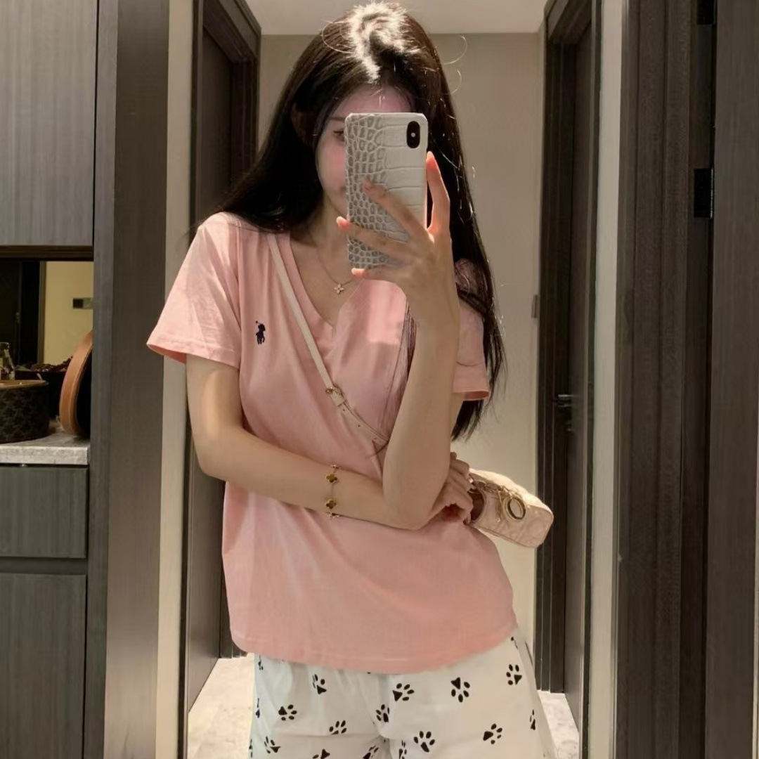 26 오리지널 수출용품, 스캔코드가 있는 100% 면 자수 포니 로고 V넥 티셔츠, 편안하고 얇고 통기성이 좋은 심플한 여성용 상의