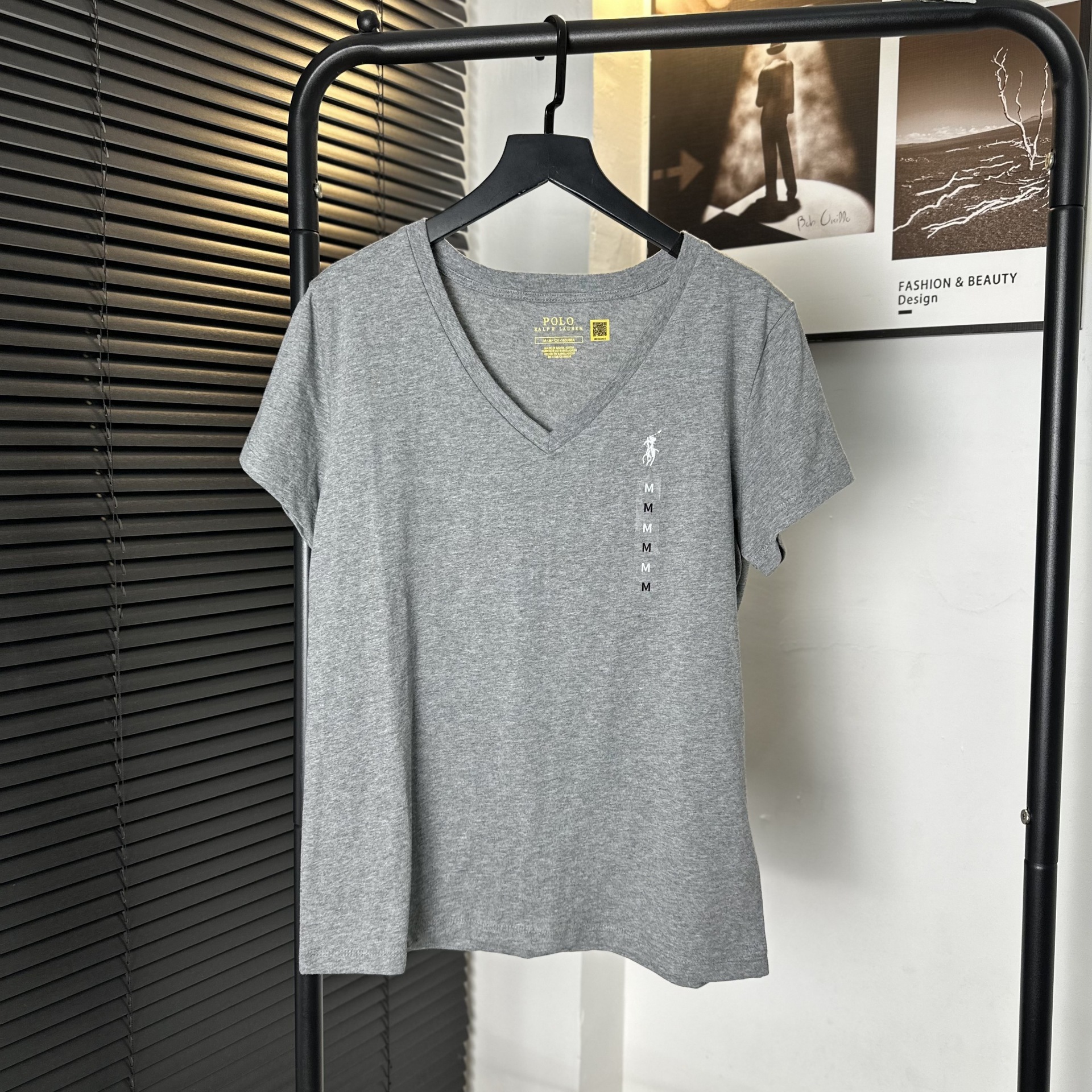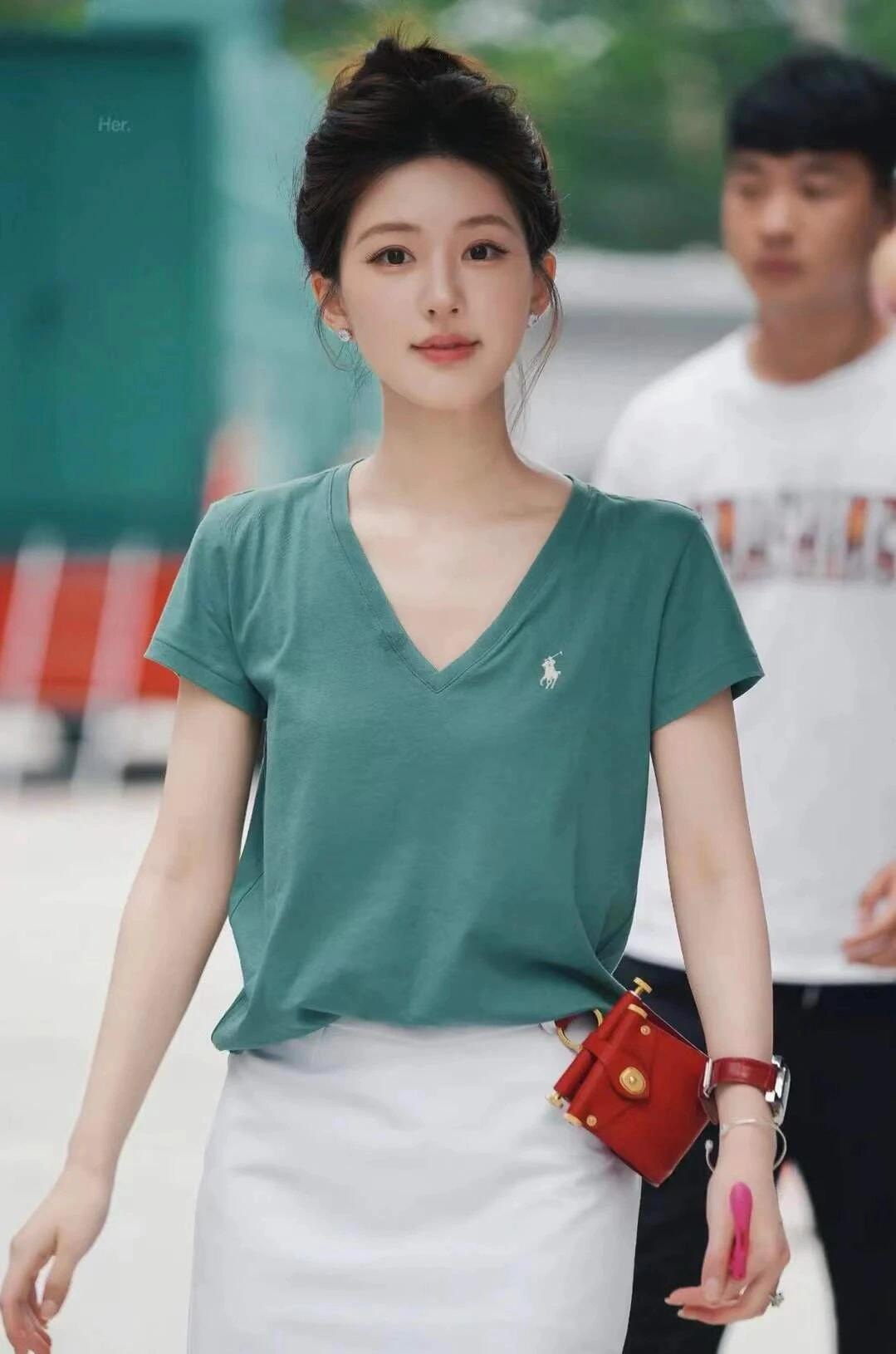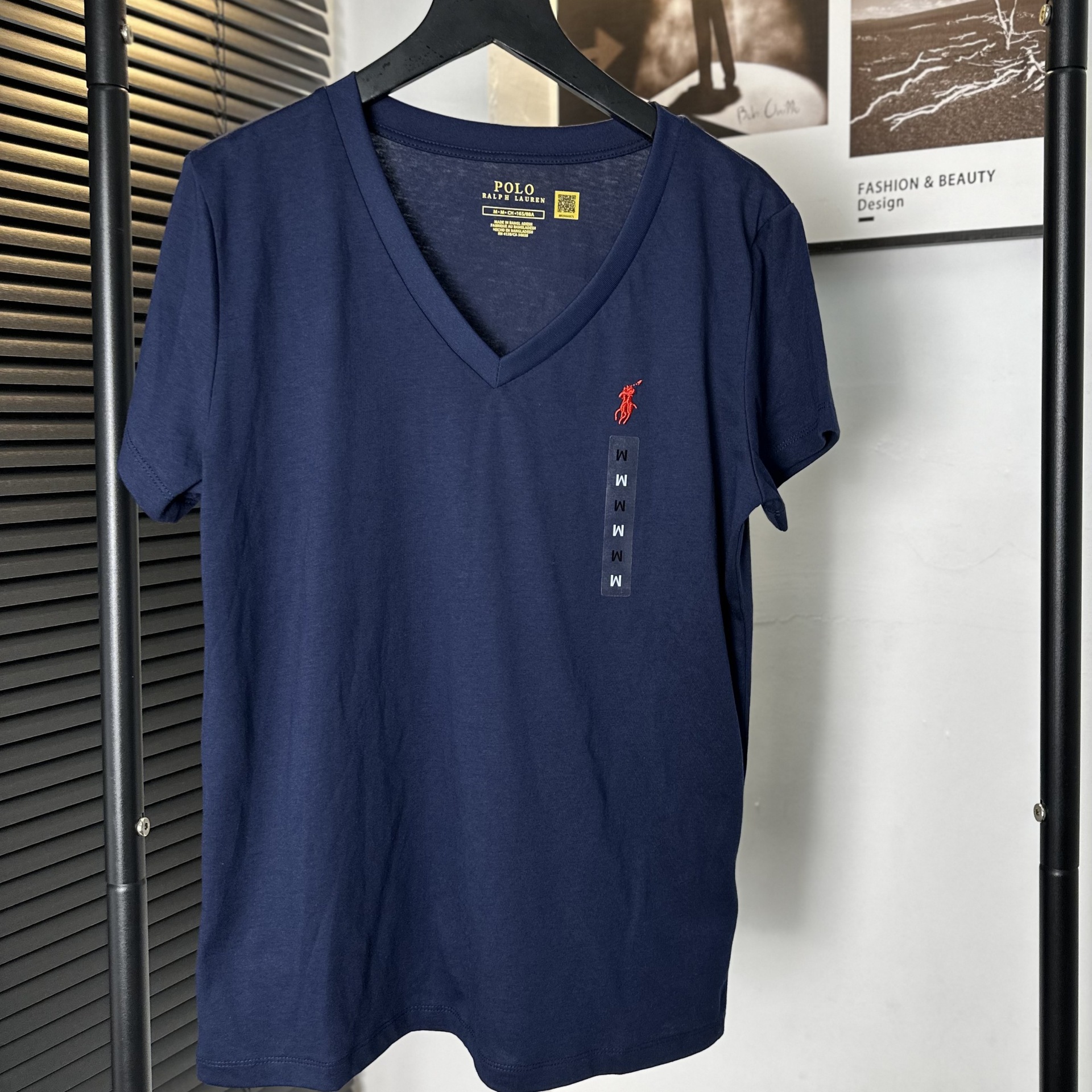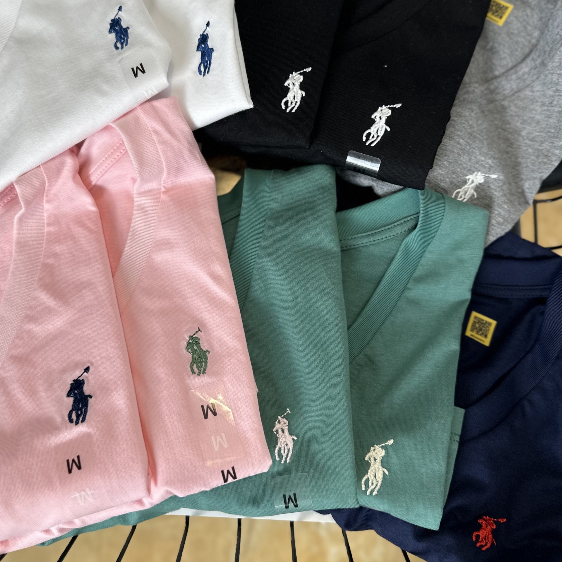 26 오리지널 수출용품, 스캔코드가 있는 100% 면 자수 포니 로고 V넥 티셔츠, 편안하고 얇고 통기성이 좋은 심플한 여성용 상의