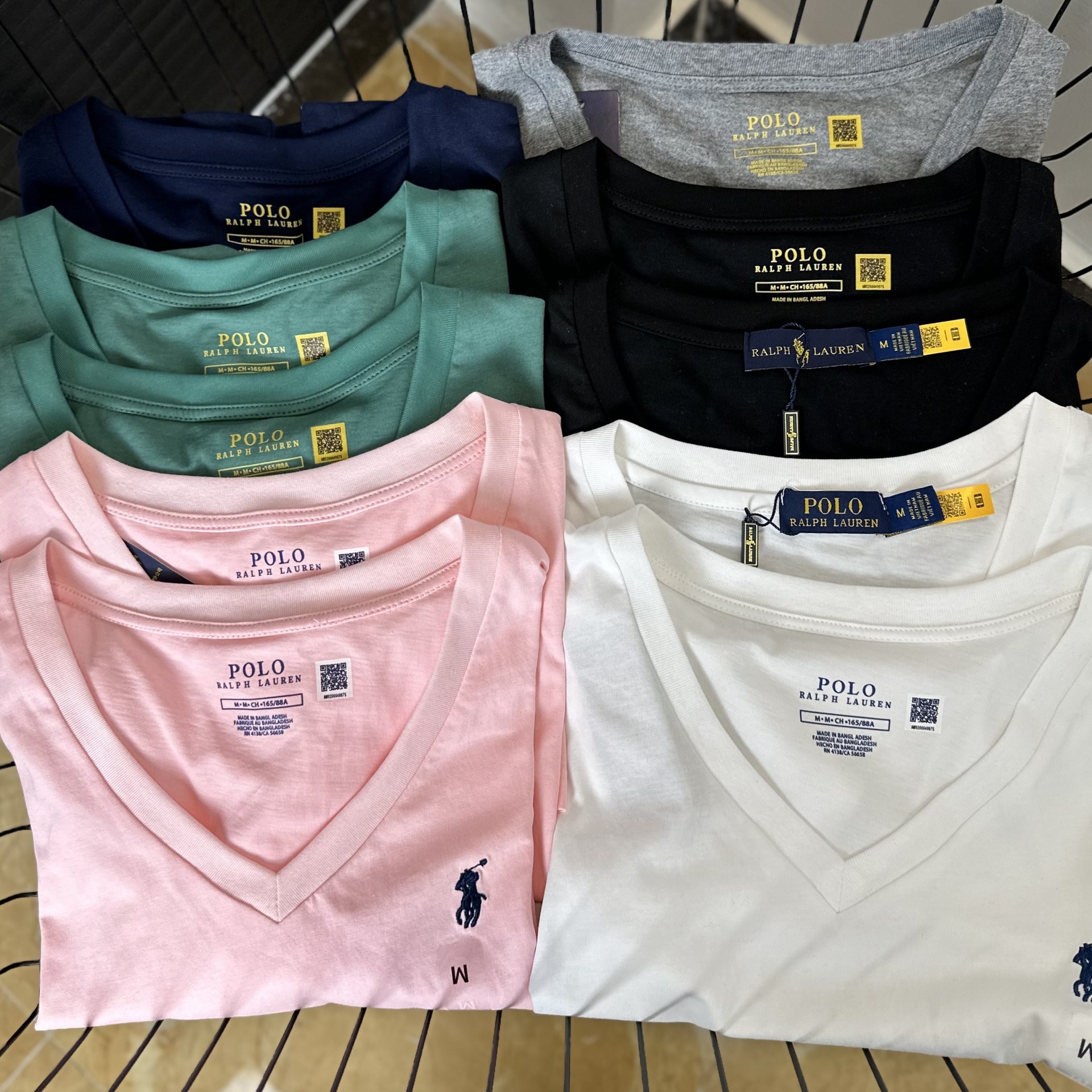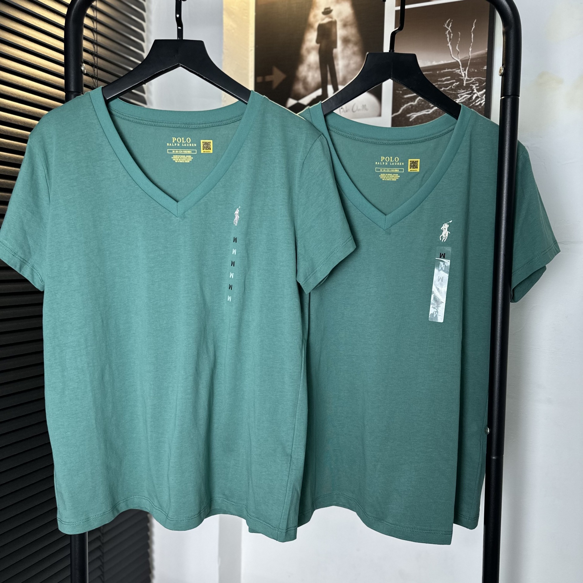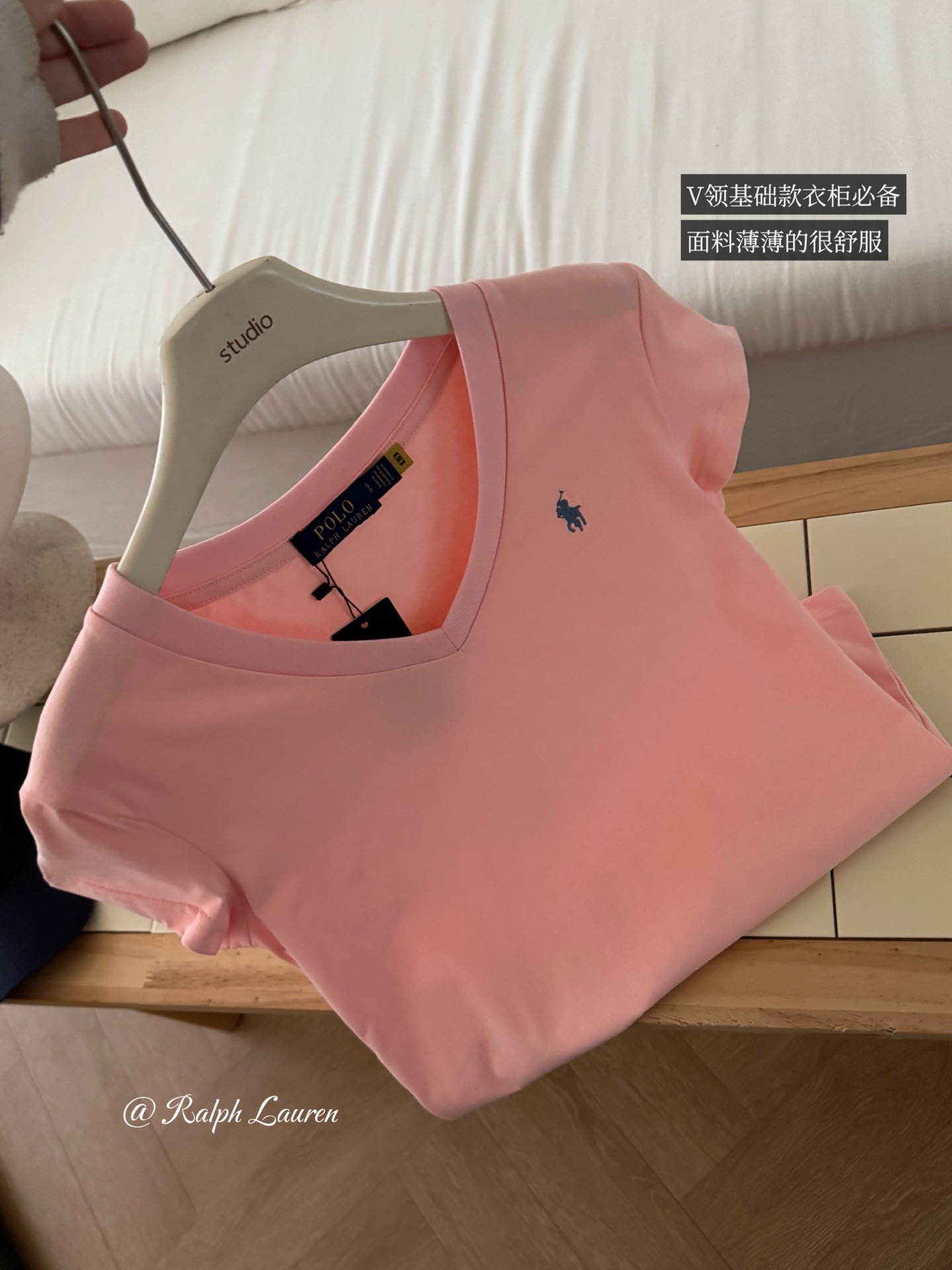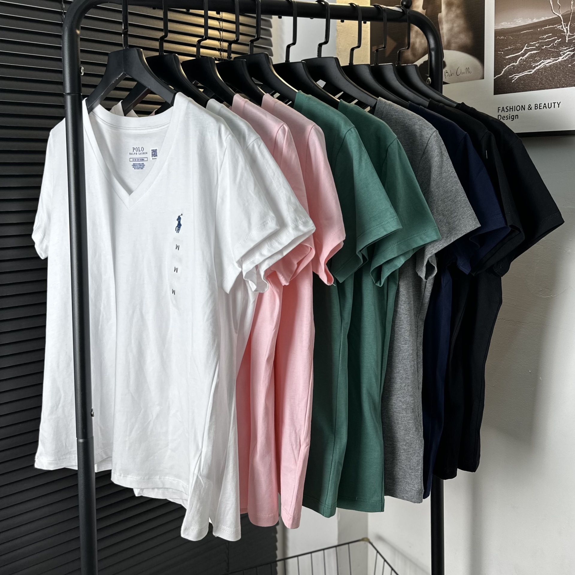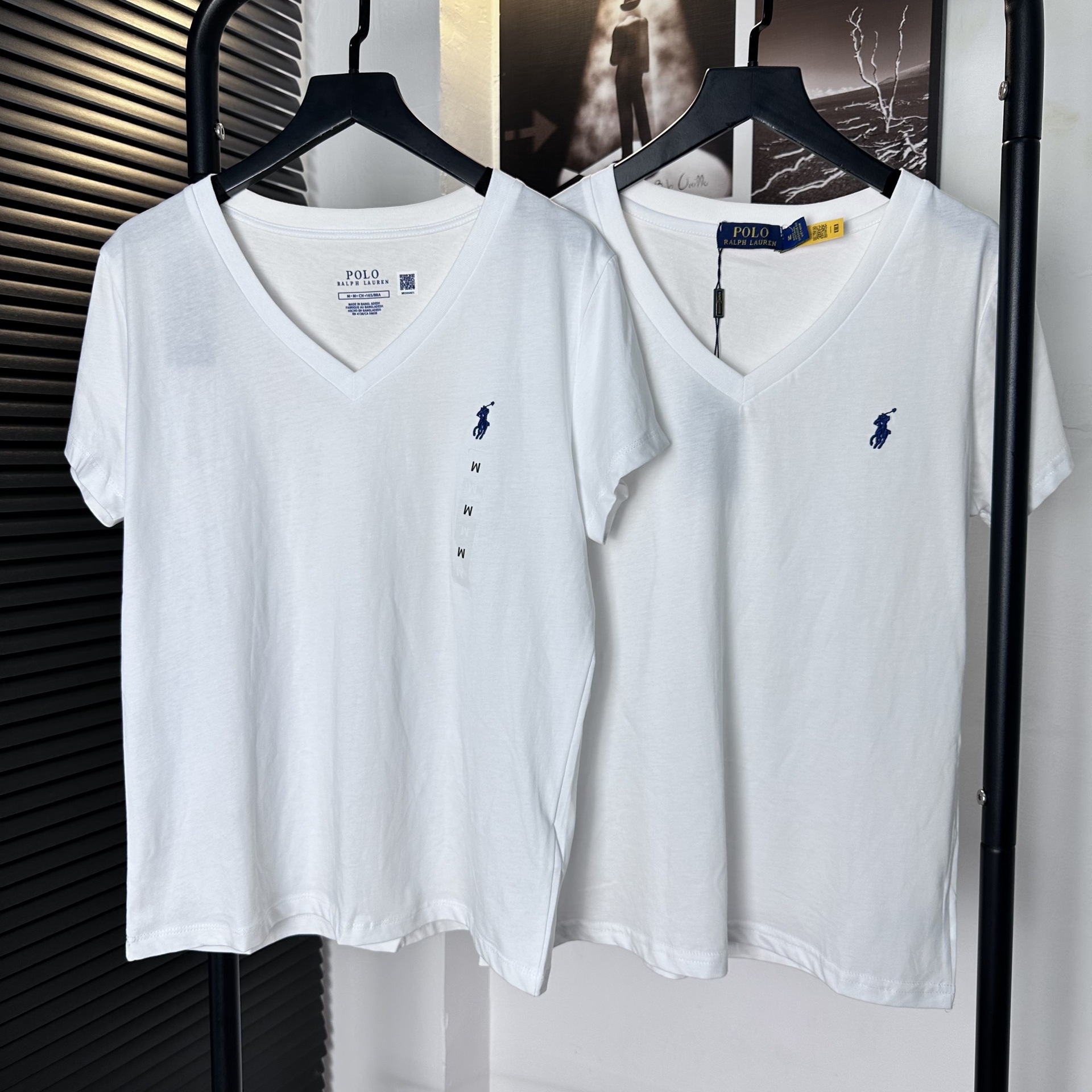 26 오리지널 수출용품, 스캔코드가 있는 100% 면 자수 포니 로고 V넥 티셔츠, 편안하고 얇고 통기성이 좋은 심플한 여성용 상의
