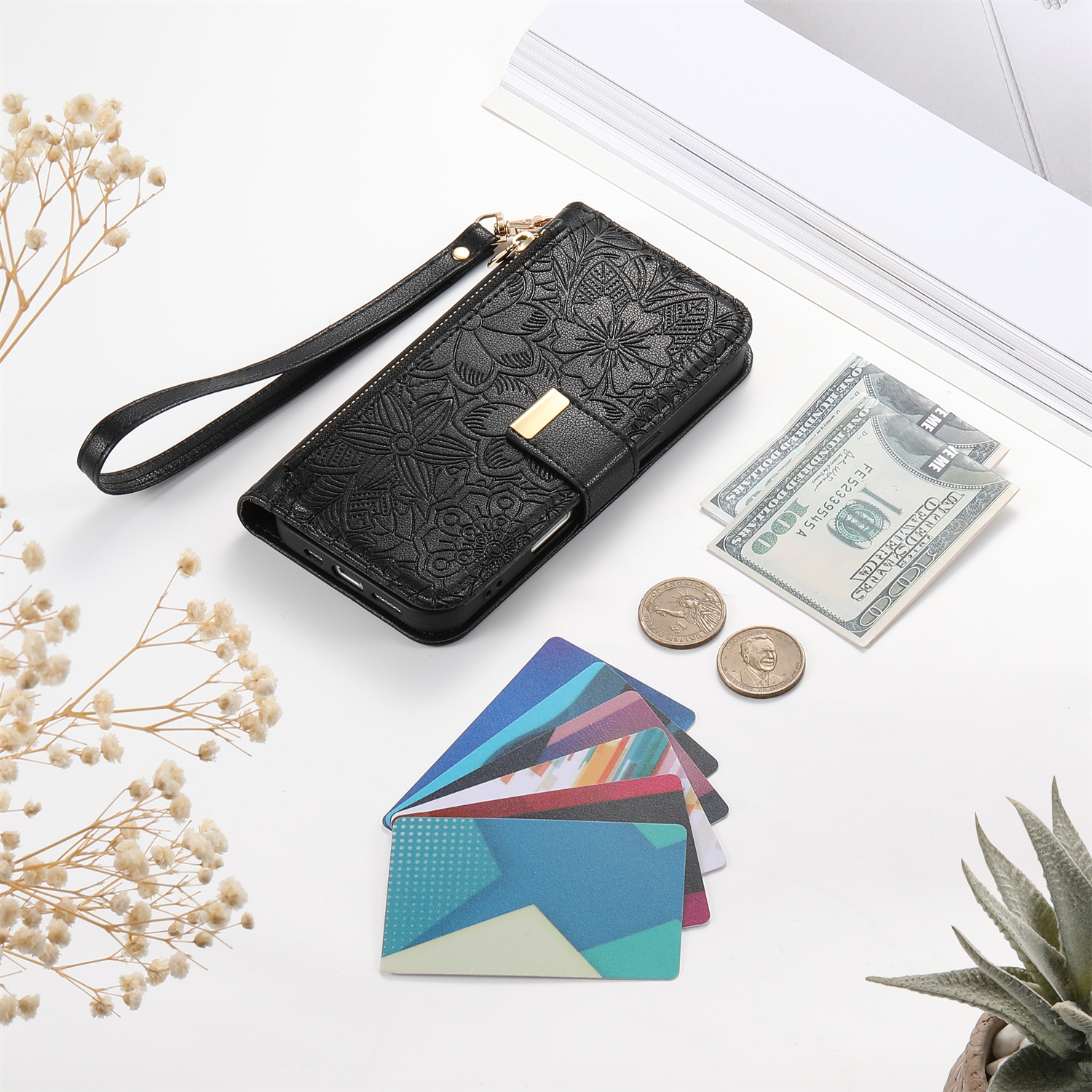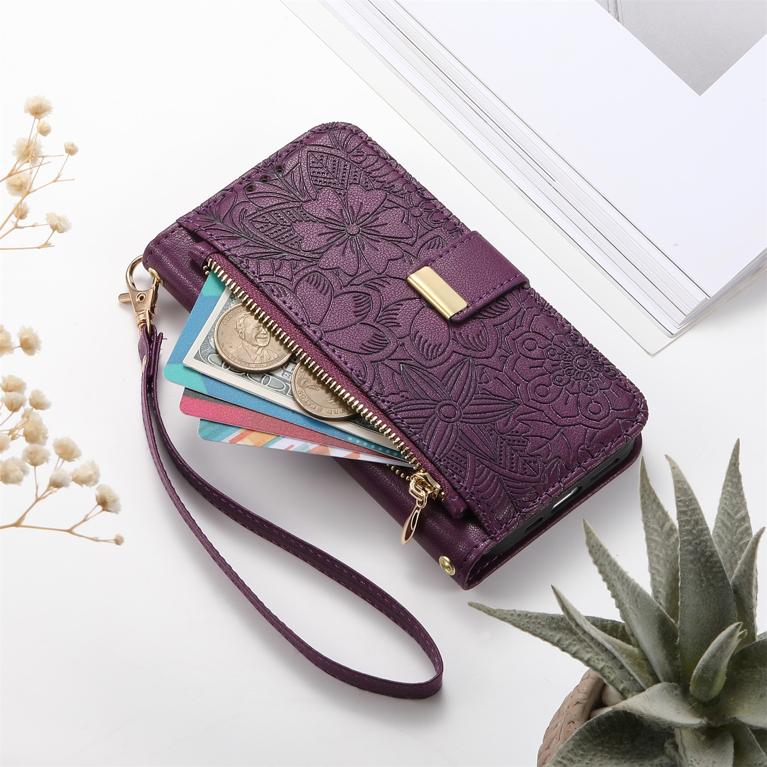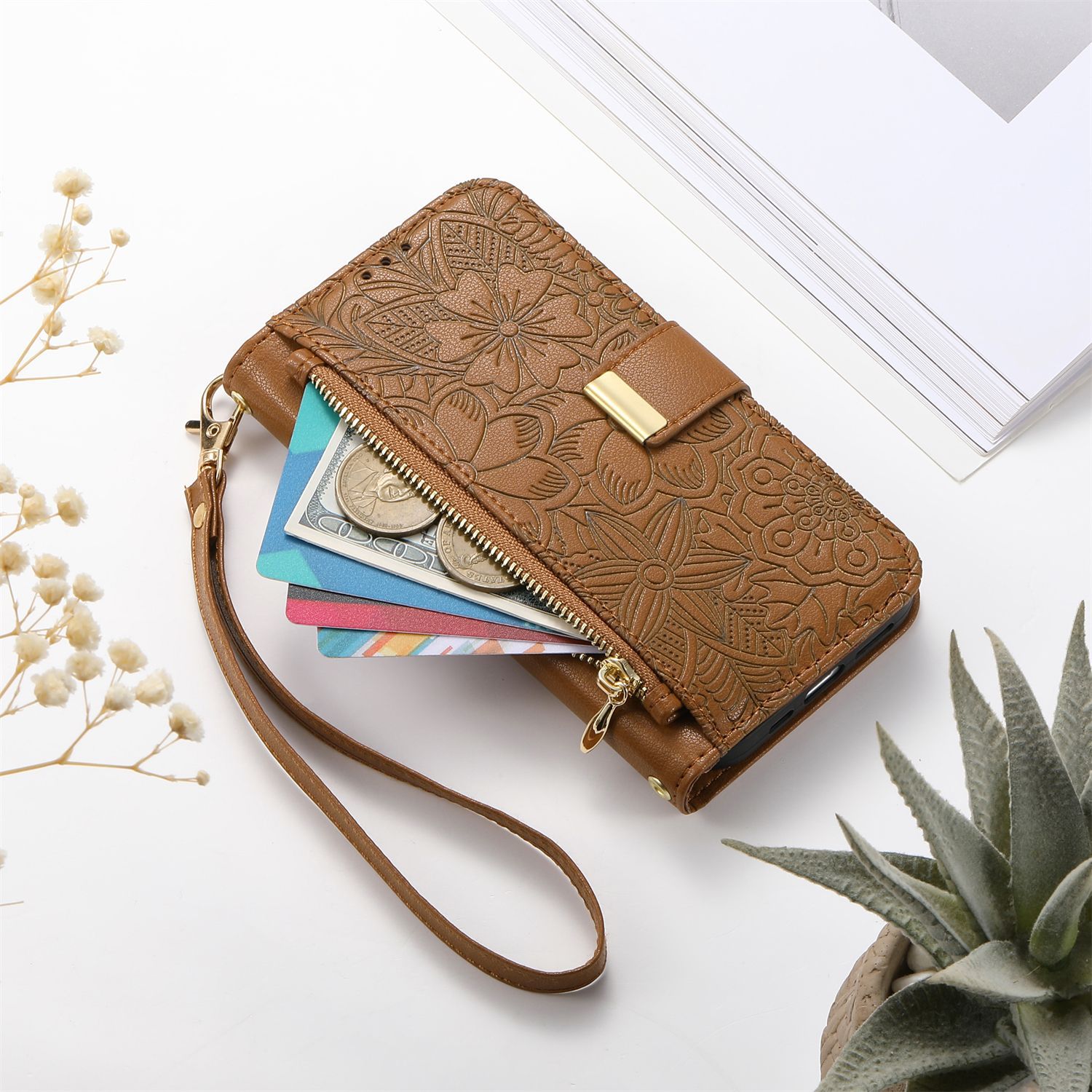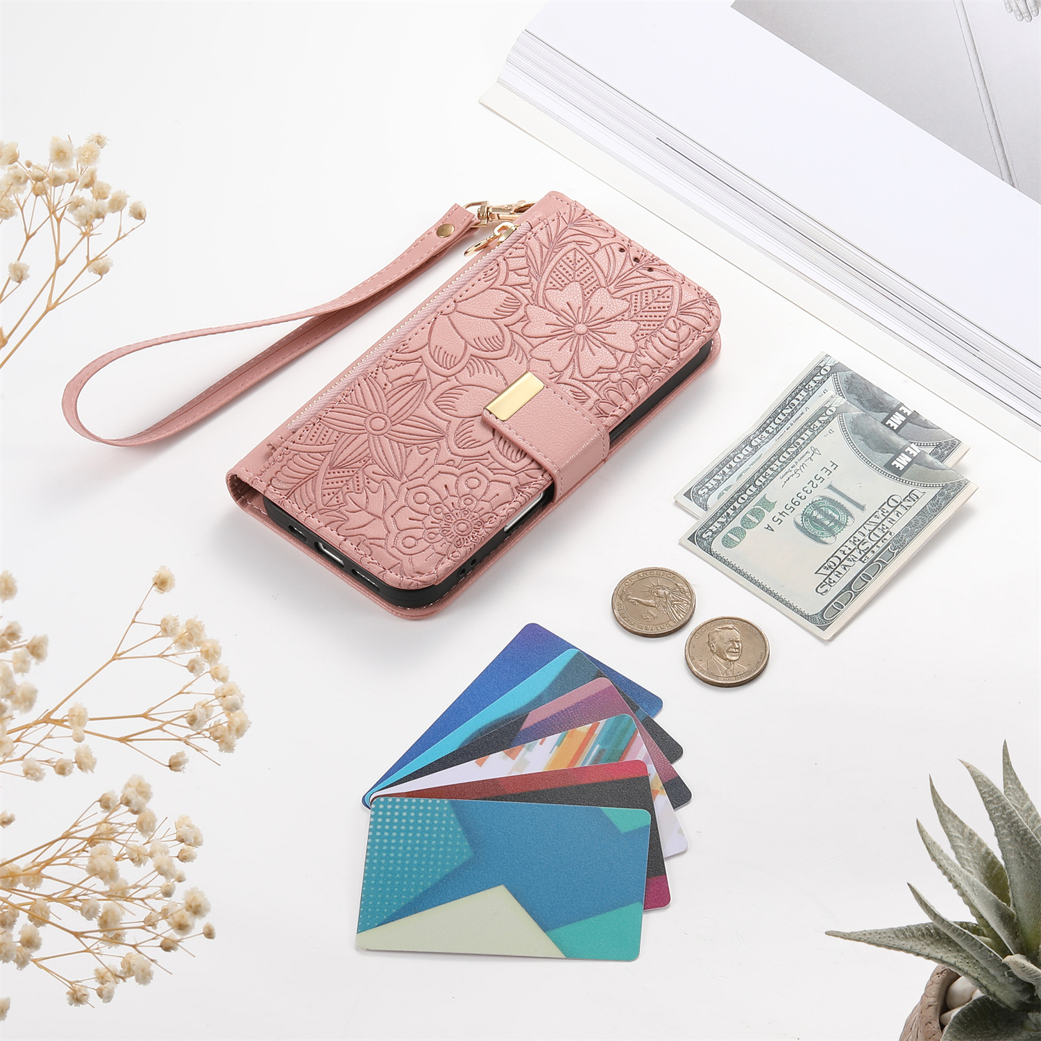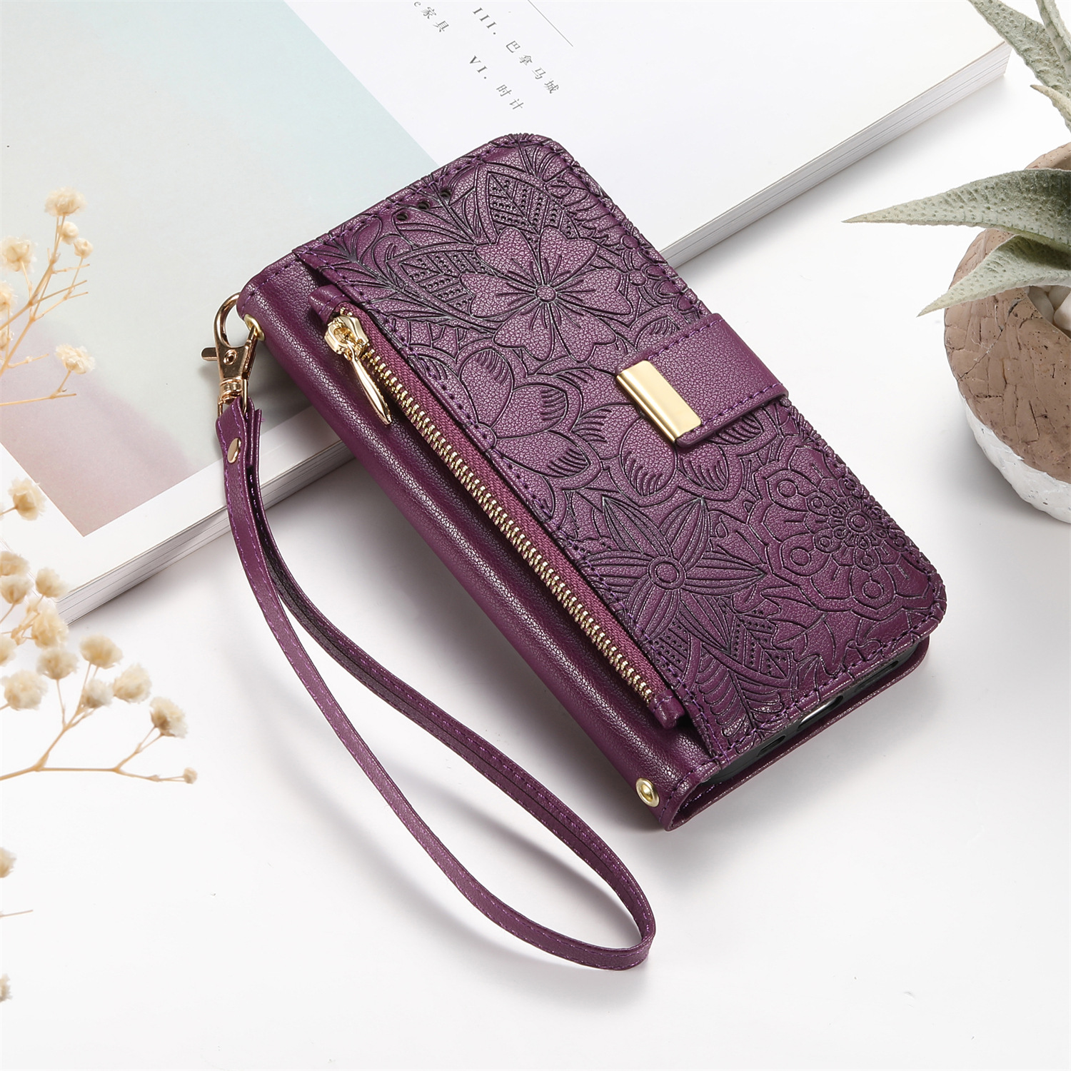 우아하고 세련된 아이폰17 플립폰 가죽 케이스, 애플17 폰케이스, 꽃과 잎 디자인, 16 지갑형 케이스, 15 케이스스토어 가기