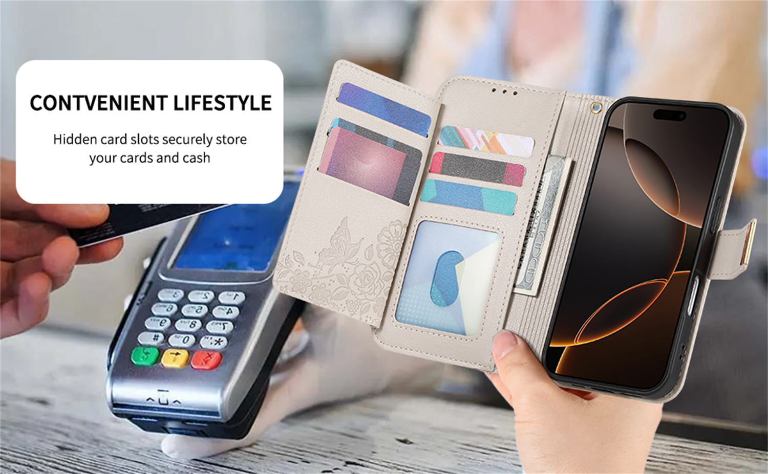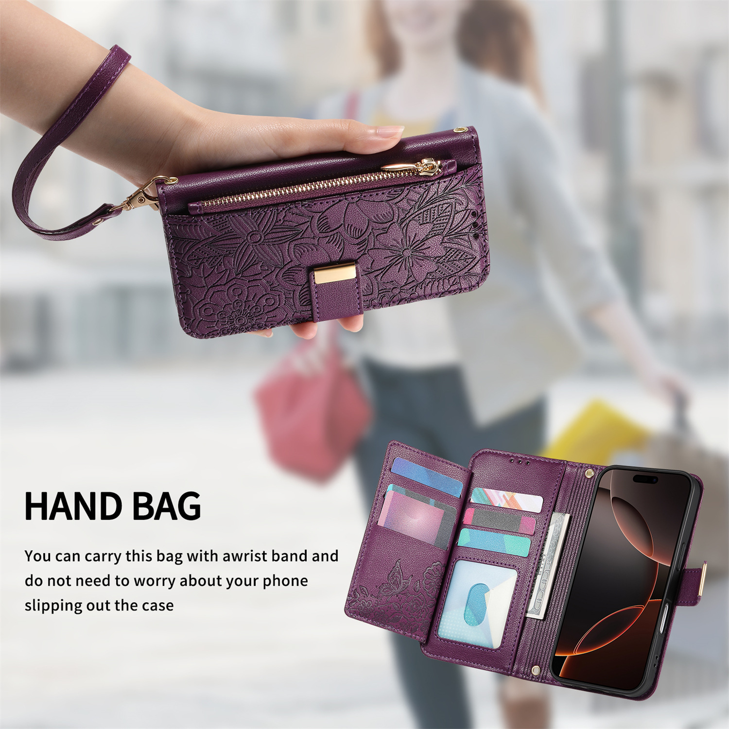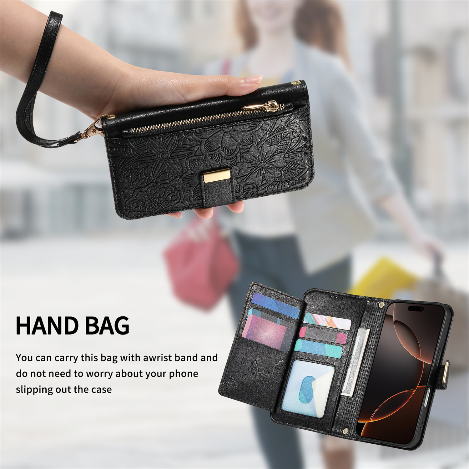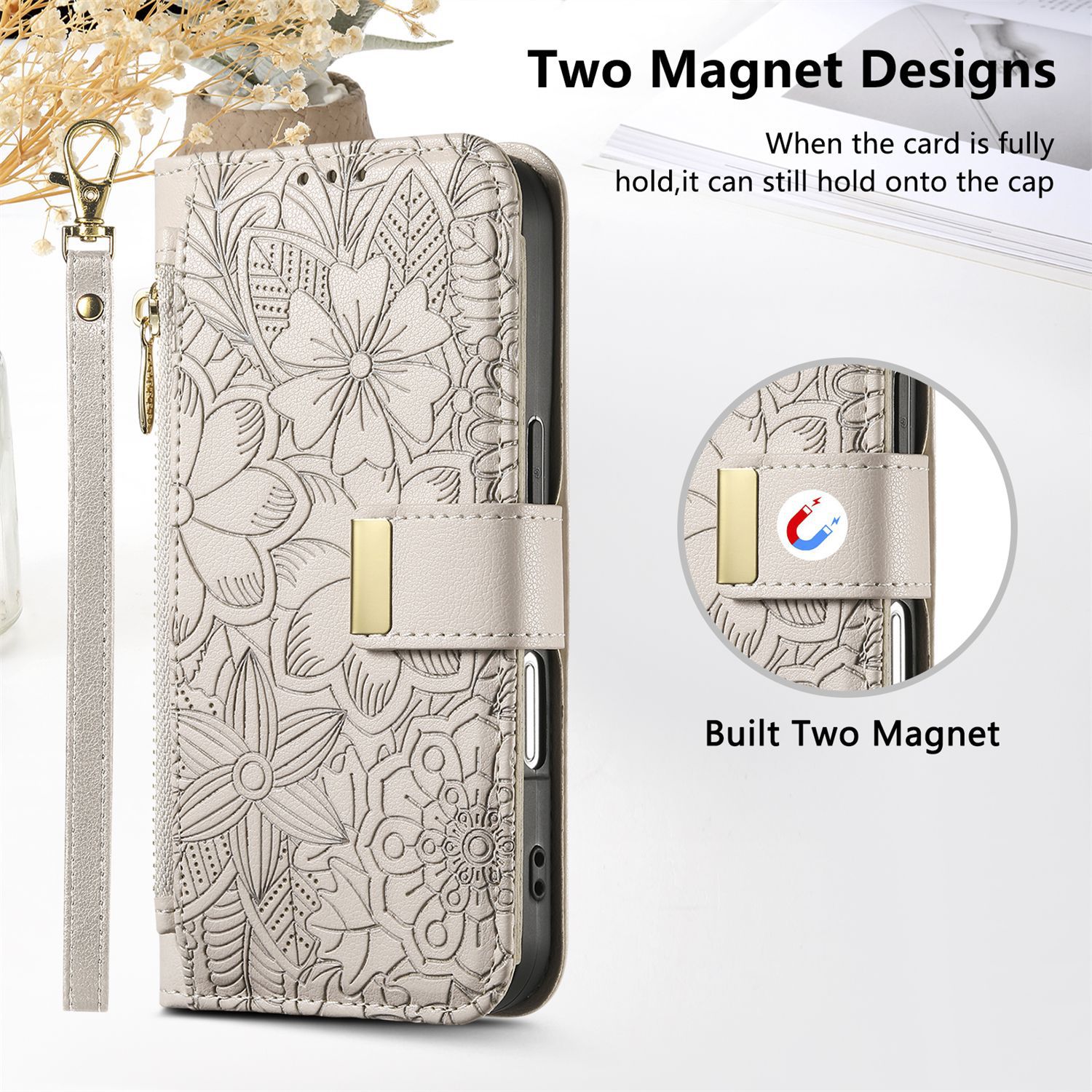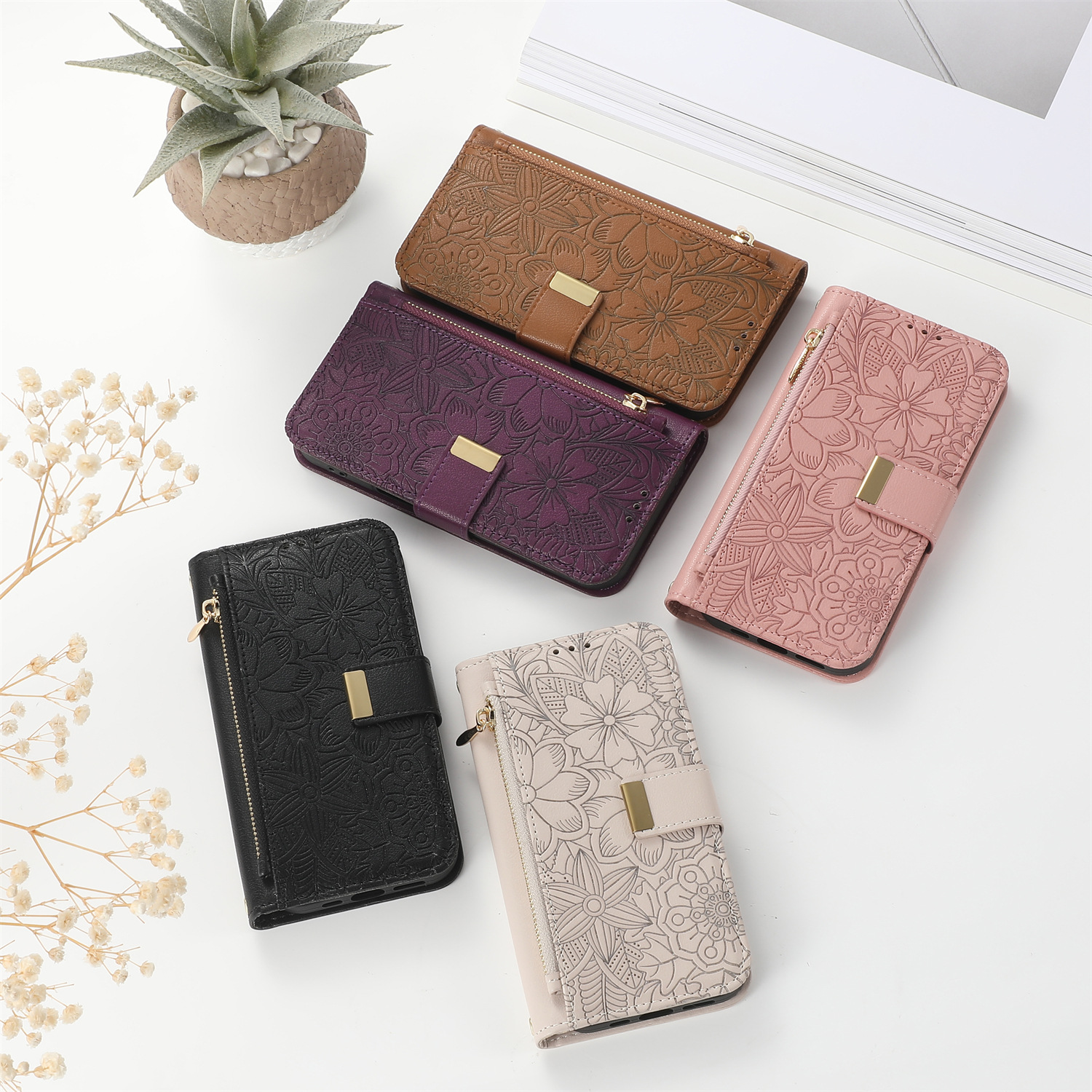 우아하고 세련된 아이폰17 플립폰 가죽 케이스, 애플17 폰케이스, 꽃과 잎 디자인, 16 지갑형 케이스, 15 케이스스토어 가기