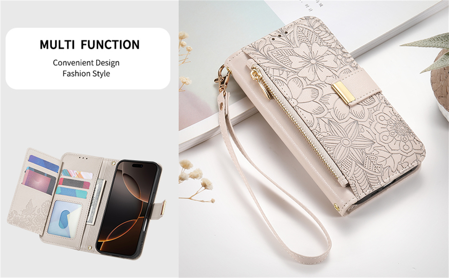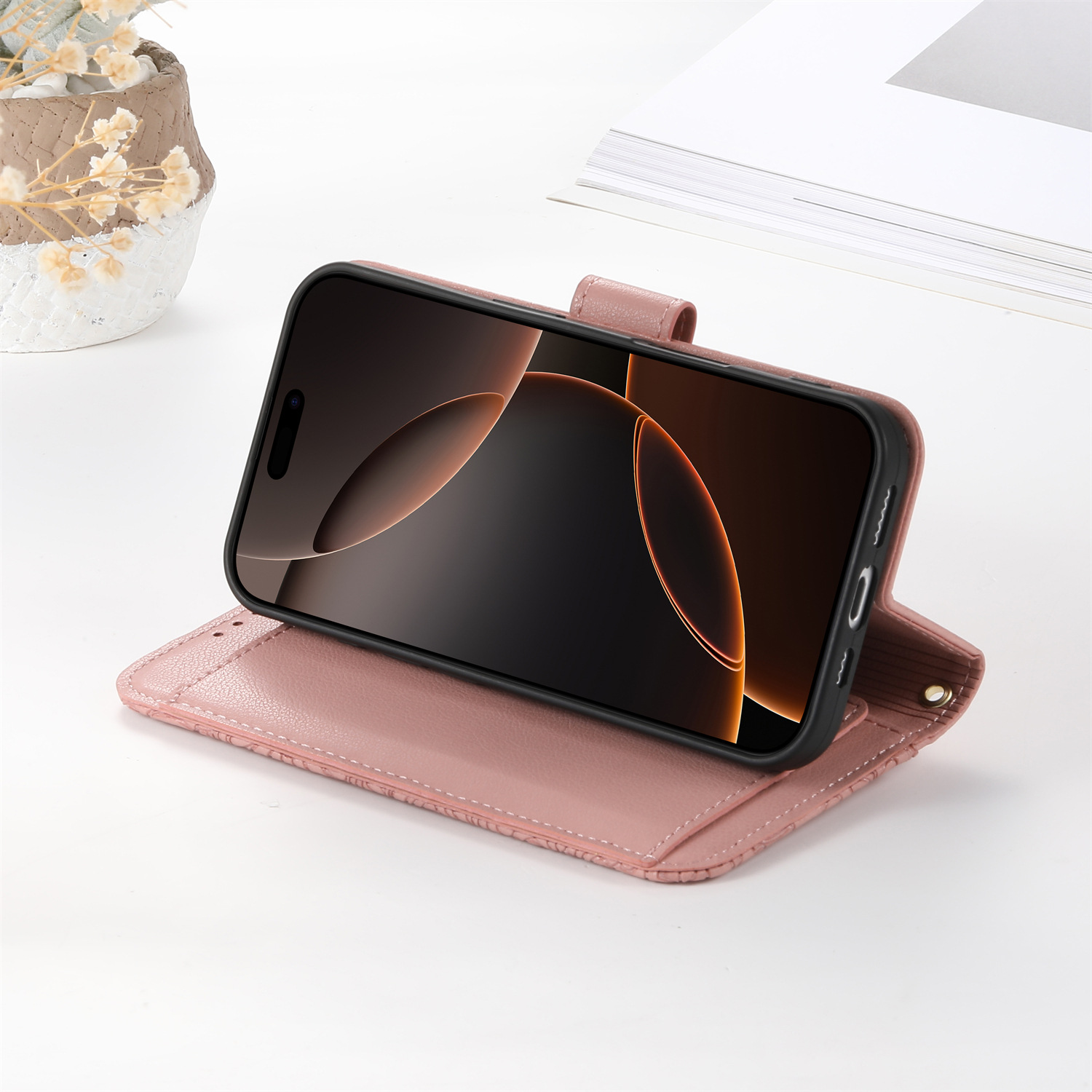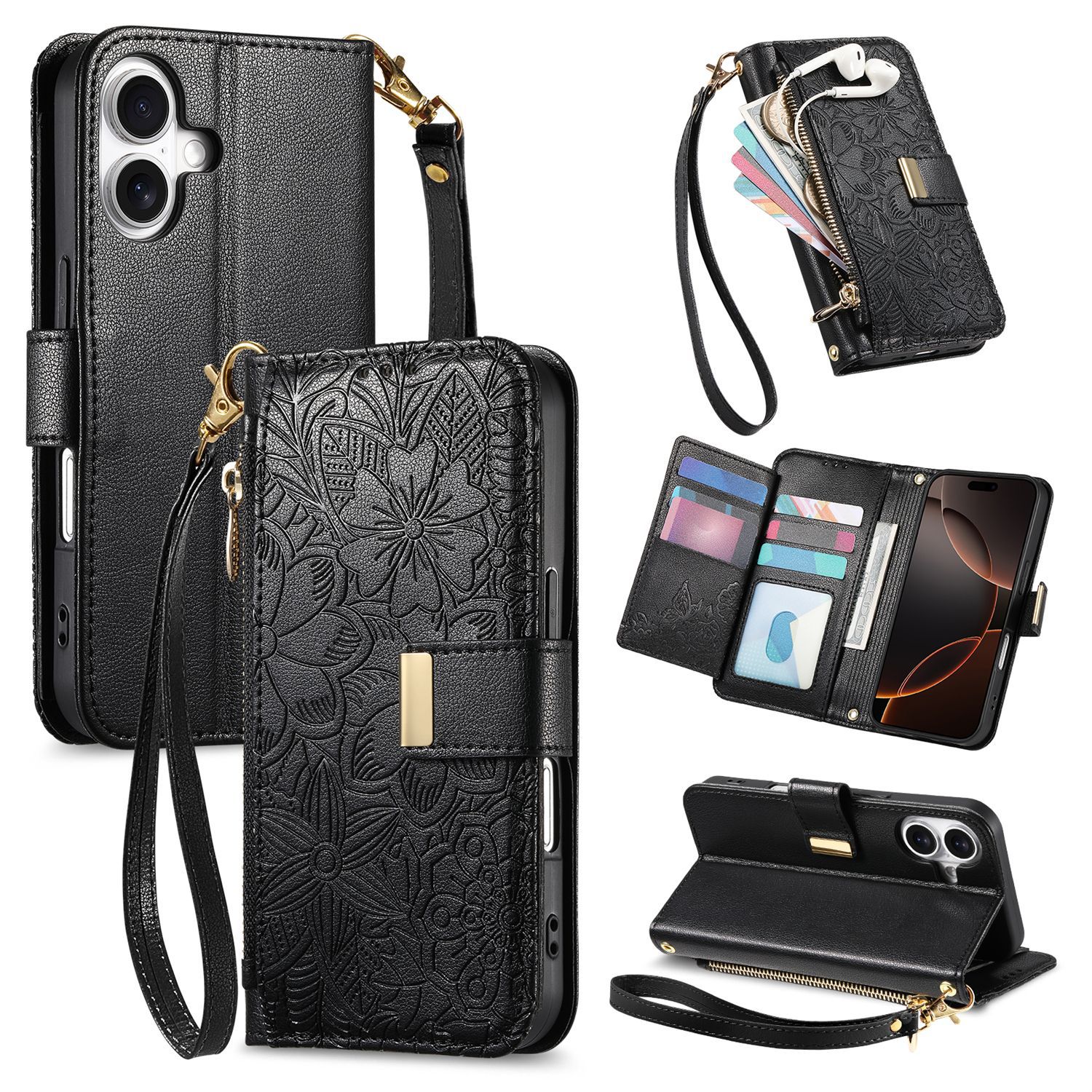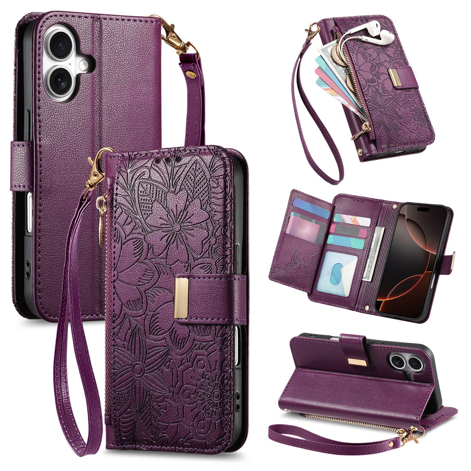 우아하고 세련된 아이폰17 플립폰 가죽 케이스, 애플17 폰케이스, 꽃과 잎 디자인, 16 지갑형 케이스, 15 케이스