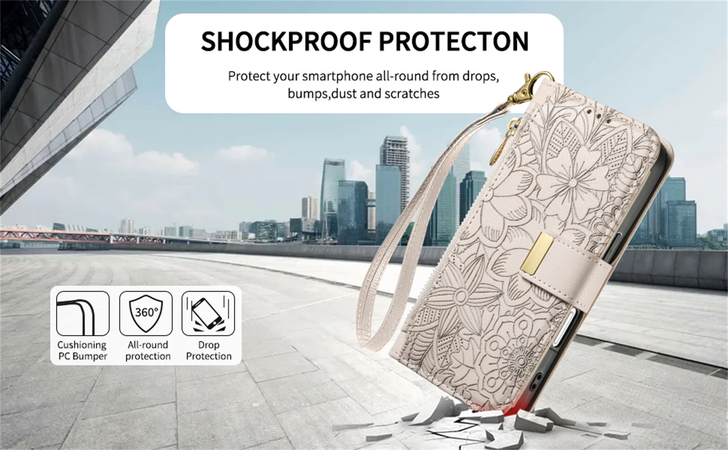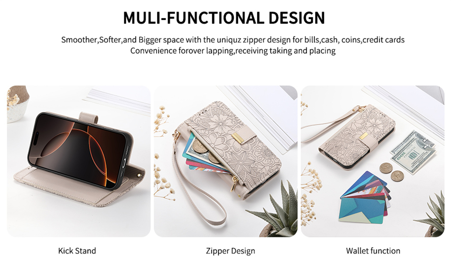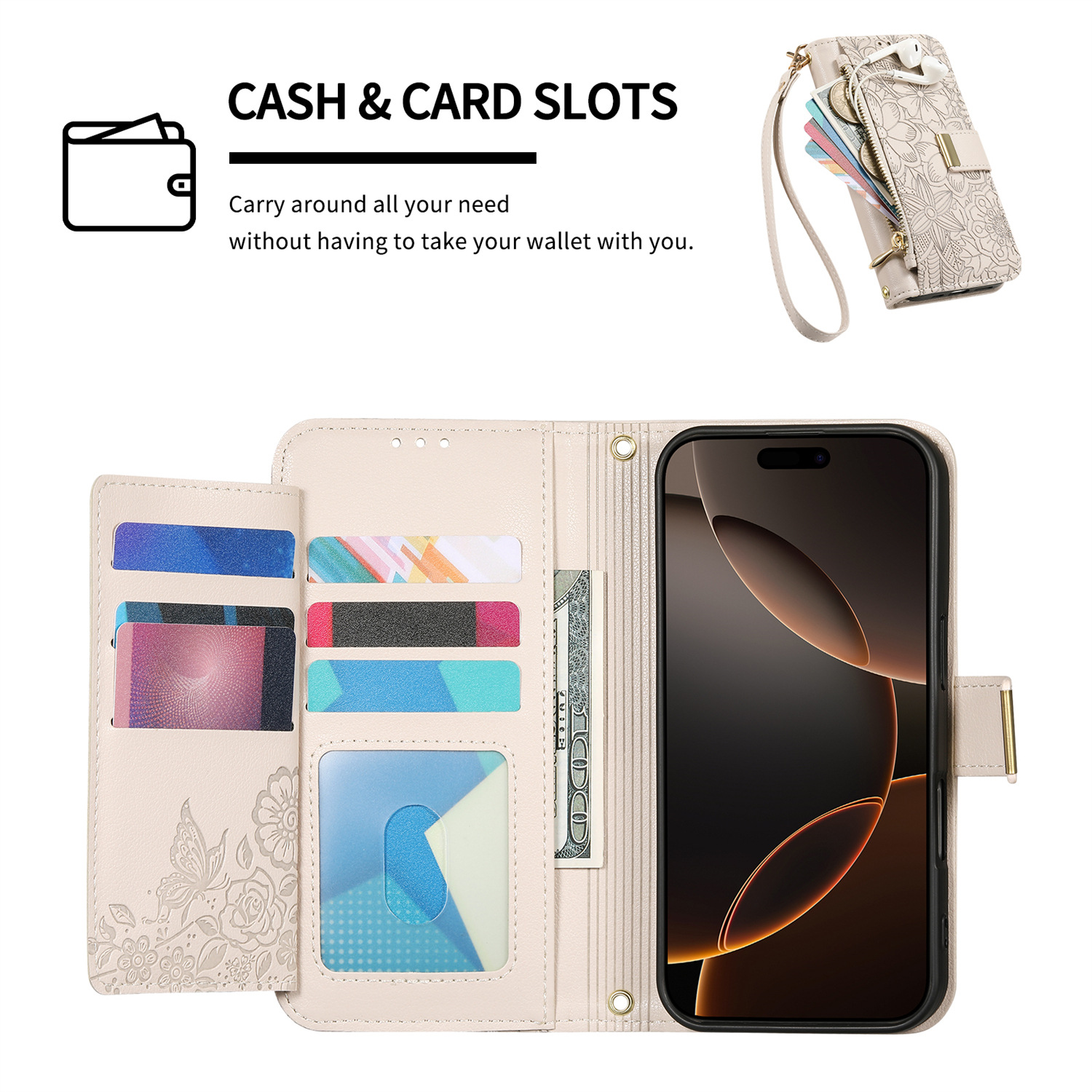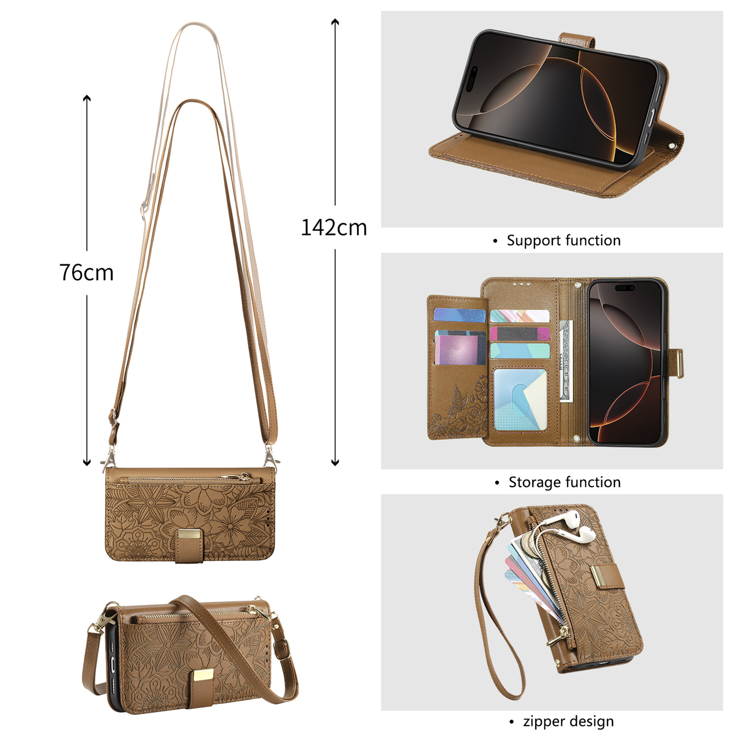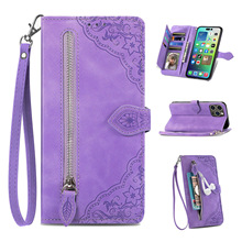 우아하고 세련된 아이폰17 플립폰 가죽 케이스, 애플17 폰케이스, 꽃과 잎 디자인, 16 지갑형 케이스, 15 케이스