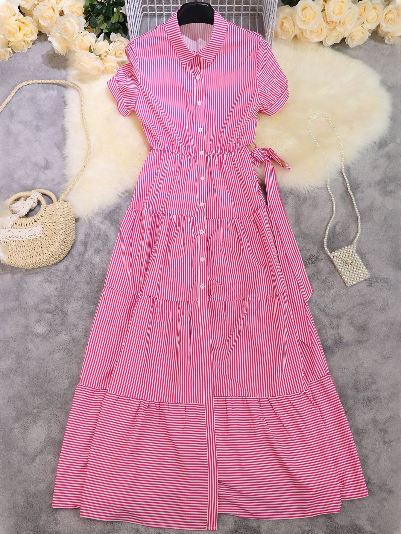 국경 간 아마존 대외 무역 2025 우아한 기질을 지닌 세련된 줄무늬 반팔 루즈한 중간 길이 드레스
