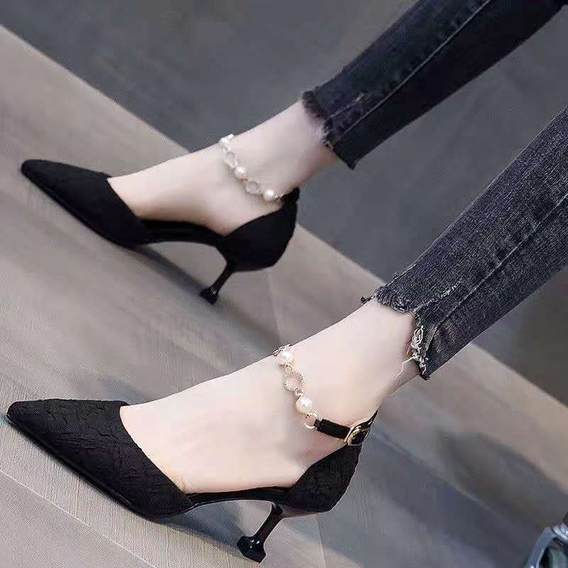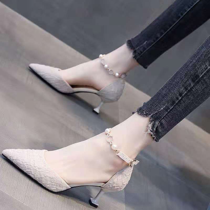 여성용 바오터우 샌들 트렌디 2025 봄 여름 신상 진주 스트랩 스틸레토 힐 요정 하이힐스토어 가기
