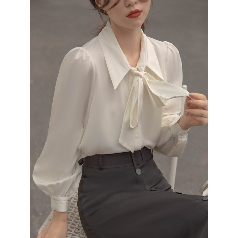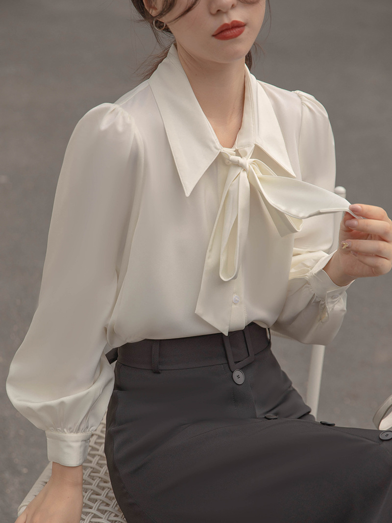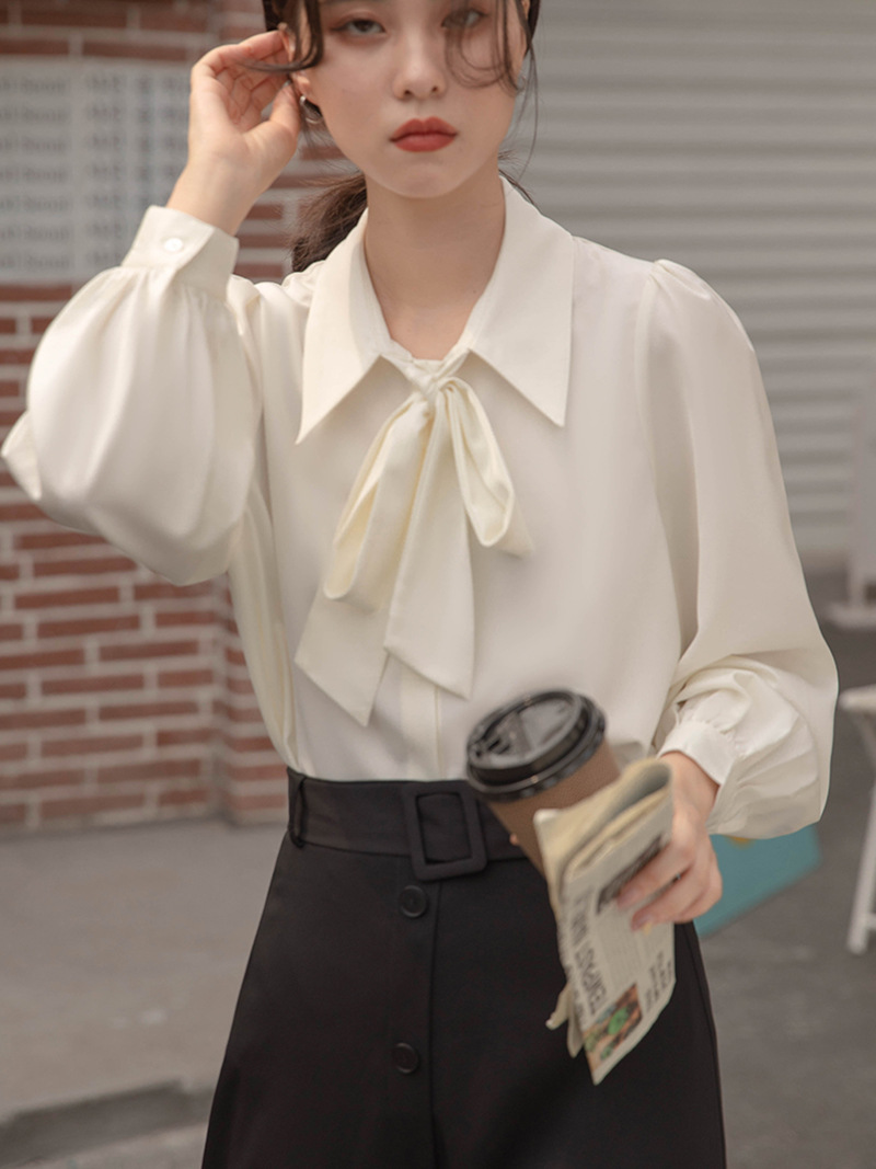 새로운 패션 랜턴 슬리브 기질 가을, 겨울 보우 셔츠 화이트 셔츠 여성 긴팔 레이스 업 디자인 전문