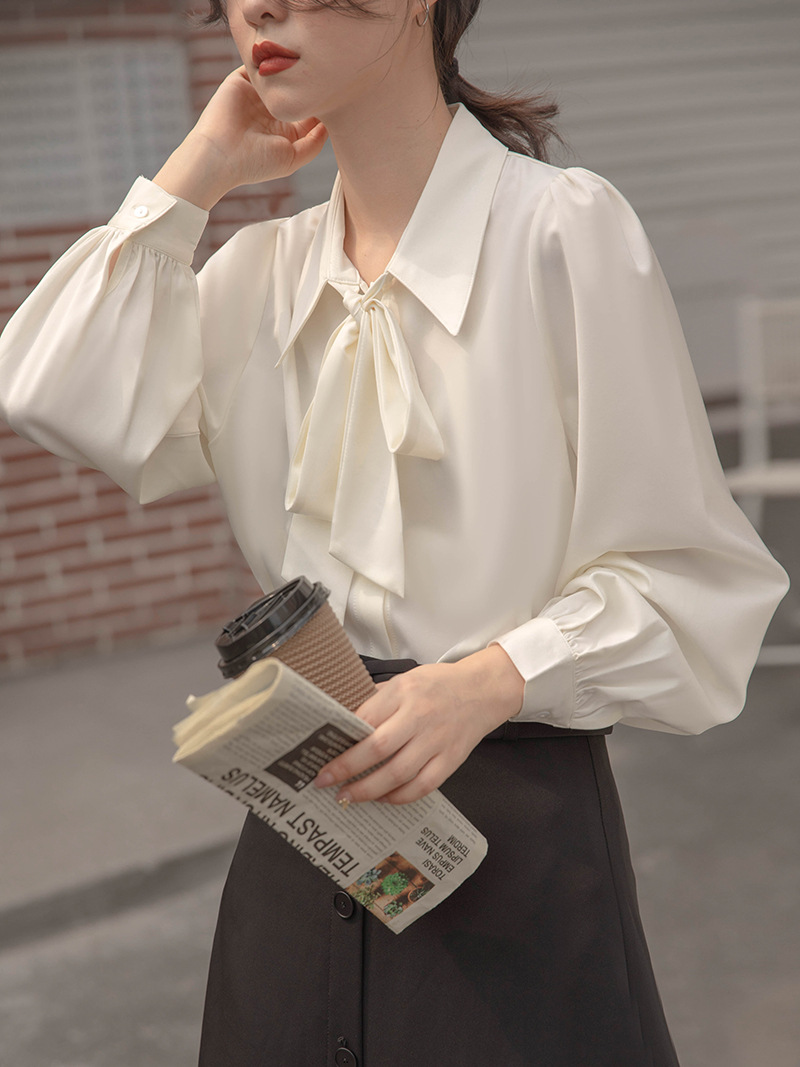 새로운 패션 랜턴 슬리브 기질 가을, 겨울 보우 셔츠 화이트 셔츠 여성 긴팔 레이스 업 디자인 전문스토어 가기