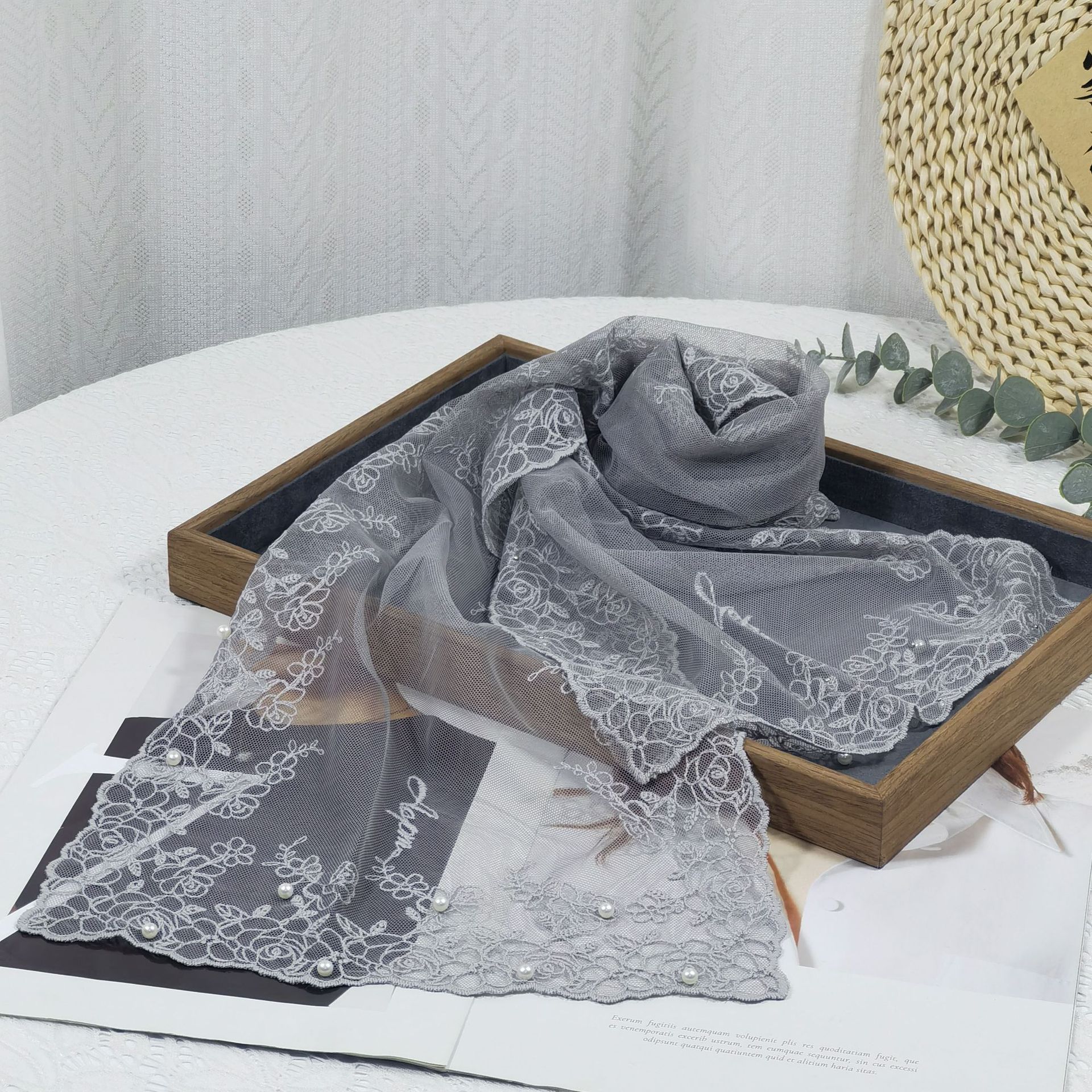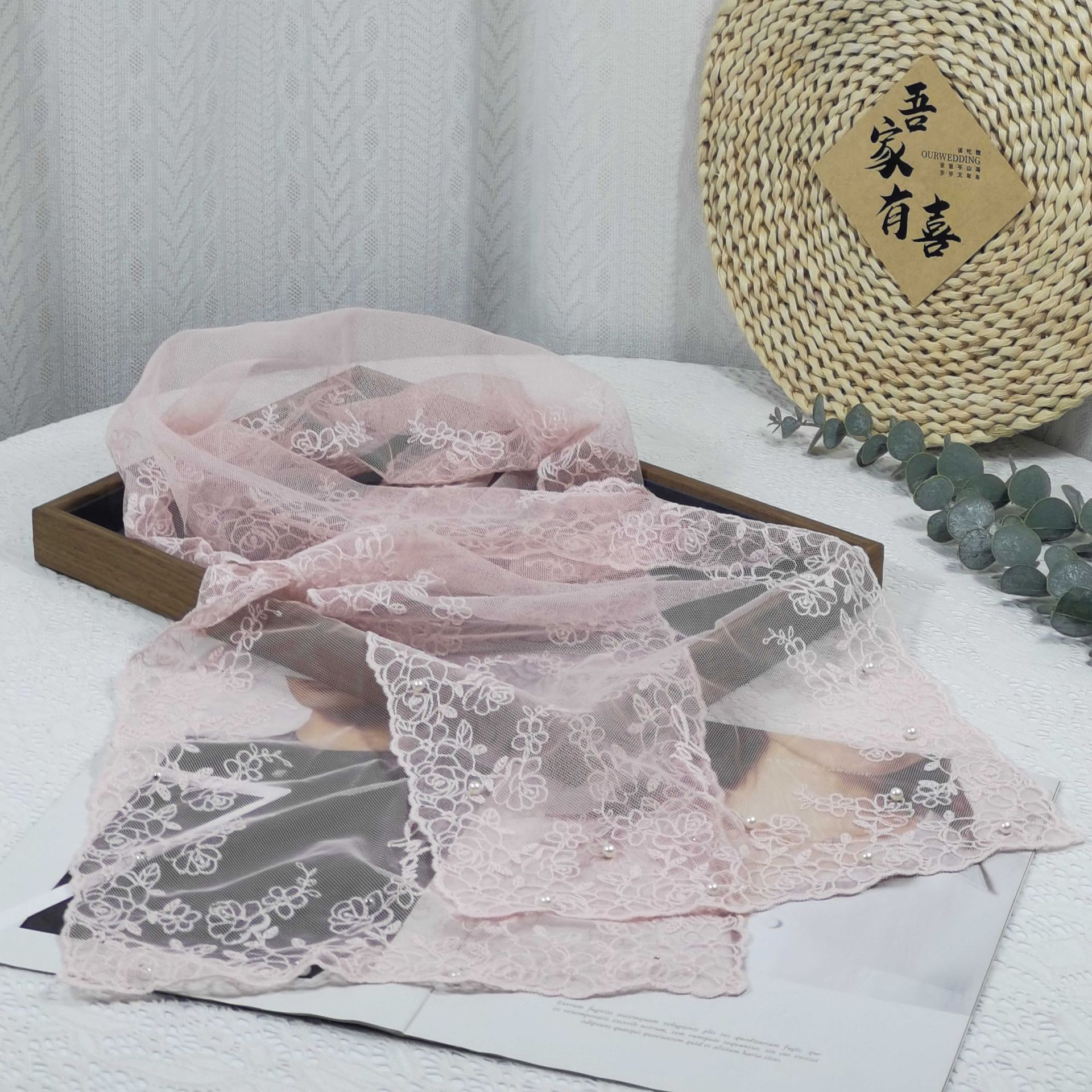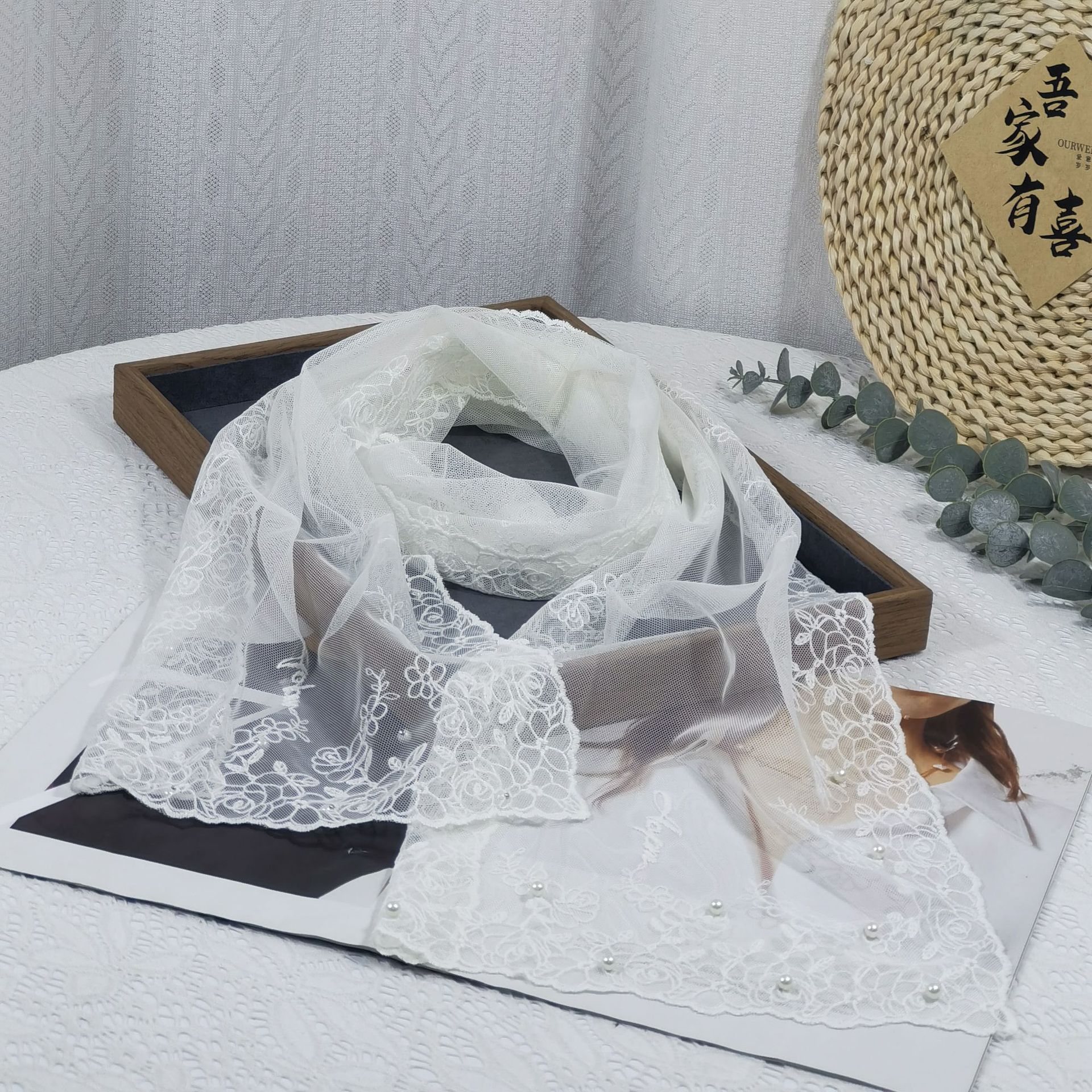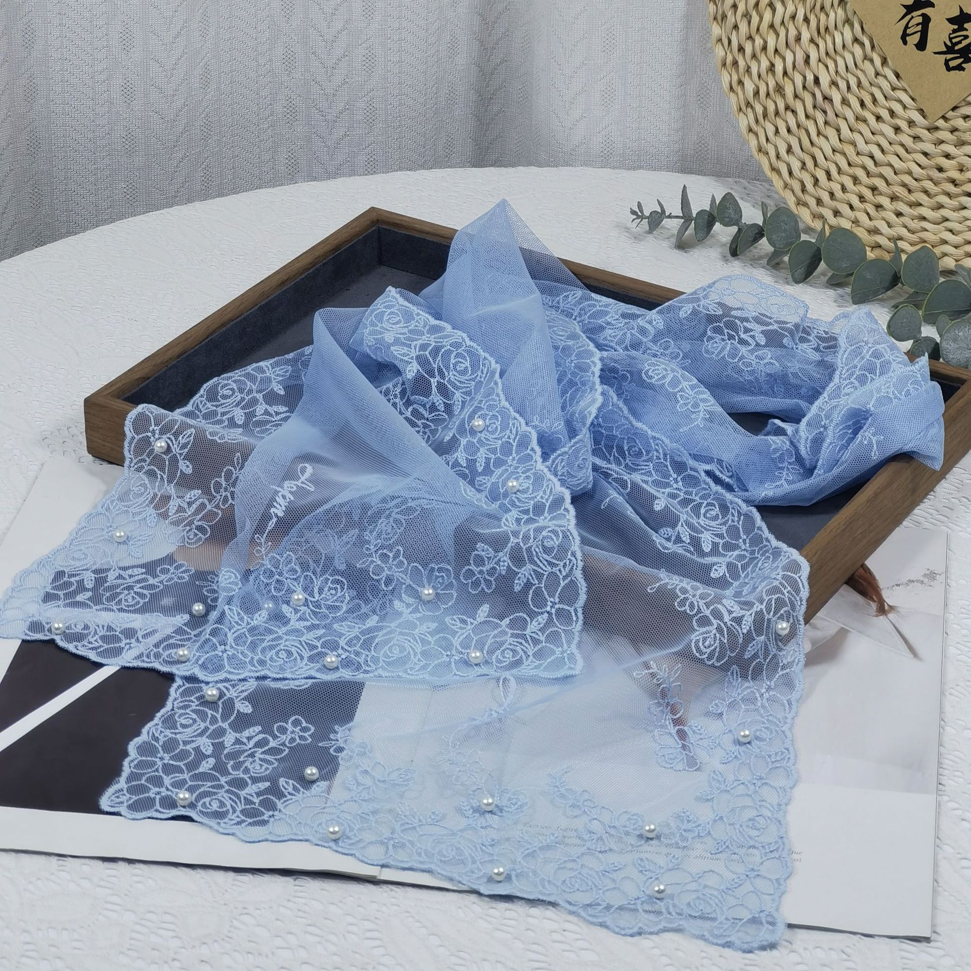 세련된 외부 스카프 리본 얇은 메쉬 실크 스카프 여성 다용도 예술적 입체 자수 진주 레이스 숄 트렌디스토어 가기